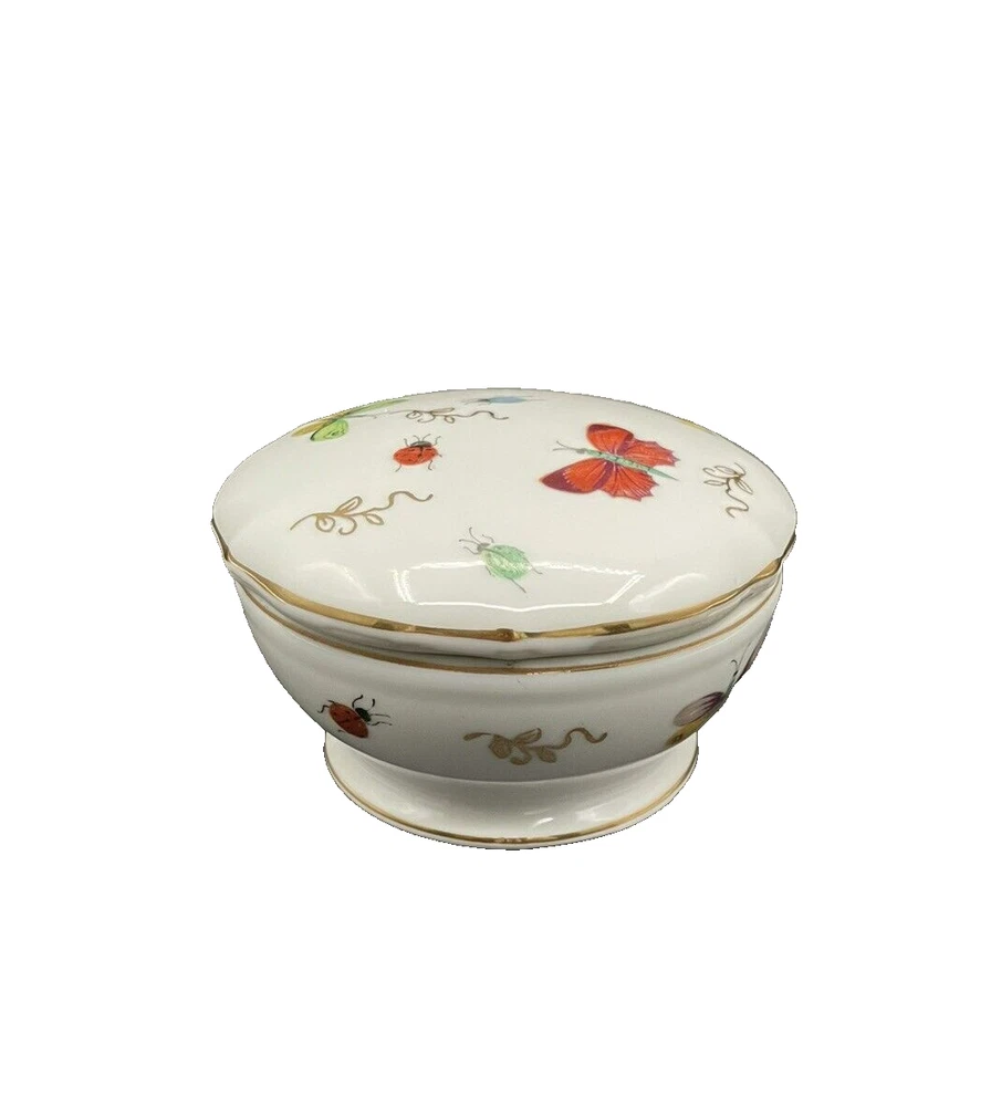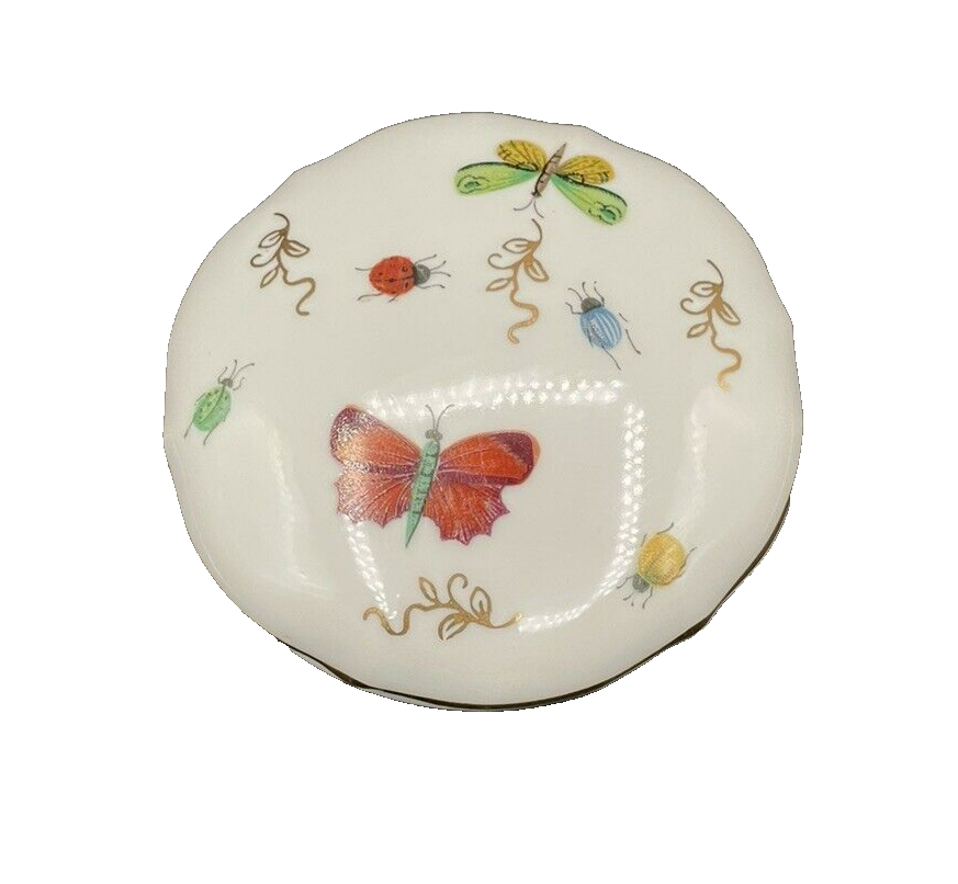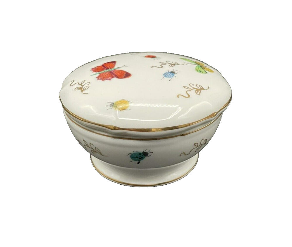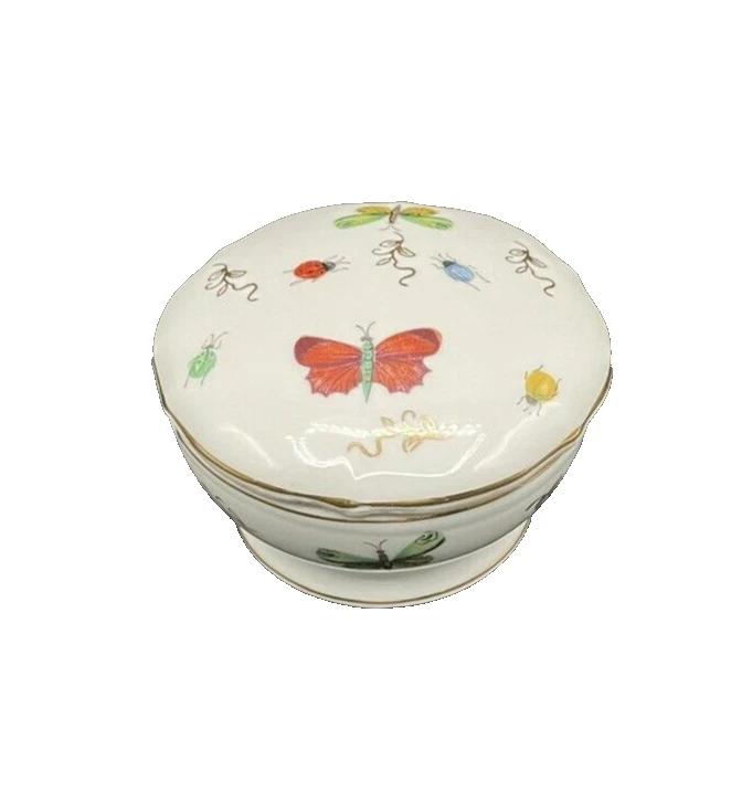 This beautiful trinket dish from Lenville China features a delightful hand-painted design of butterflies and ladybugs. The round shape and medium size make it a perfect addition to any room, suitable for all occasions. The dish is made of high-quality porcelain and should be cleaned with a damp cloth for best care. The Ardalt Imports Japan design is a true masterpiece of the mid-20th century, with intricate details and a stunning multicolor finish. This trinket box is an original, unboxed item that will make a great addition to your collection of decorative collectibles. The dish weighs 6.3 oz and measures 3.75 inches in length and width, with a height of 2.25 inches. It is suitable for furniture and is perfect for storing small items.