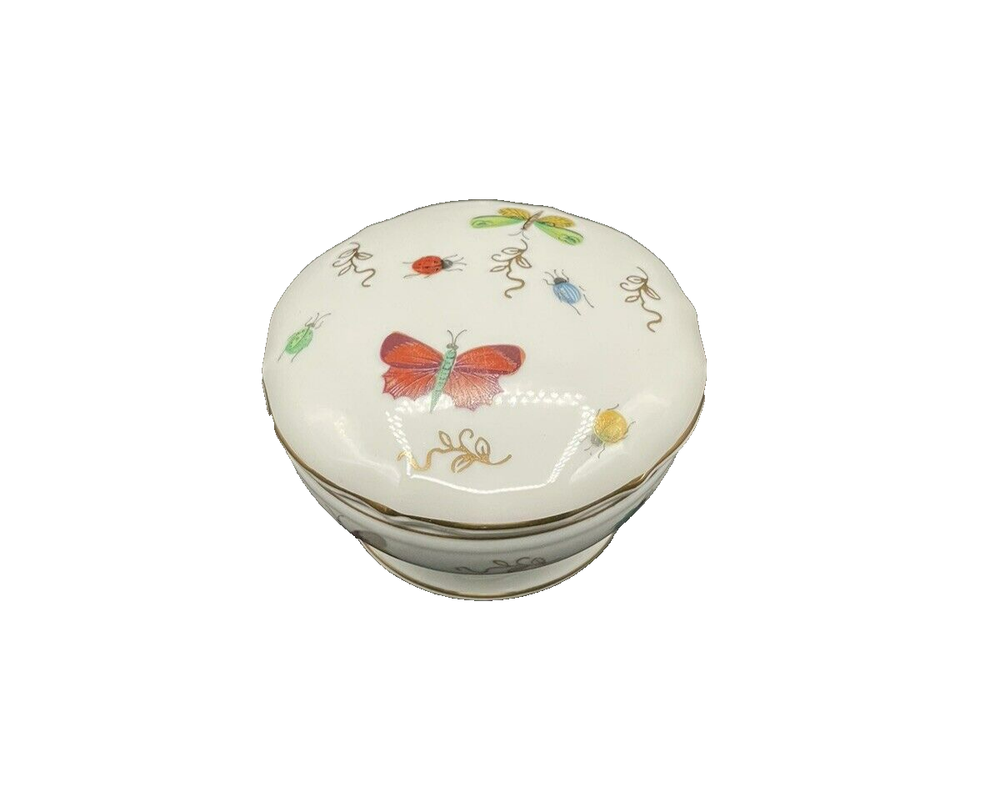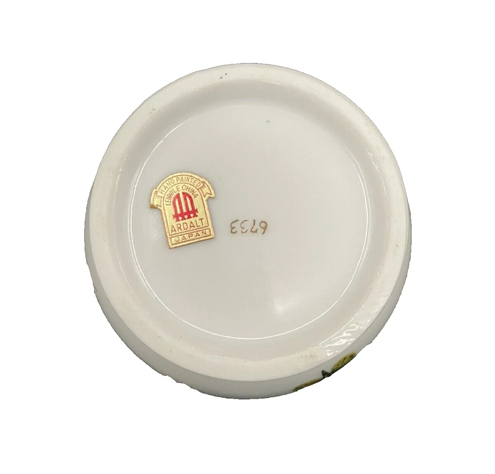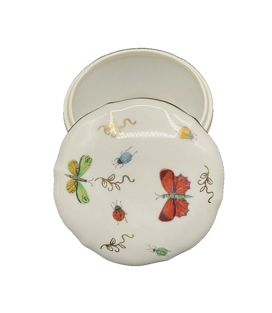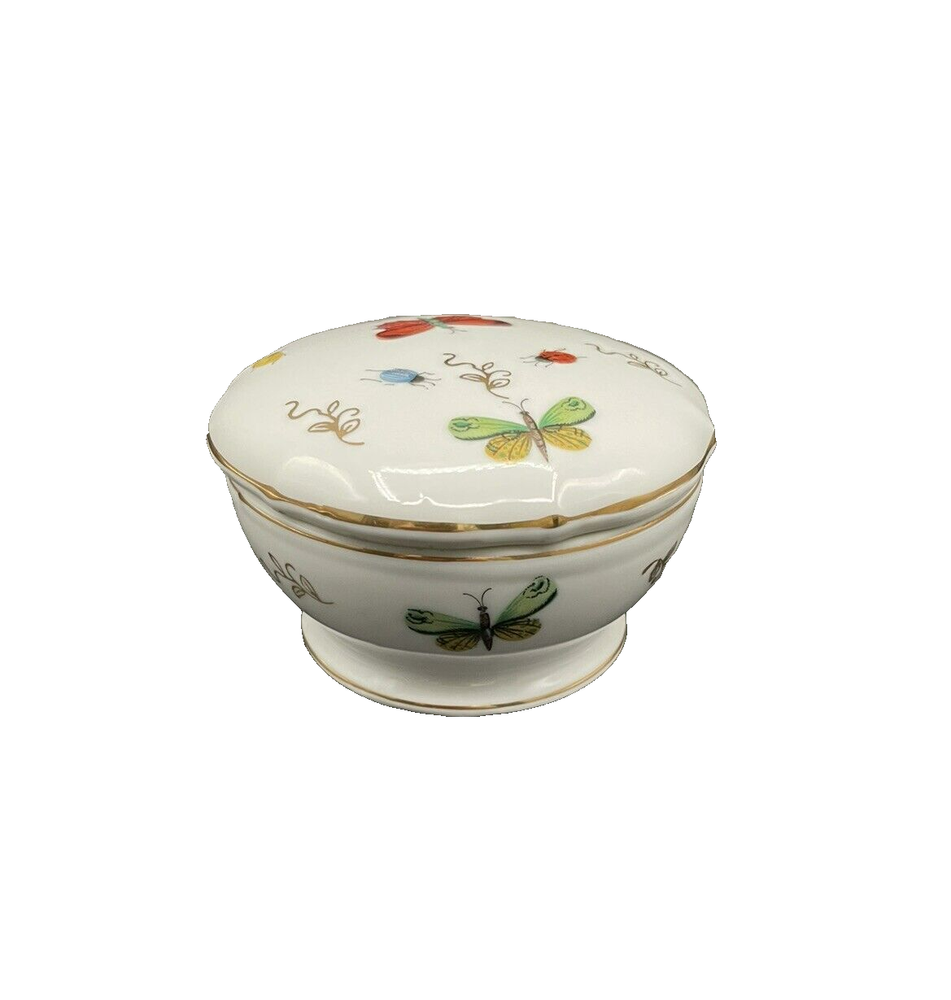 This beautiful trinket dish from Lenville China features a delightful hand-painted design of butterflies and ladybugs. The round shape and medium size make it a perfect addition to any room, suitable for all occasions. The dish is made of high-quality porcelain and should be cleaned with a damp cloth for best care. The Ardalt Imports Japan design is a true masterpiece of the mid-20th century, with intricate details and a stunning multicolor finish. This trinket box is an original, unboxed item that will make a great addition to your collection of decorative collectibles. The dish weighs 6.3 oz and measures 3.75 inches in length and width, with a height of 2.25 inches. It is suitable for furniture and is perfect for storing small items.