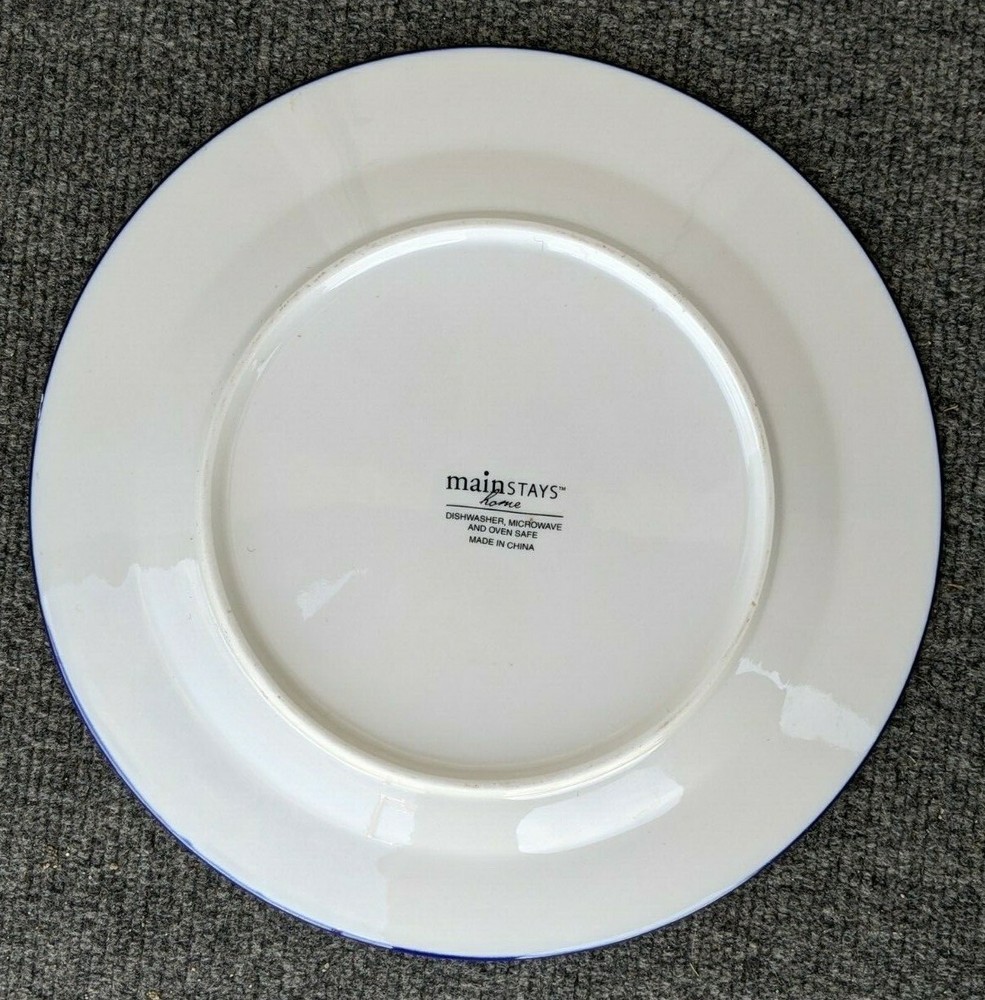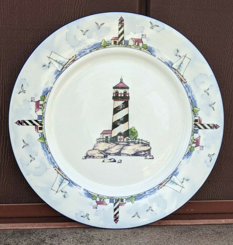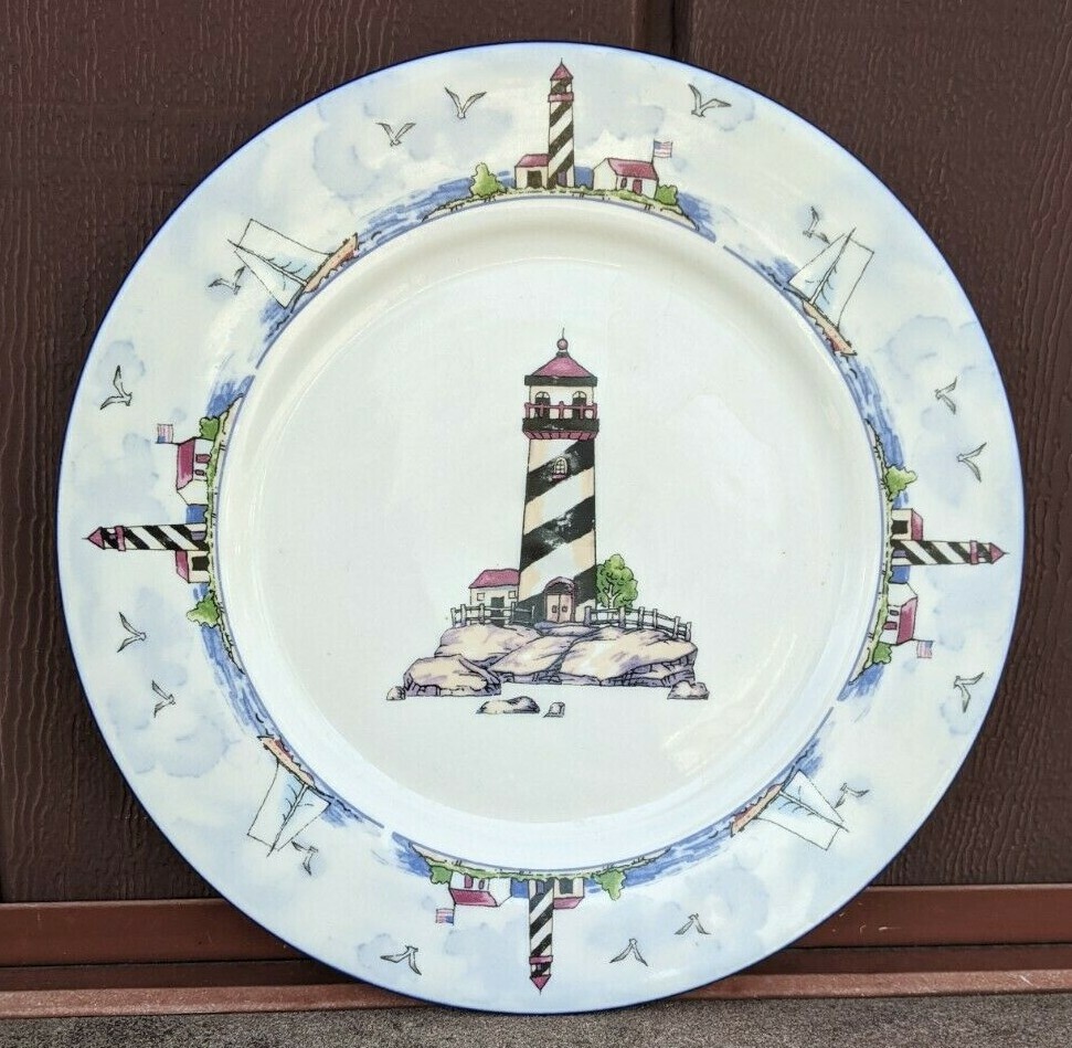 Mainstays Home lighthouse pattern black, blue, red 10 1/2 " dinner plate. No chips, cracks, or crazing, excellent! Discount offered on multiple purchase in dishes, visit my store! Shipping combined. Returns per eBay policy.
