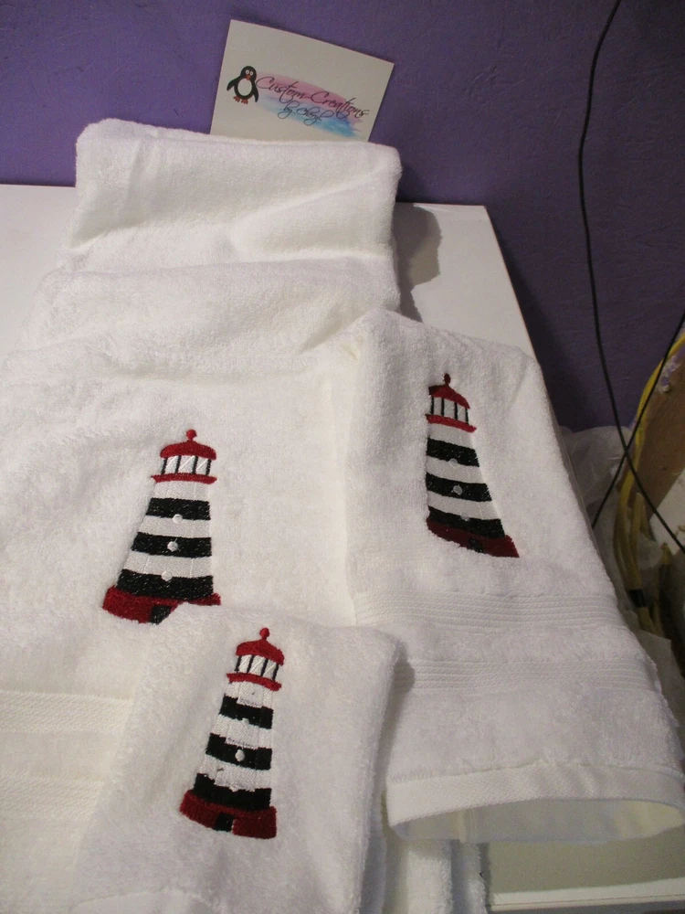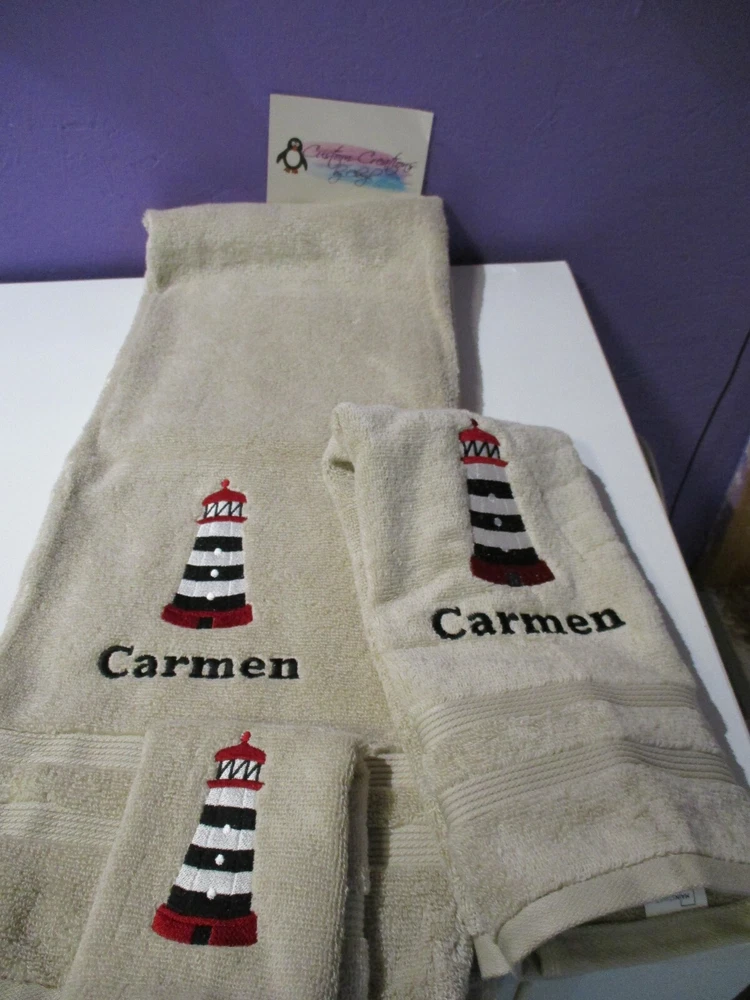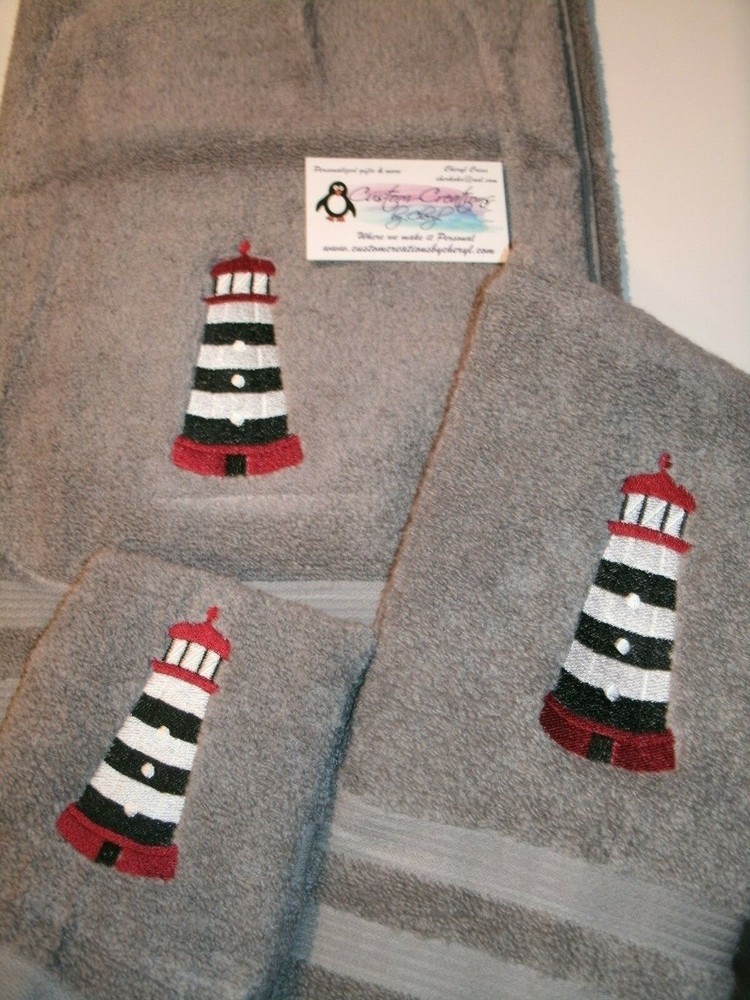 Up for sale on this auction is a really nice PERSONALIZED 3 piece towel set: bath (50 x 26) hand (25 x 16) towel and washcloth combo set. This set is gray towels but I can do any towel, washcloth and or hand towel color that you would like just leave the info in the comment box when you checkout. I have green, purple, yellow, tan, chocolate, pink not fluffy towels, red not fluffy towels, purple not fluffy towels, black, gray, white, navy blue, burgundy red, & royal blue. This design is the Striped Lighthouse with the name of YOUR choice. The washcloth is of the lighthouse. I do have other designs as well. I do have many thread colors to choose from. All of my items are custom made and do come from a smoke free home. I will be more then happy to combine shipping charges. If you do not see a design that you are interested in please ask as I am sure I will have it. Designs range from sports, mascots, kids themes, weddings, teens, and many more.... Please leave the info in the comment box when you checkout. PLEASE LEAVE THE TOWEL COLOR AND NAME YOU WOULD LIKE IN THE MESSAGE COMMENT BOX WHEN YOU CHECKOUT !!! IF NO INFO IS LEFT THEN I WILL USE THE TOWEL COLOR IN THE MAIN PHOTO AS WELL AS THE DESIGN ONLY !!! THANKS FOR LOOKING!!!