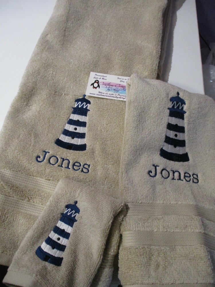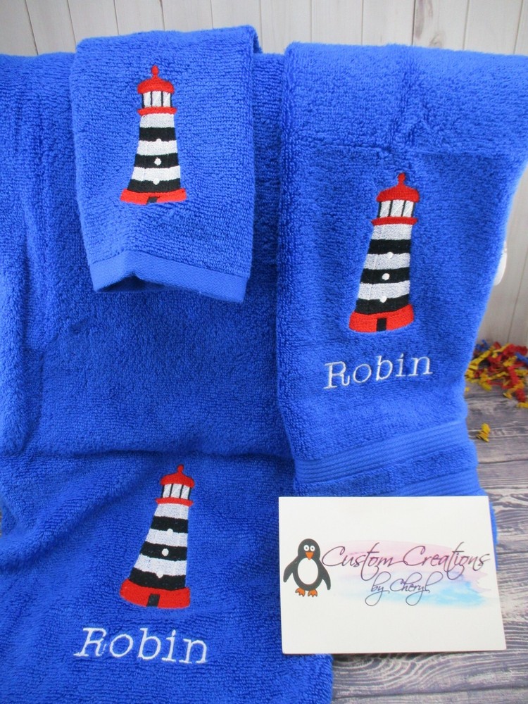 Absolutely love this personalized towel set! The nautical lighthouse design adds such a charming coastal touch to my bathroom. The quality is fantastic—soft, absorbent, and the color options are amazing. Customizing was easy, and the seller was super helpful. Perfect as a gift or to treat yourself! Highly recommend for anyone who loves unique, stylish bath accessories.