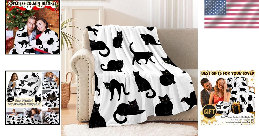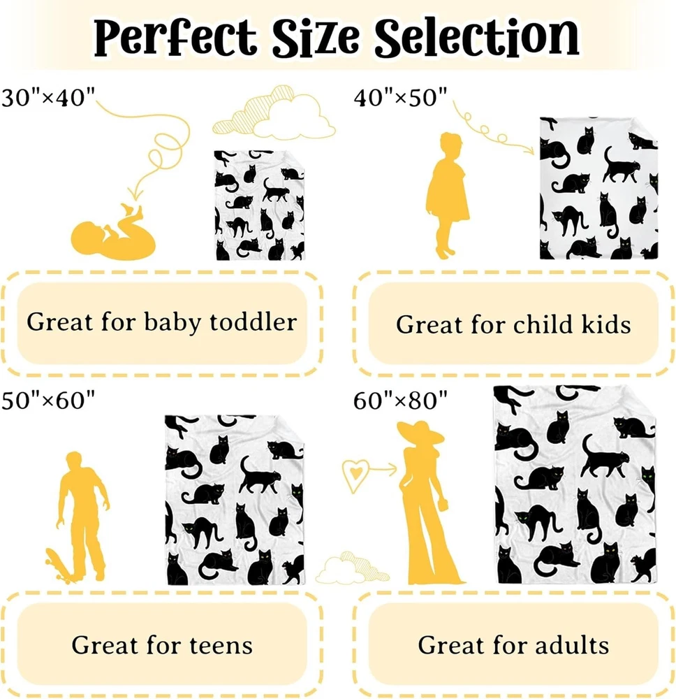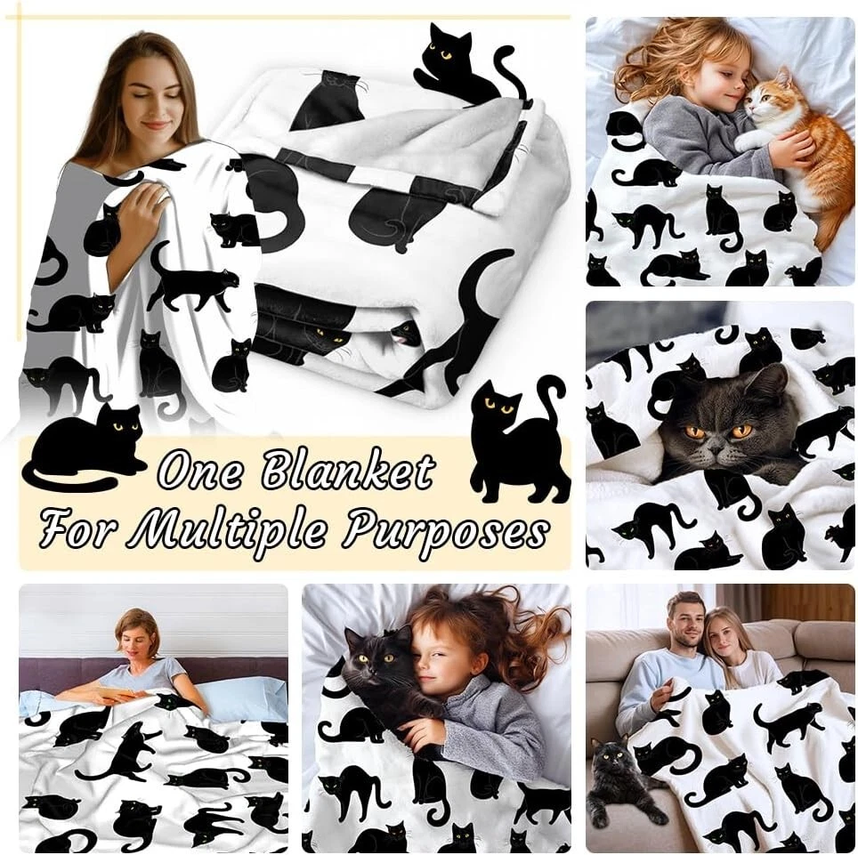 This cozy black cat throw is a must-have—soft, lightweight, and perfect for lounging or travel. The cute cat design adds charm, and it’s machine washable for easy care. The 80x60 size is just right for snuggling up on the couch or bed. Love how versatile and comfy it is!