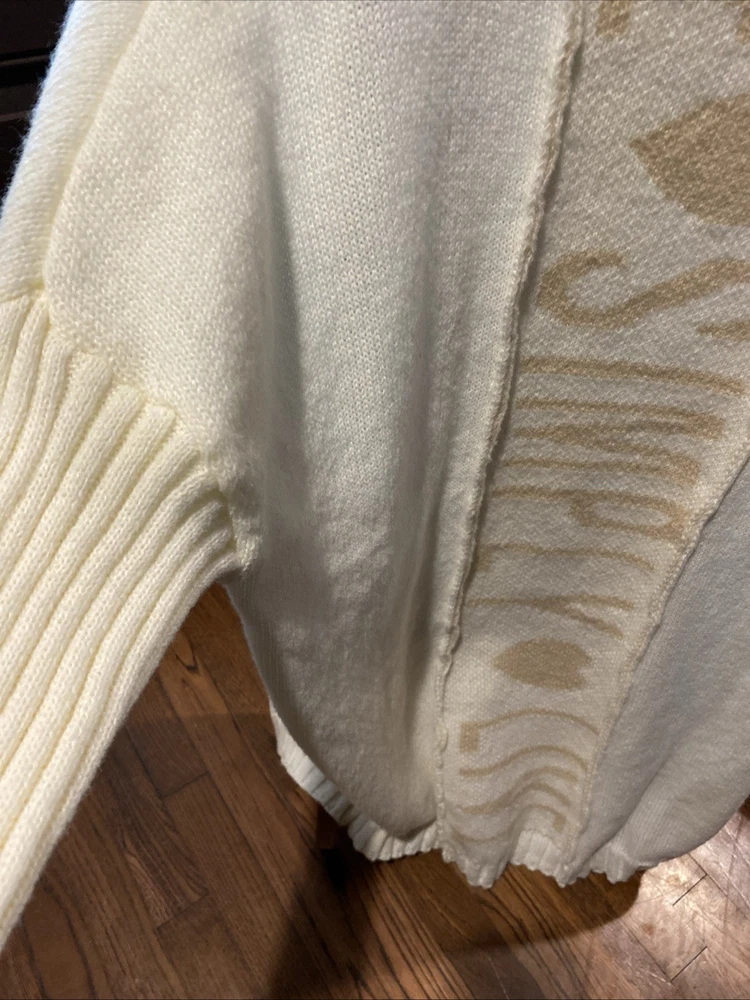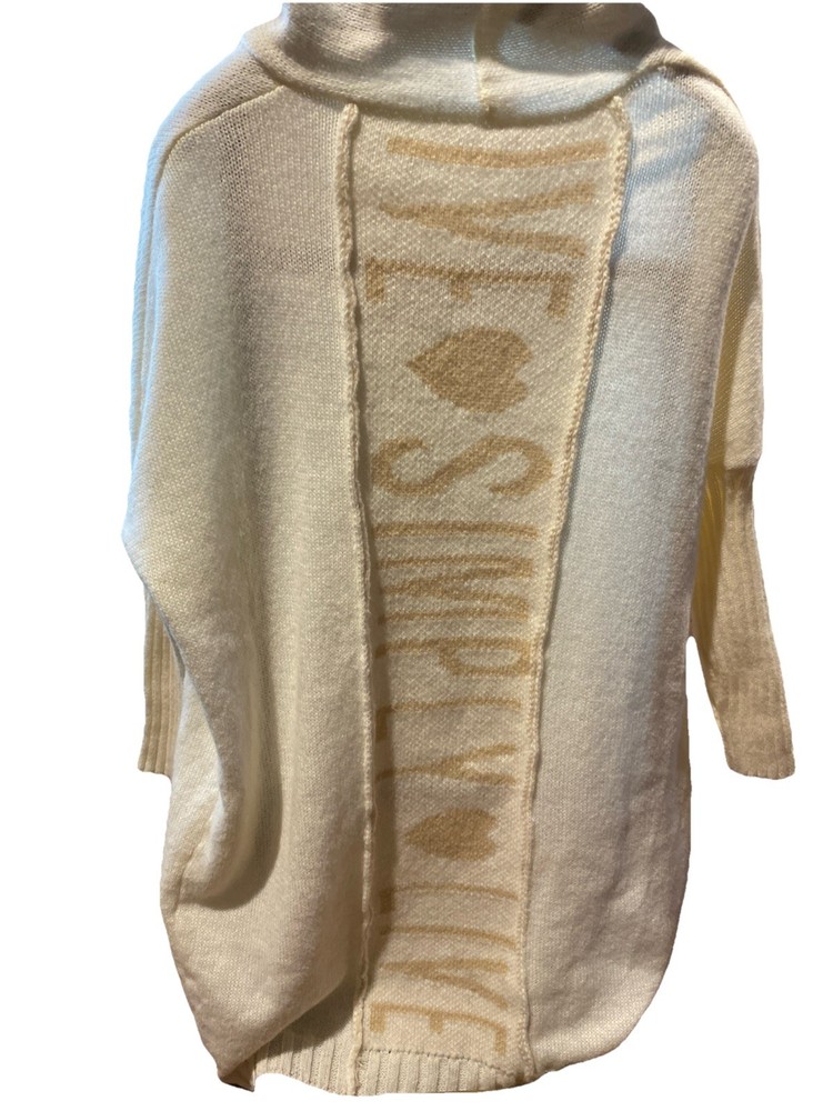 The product is a cozy and stylish cream sweater designed for women in size Large. This oversized sweater features a tight-knit acrylic material, making it a comfortable and soft option for everyday wear. The cream color and love theme add a touch of warmth and sentimentality to the sweater, making it a versatile addition to any wardrobe. Perfect for those who appreciate a simple yet chic clothing style.