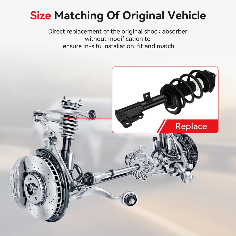 Fittment: 2011-2019 Dodge Journey V6 3.6L 2009-2010 Dodge Journey V6 3.5L Description: Complete struts with spring & mounts assembly, including Strut, Coil spring (when applicable), Strut mount, Boot, Bumper Kit, Spring seat and Isolator. Manufactured from top quality components Direct fit , no special tools requir. Fast Shipping. Warehouses in the East and West. Professional for you to answer the very common problems of shock absorbers; Welcome to collect money after sale consultation!? The hazard of a broken complete strut/shock absorber: Loaded For Dodge Journey 2009-2019 Front Complete Struts Shocks Springs & Mount Fittment: 2011-2019 Dodge Journey V6 3.6L 2009-2010 Dodge Journey V6 3.5L Description: Complete struts with spring & mounts assembly, including Strut, Coil spring (when applicable), Strut mount, Boot, Bumper Kit, Spring seat and Isolator. Manufactured from top quality components Direct fit , no special tools requir. Fast Shipping . Warehouses in the East and West. Professional for you to answer the very common problems of shock absorbers; Welcome to collect money after sale consultation! ? The hazard of a broken complete strut/shock absorber: When driving, if the shock absorber assembly of the car wears out, the car may vibrate up and down , bump back and forth , shake left and right , and the front of the car will sway. As a result, the car will deviate to the outside of the curve when the car is making a sharp turn. Trend: When the turning radius of the car is large, the sense of direction is inaccurate, and the car has a tendency to sway; when the car passes on a bad road, the steering wheel can clearly perceive the front suspension vibration significantly increased; when the road is convex, the driver and passengers can feel dull The impact noise; the beating of the wheels when accelerating, resulting in slow acceleration and other problems. How to check if the shock absorber is damaged: Oil leakage : Check the shock absorber through the wheel arch with a flashlight. When oil leakage is found outside the shock absorber, it indicates that the shock absorber has been damaged. Abnormal noise : If the shock absorber makes an abnormal noise when the vehicle is driving on a bumpy road section, it is most likely that the shock absorber has been damaged. Uneven tire wear : When the shock absorber is broken, the wheel will vibrate unevenly during driving. This will cause the wheels to tilt, which will cause serious wear on the part of the tire that touches the ground, while the untouched tires will not be affected, resulting in uneven wear over time. Press the bumper firmly and then release it. If the car jumps 2 or 3 times, it means that the shock absorber is working well. If you keep nodding your head up and down and bow your waist, it will be broken if it looks very elastic. How to Change: Installation Steps: First step 1. Remove the tire, and place the removed tire on the ground steadily, with the outside side facing up, and put the tire screw on the tool c art 2. Gradually remove the connecting rod screws, brake hose screws, and brake ABS cable. After removing the screws, arrange them and place them on the tool cart (Note: Be careful not to damage the oil pipe and ABS cable) 3. Remove the half shaft nut and remove the automatic system. (Note: Fix the calipers reasonably and do not damage the tubing) 4. Remove the direction lever (note: use a special tool to remove the ball head 5. Remove the vehicle height sensor (note: remove carefully, do not damage) 6. Remove the ball head of the lower control arm 7. Remove the upper connecting bolts, and take out the shock absorber assembly and steering knuckle assembly together. (Note: Two people are required to cooperate to avoid damage to related parts after replacement) Second step 1. The shock absorber assembly of the original car has been disassembled, and the new shock absorber assembly has been replaced. 2. Take out the new shock absorber assembly and compare it with the old one before installing it. 3. Install the new shock absorber assembly on the steering knuckle assembly 4. Assemble the shock absorber assembly and steering knuckle assembly back to the vehicle together. Third Step 1. Restore the ABS cable, tubing, and tie rod to their original positions. 2. Restore all the automatic systems, and carefully check the oil pipes and other lines for interference. 3. Assemble the tire to the car (Note: carefully tighten the tire bolts) Frequently Asked Questions: What shocks and struts do? They keep the tires from bouncing which causes loss of road contact and they also keep the vehicle body weight from shifting and rolling which causes a loss of vehicle control and handling. You could say then, that their main job is to resist both tire and vehicle body motion. When shocks and struts are working well, the vehicle maintains traction on the road and has the optimum stability in every driving condition: stopping, turning, swerving, over bumps and potholes. How do they do that? A shock or a strut operate the same but mount differently. Each of the four tires has either a shock or strut connected to that corner’s suspension and vehicle body or frame. They are hydraulic cylinders that provide motion damping by restricting fluid flow through a series of internal valves. As the wheel and body moves up and down, the shock valving slows and stabilizes the movements. How many miles do shocks and struts last? The life of shocks and struts depend on the road conditions the vehicle drives on, the weight of the vehicle and environmental conditions. Some vehicles; such as SUVs and Vans, are very heavy in the front and can wear out suspension components in 50,000 t0 75,000 miles . Vehicles driven in northern climates will wear out quickly due to road salt and potholes created from icy conditions. Delivery vehicles carrying heavy loads will wear out springs and suspension components quickly. So, mileage is not always the best way to estimate how