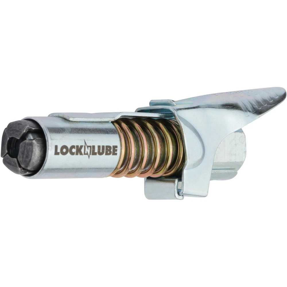 Free eBay listing template designed by dewiso.com LockNLube® Grease Gun Coupler Locks onto Zerk fittings. Grease goes in, not on the machine. World's best-selling original locking grease coupler. Rated 10,000 PSI. Long-lasting rebuildable tool. End greasing frustration with the original locking grease coupler! Locks on, stays on, won't leak. Rated up to 10,000 PSI Easily disconnects, even under pressure. No more broken Zerks 1/8" NPT compatible with all grease guns - battery, pneumatic, manual Grease goes in, not on, the machine Works on all Zerk fittings, SAE and metric Includes a spare rebuild kit! The LockNLube® is the world's only rebuildable grease coupler. Lowest lifetime cost. Patented Locking Technology. US Patent #8955544 As seen on TruckU on the Motortrend Channel! The original locking grease coupler, don't settle for copycats! Hands-free, no mess, and no wasted grease! Includes a free rebuild kit. Rated to 10,000 PSI. Perfect for recessed fittings. Easily disconnects, even under pressure. No more broken Zerks. LOCKS ON, STAYS ON, WON'T LEAK—LIKE HAVING AN EXTRA HAND! No need to hold the coupler in place while trying to grease your machinery. The LockNLube Grease Coupler locks on tight and lets you use both hands on your grease gun. THE ONLY REBUILDABLE LOCKING COUPLER: We include a spare rebuild kit! It's like getting two couplers for the price of one. 1/8" NPT COMPATIBLE WITH ALL GREASE GUNS - BATTERY, PNEUMATIC, MANUAL: Whether you are using Grandpa’s old Alemite lever grease gun, or the latest battery or pneumatic grease guns, the LockNLube Grease Coupler can be added to upgrade your grease gun. WORKS ON ALL ZERK FITTINGS, SAE & METRIC with a full lineup of adapters to reach any grease fighting on any machine! EASY TO USE: Press the thumb lever to open the LockNLube’s patented jaws and attach to the Zerk. Release the thumb lever and the LockNLube locks on tight! Press the thumb lever again to easily release from the Zerk, even under pressure! RATED UP TO 10,000 PSI BEST BUILT GUARANTEE: The LockNLube Grease Coupler is covered by our unconditional 1-year warranty Key Specs MAX PRESSURE 10,000 psi (690 Bar). Locks on, stays on, won't leak. ZERK COMPATIBILITY The Floating Jaws allows the LockNLube Grease Coupler to adapt to all DIN and SAE specification Zerks (grease nipples). COUPLER THREAD ⅛” NPT female thread compatible with all grease guns - battery, pneumatic, manual DIMENSIONS L: 3½ x W: 5/8 x H: 1⅗ In (L: 88mm x W: 16mm x H: 41 mm) DIAMETER (FRONT OF COUPLER) 5/8 in (16 mm). Fits most recessed grease fittings (Zerks). ~1mm larger than a standard coupler WEIGHT 4 oz. (100 grams) GREASE GUN COMPATIBILITY Works with all grease gun types: pneumatic, manual, and electric. SEAL Durable nitrile rubber seal for longevity under high-pressure LOCK-ON MECHANISM Four hardened steel jaws are resilient under high pressure. Patent protected. PATENT US Patent #8,955,544