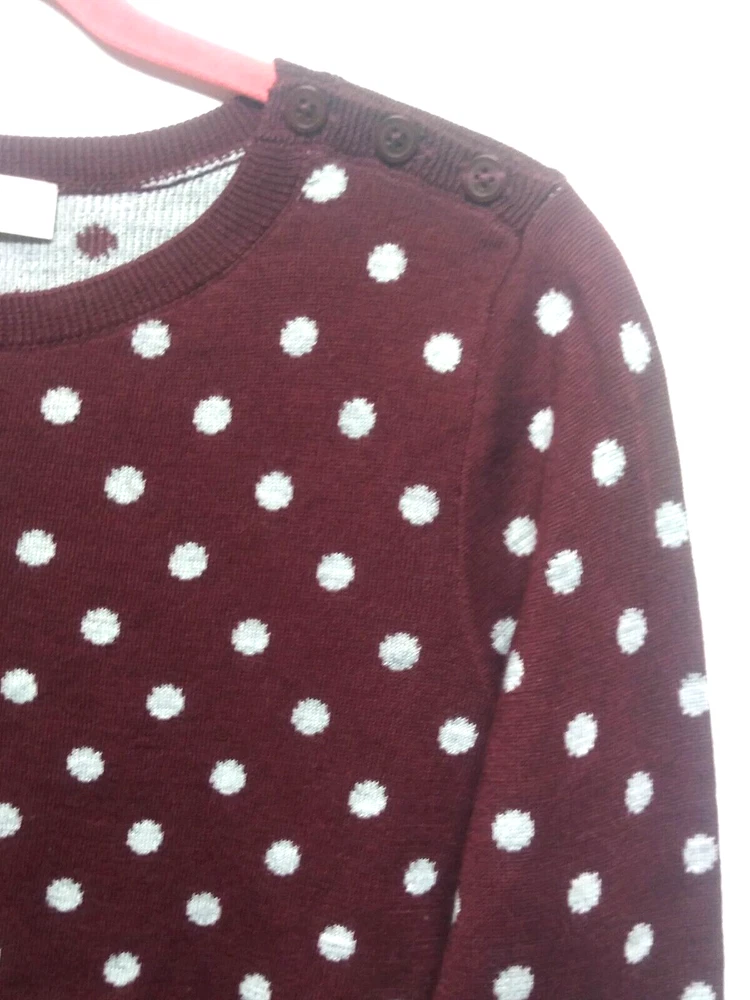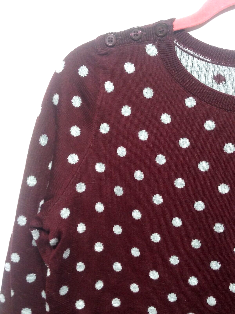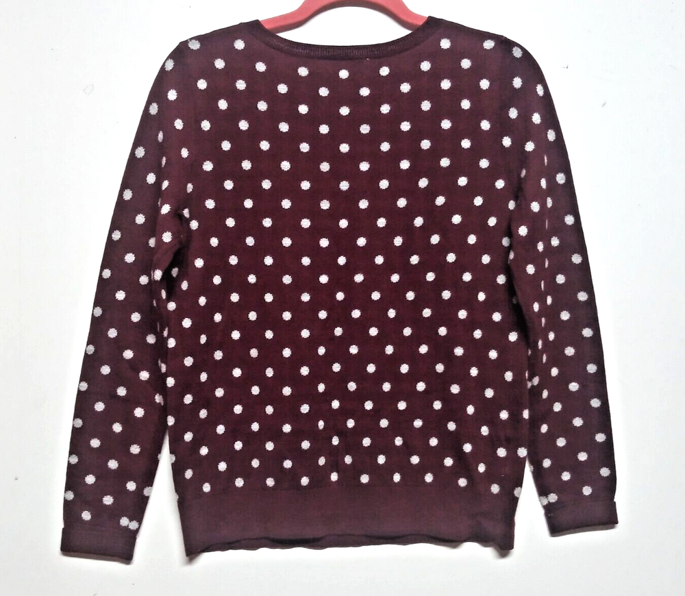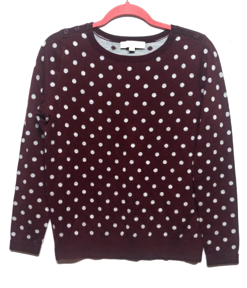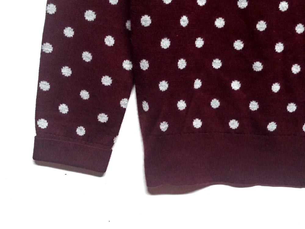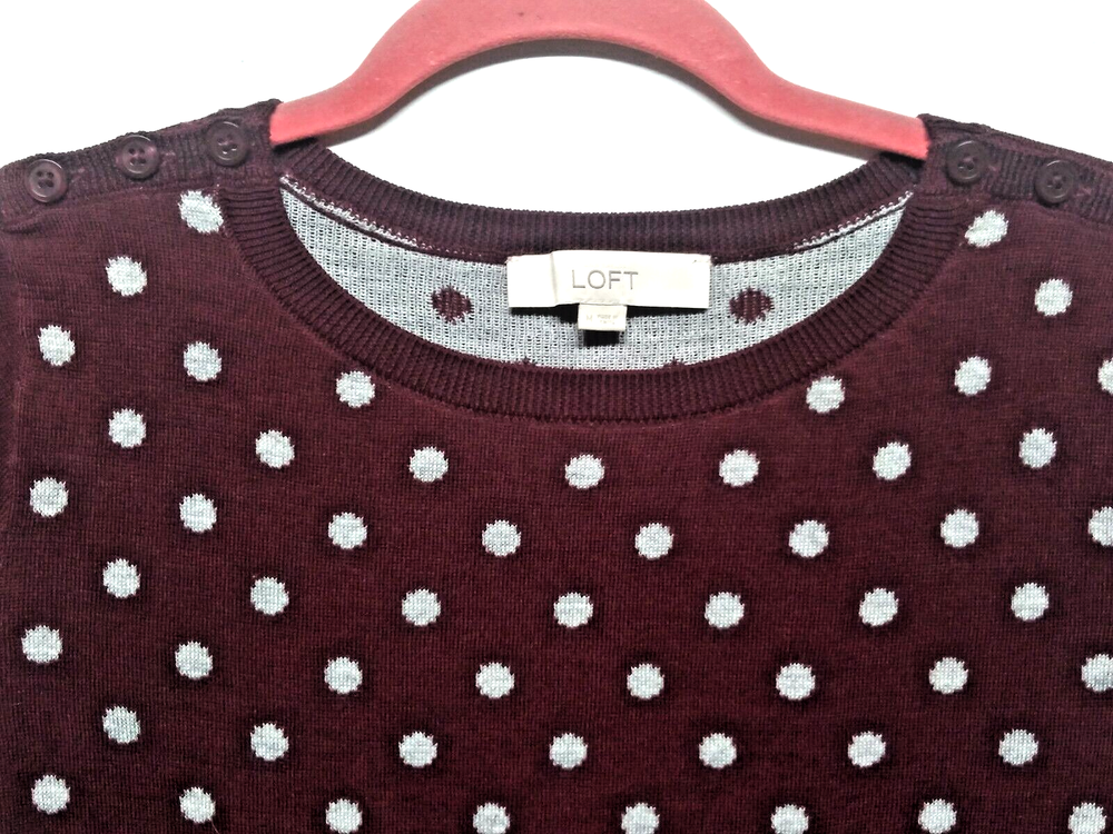 Stunning Vintage Burgundy & White Polka Dot sweater pullover by LOFT, with button accents on shoulders, round neck, long sleeves. W ool acrylic and polyester blend, very soft, thick and stretchy knit fabric. Will keep you warm and cozy while looking chic and stylish. The maroon color with gray polka dots is eye-catching and the accent buttons on the shoulder add a touch of uniqueness. Machine washable and easy to care for. Perfect for any occasion. Excellent preowned condition - no rips/stains/pilling. measurements taken laying flat without stretching:- Check and compare with your own before purchase. shoulder to shoulder - 15" armpit to armpit - 19" length - 23" b100