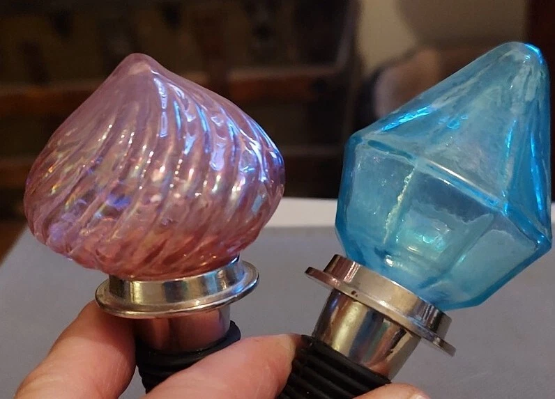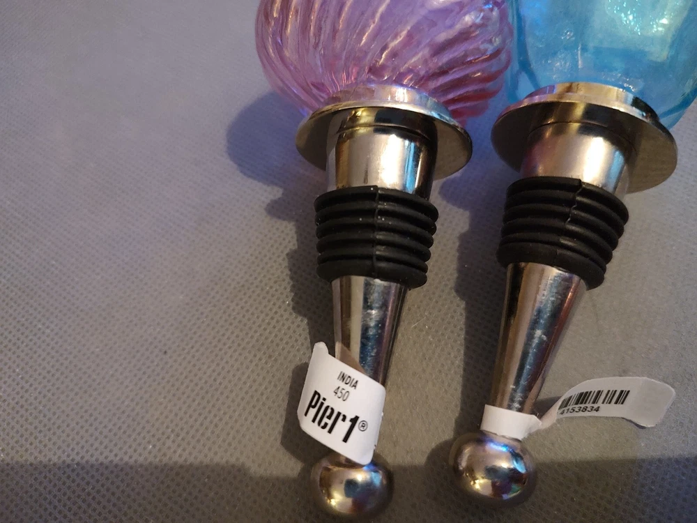 Add a touch of art to your wine collection with these beautiful glass bottle stoppers from Pier 1 Imports. The set includes two stoppers with stunning blown blue and pink designs, perfect for any occasion. Made of high-quality glass, these stoppers are both leak-proof and washable. Crafted in India and with a country chic style, these bottle stoppers are a must-have accessory for any wine enthusiast. Whether you are hosting a party or simply enjoying a glass of wine at home, these stoppers will add a pop of color and elegance to your drinkware collection.