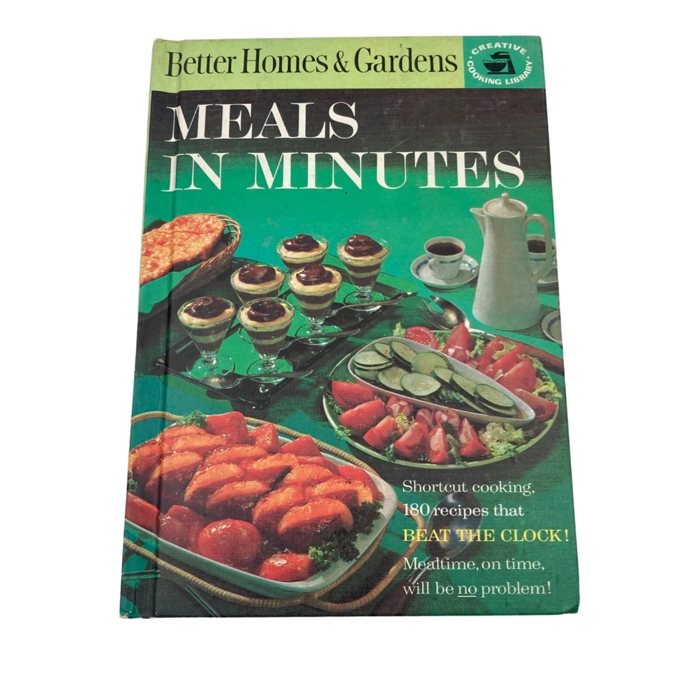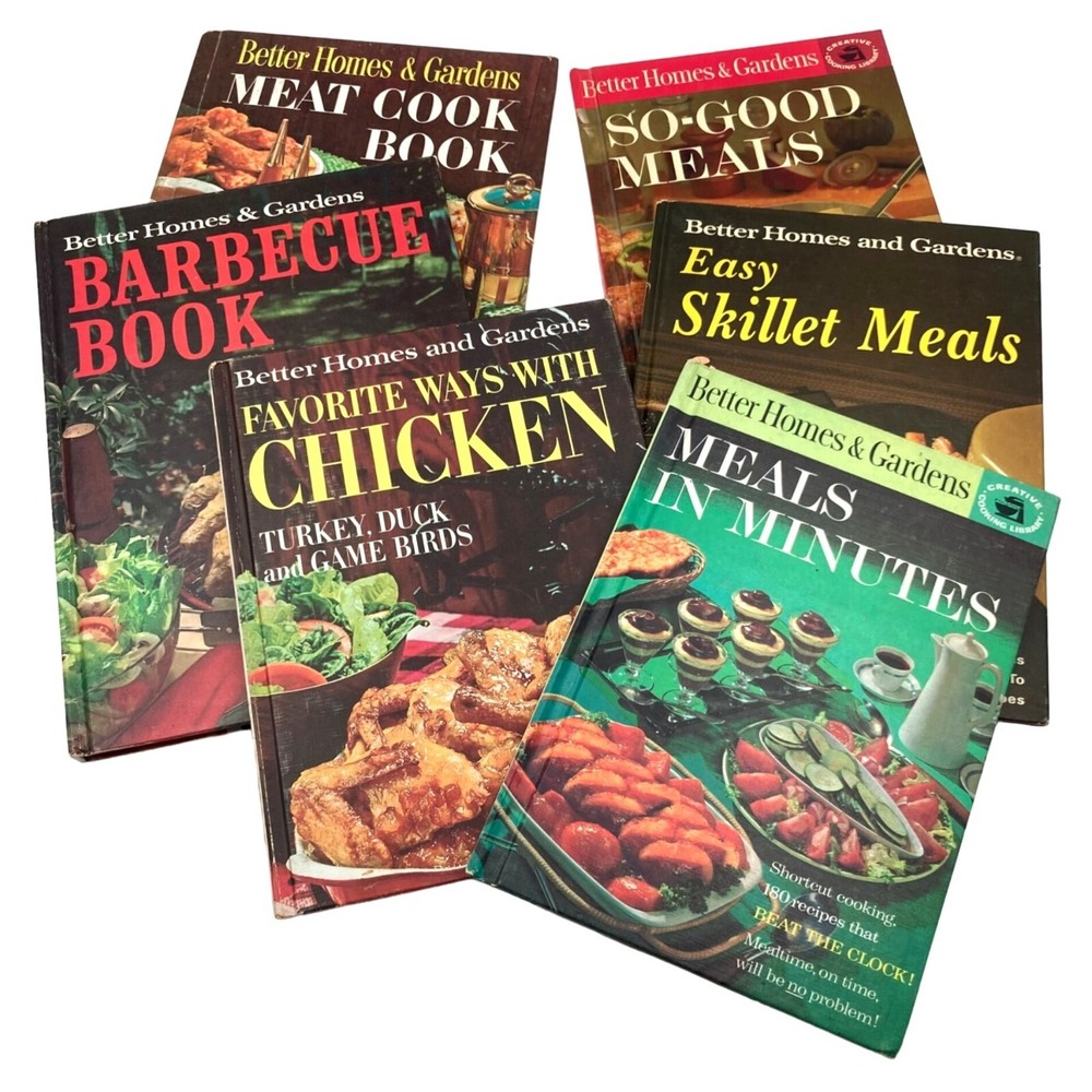 Lot 6 Vintage Better Homes & Gardens Cookbooks from the 1960s 1970s Hardcover Creative Cooking Wonderful lot of six (6) vintage hardcover cookbooks from Better Homes & Gardens, a great addition to any cook's library with delicious recipes and helpful instructions with the added charm of a nostalgic look at the past. PRODUCT INFORMATION: • Set includes the following titles: Easy Skillet Meals (1972), So-Good Meals (1963), Meals in Minutes (1963), Favorite Ways With Chicken (1968), Barbecue Book (1969), Meat Cook Book (1968) • Cookbooks vary in size with the largest book measuring 8.25" long, 11" tall, and 0.5" deep. • Made in U.S.A. CONDITION: Pre-Owned Lovely vintage condition, with expected evidence of age and use. These cookbooks have spent time in working kitchens and show wear in the form of fading or discoloration to covers and pages. MEALS IN MINUTES has some writing in the front inside cover, and FAVORITE WAYS WITH CHICKEN has yellowing or discoloration on the edges of its pages and a few small page rips. Please see all photos for detailed views and best representation of condition. Feel free to contact us with any questions you might have before you buy/bid. SHIPPING and HANDLING Our handling time is THREE (3) BUSINESS DAYS, and we ship packages Monday - Friday (with the exception of holidays). Our shipping fees are calculated based on weight and dimensions. ITERUM EMPORIUM Thank you for shopping our emporium! We would love to serve you again, so save/favorite/like our store and visit us again to see new items, listed regularly.