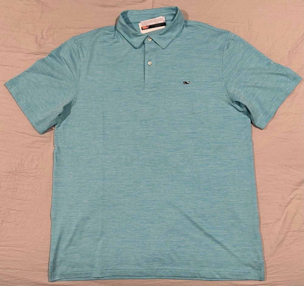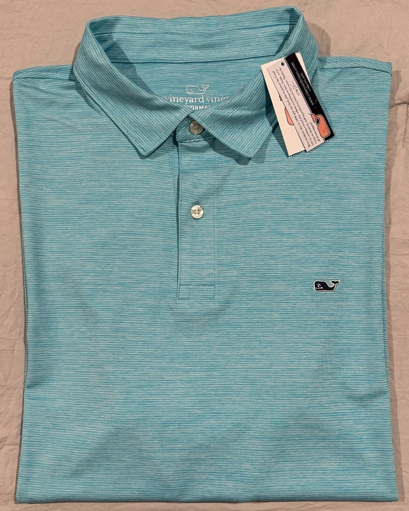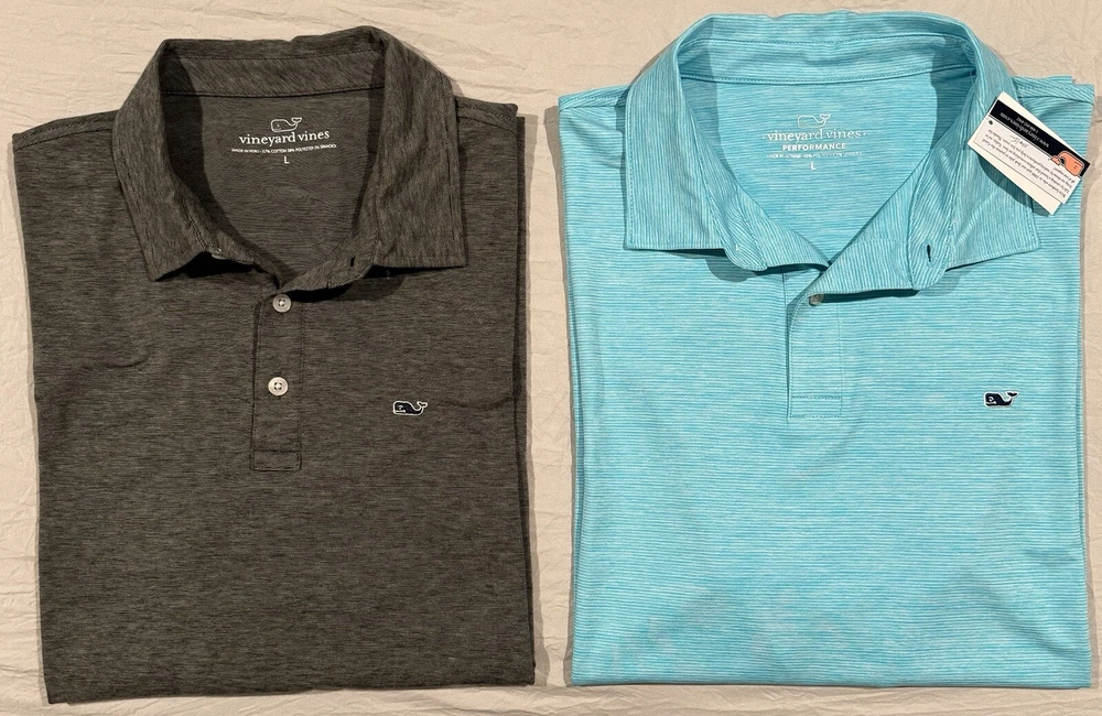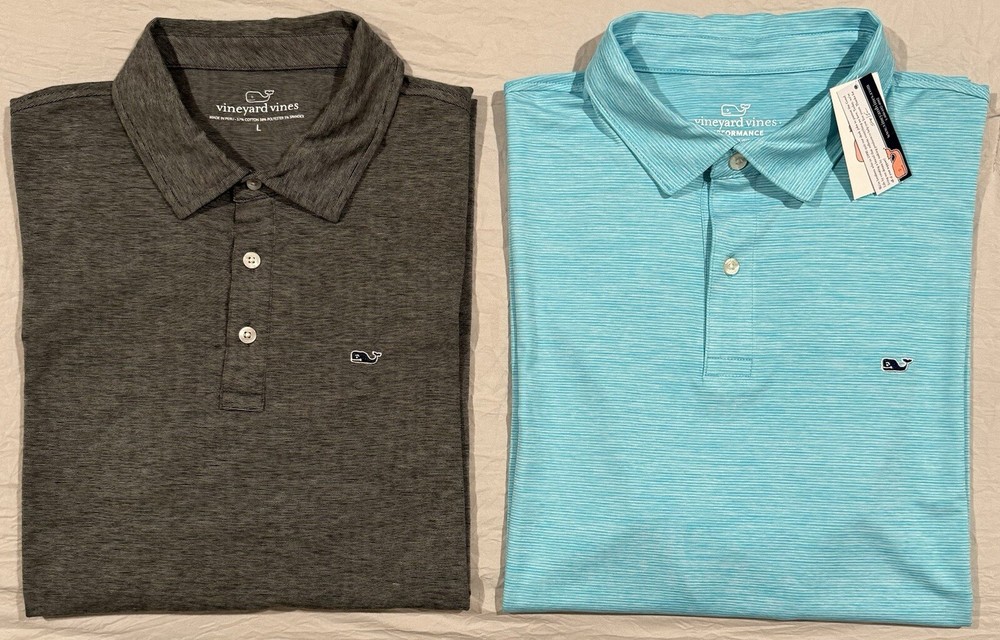 Listing includes two polos! Vineyard Vines Performance St. Jean Sankaty Polo NWT Retail 98$ Our signature Sankaty Polo is packed with performance features and benefits like UPF 50 sun protection, built-in stretch and moisture wicking properties. Features & Care Fabric · 92% polyester, 8% spandex Features · Lightweight performance fabric · Classic fit · Built-in stretch · UPF 50 protection · Quick-drying and moisture wicking · Wrinkle resistant · Built-in interior collar stays · Whale logo embroidered on chest Vineyard Vines Edgar Polo NWOT Retail 95$ Fabric · 53% cotton, 42% polyester, 5% spandex Features · Made from our supersoft, wicking & breathable Edgartown fabric · Built-in stretch · Whale logo embroidered on chest Pit to pit 22-23 inches Length 31.5 inches NEW with AND with out tags Excellent condition No flaws 193$ value Sold as seen in pics