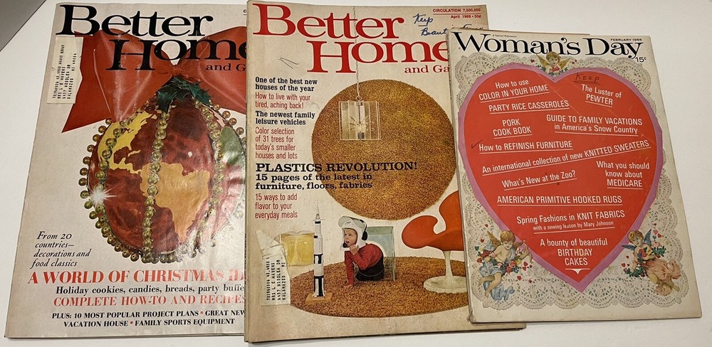 Lot Of 3 Better Homes and Gardens Magazines And Woman’s Day 1960’s Christmas. This is a great lot of 3 1960s magazines, the 1969 issue of Better Homes and Gardens has some great designs in the “new” plastic furniture, wallpaper and flooring designs. Great ads! Two of the magazines have a little writing on the front cover. They are in good condition, but they are old! Lot 3-F