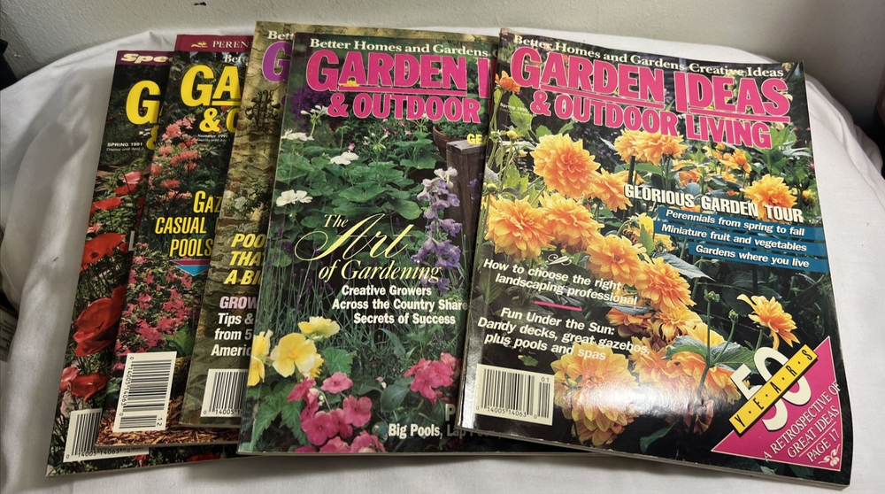 T his lot includes five issues of Better Homes & Gardens magazine, featuring a variety of garden ideas and outdoor living spaces. The magazines span from 1987 to 1991 and have great reference material. The authors are mixed, and the publisher is Meredith Corporation. The original language of the magazines is also English. The topics covered in these magazines are primarily about gardens and outdoor living spaces, making them a great addition to any garden enthusiast's collection. 1987 Summer 1988 Spring 1990 Spring 1991 Summer 1991