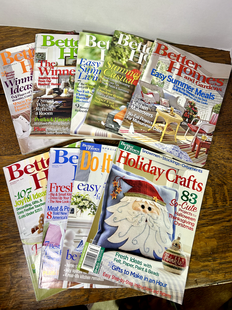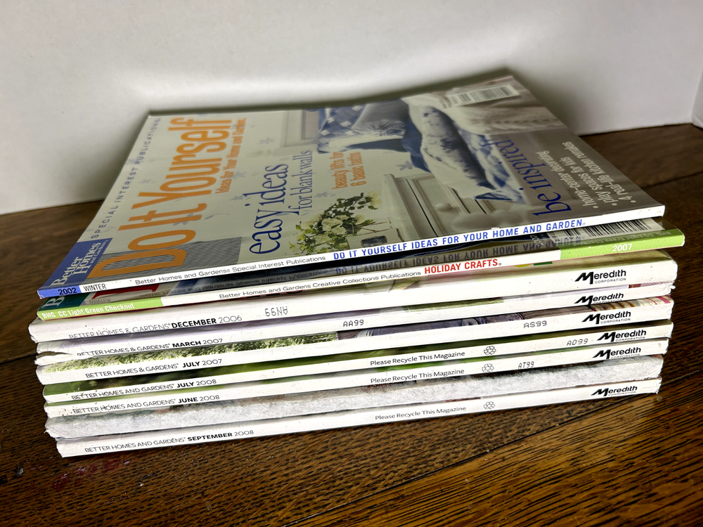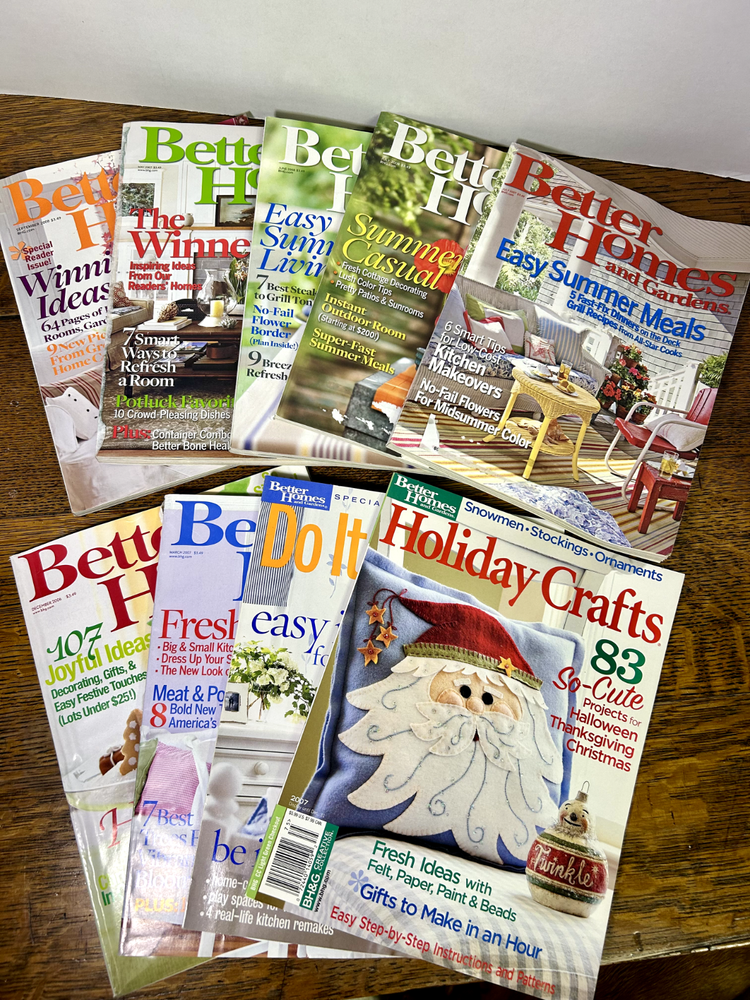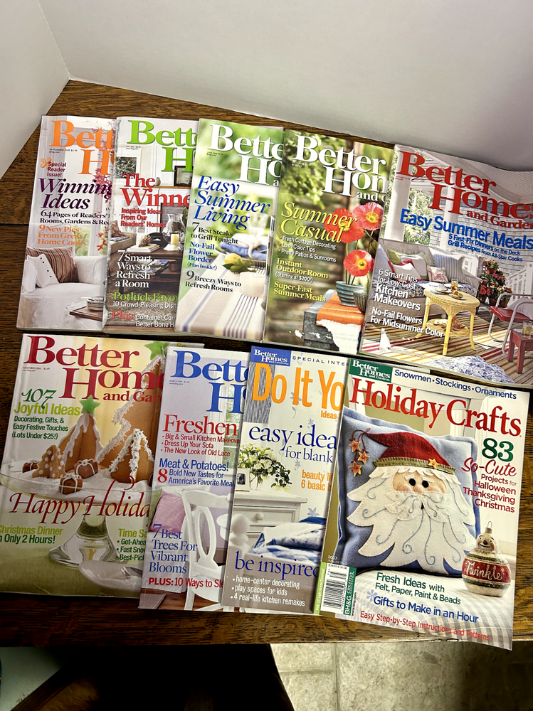 Nine Better Homes and Gardens magazines from: December 2006 March 2007 May 2007 July 2007 June 2008 July 2008 September 2008 Holiday Crafts 2007 Do It Yourself Winter 2002 All in good to very good shape. Spine is slightly torn on one. Blemish on several covers where address label was. Smoke free home. See photos for details.
