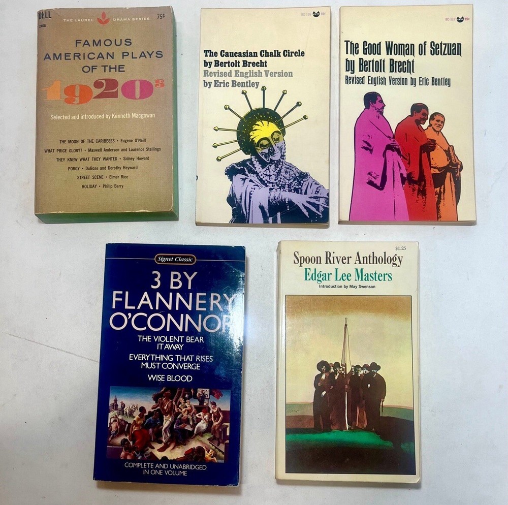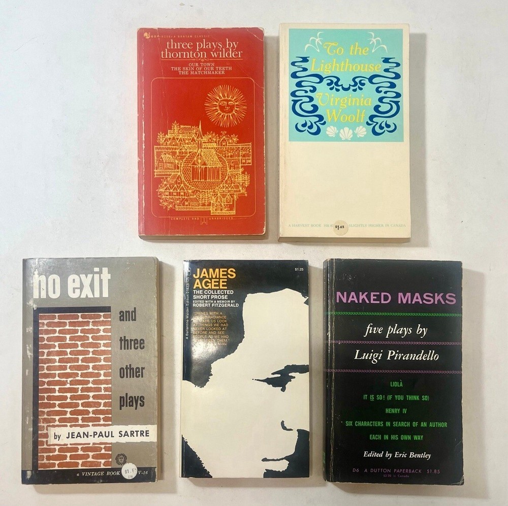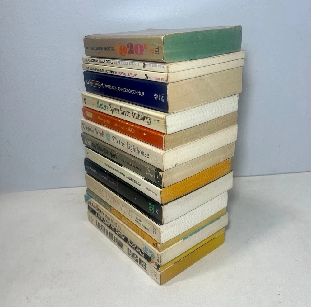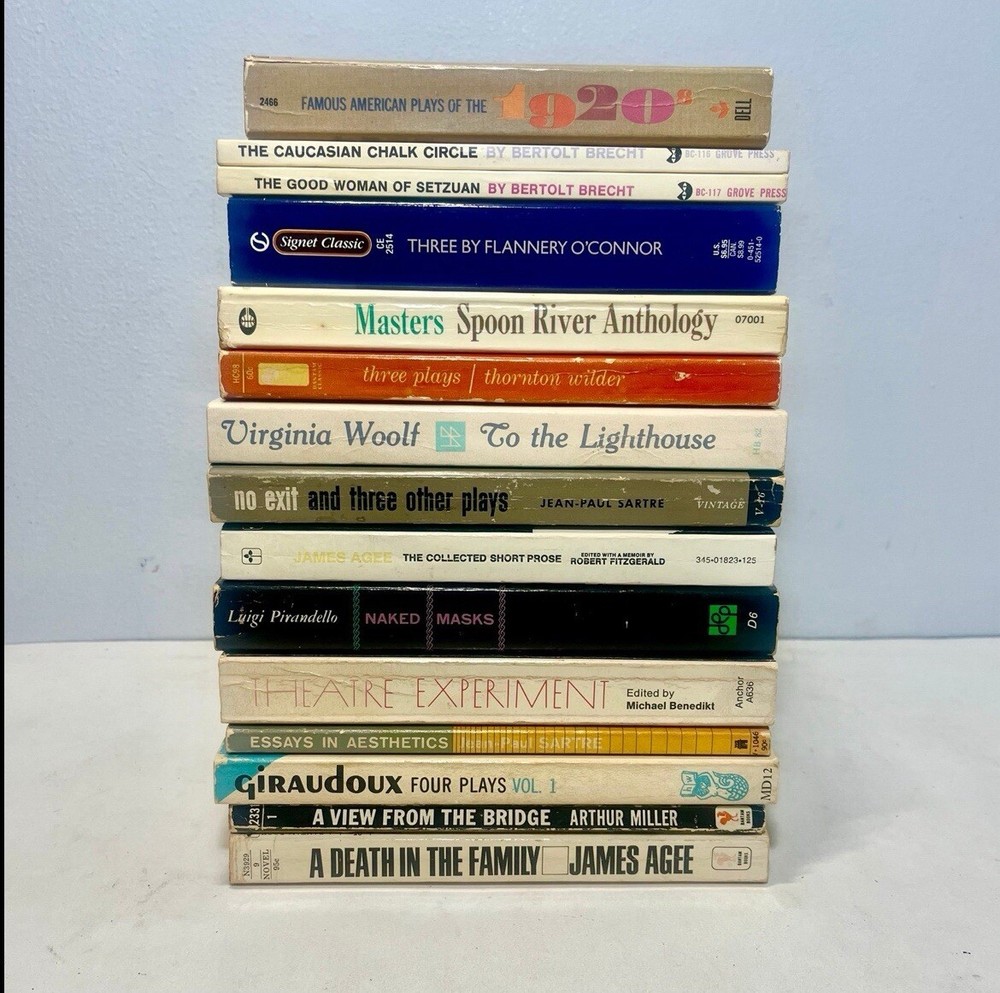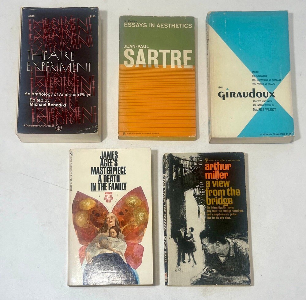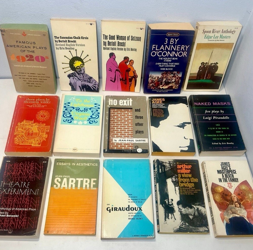 This is a lot of 15 Vintage Paperback Books, each full of Plays, Drama & Theater by various authors. Read All 48+ Plays in this vintage collection of books, all roughly published between 1950 and 1980. This spectacular collection includes books containing: 6 Famous American Plays of the 1920s, 2 by Bertolucci Brecht, 3 by Flannery O’Connor, Edgar Lee Masters, 5 Plays by Luigi Pirandello, 3 Plays by Thornton Wilder, Virginia Woolf, 4 Plays by Jean-Paul Sartre, Collected Short Prose by James Agee, 16 American Plays in Theater Experiment, Essays by Jean-Paul Sartre, 4 Plays by Jean Giraudoux, another James Agee, and a play by Arthur Miller. This paperback lot of plays is a must-have for any book lover and an essential addition to any theater lover’s bookshelf! The books are in great shape and have been well preserved over the last 40+ to 70+ years! They are in overall Good condition. Don't miss out on the opportunity to add this amazing collection to your library today!