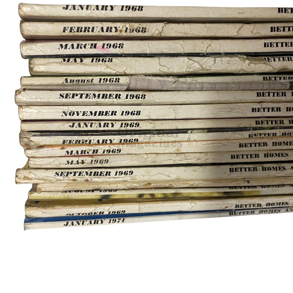 This collection of 15 Better Homes and Gardens magazines from 1968, 1969, and 1971 captures the evolving styles and trends of late 1960s and early 1970s living. Each issue is filled with vintage home decor inspiration, gardening tips, delicious recipes, and nostalgic advertisements, offering a unique look at the era's lifestyle. The magazines have been carefully stored in a climate-controlled environment to preserve their condition. Some issues may show minor signs of wear, such as light binding wear, small rips, or marks, which are characteristic of vintage collectibles and add to their authenticity and charm. A lot of this size and variety is a rare find, making it ideal for collectors, enthusiasts, or anyone who appreciates the timeless appeal of Better Homes and Gardens . Don’t miss the opportunity to own this delightful set of vintage treasures! Better Homes and Gardens Magazine January 1968 Better Homes and Gardens Magazine February 1968 Better Homes and Gardens Magazine March 1968 Better Homes and Gardens Magazine May 1968 Better Homes and Gardens Magazine August 1968 Better Homes and Gardens Magazine September 1968 Better Homes and Gardens Magazine November 1968 Better Homes and Gardens Magazine January 1969 Better Homes and Gardens Magazine February 1969 Better Homes and Gardens Magazine March 1969 Better Homes and Gardens Magazine May 1969 Better Homes and Gardens Magazine June 1969 Better Homes and Gardens Magazine August 1969 Better Homes and Gardens Magazine September 1969 Better Homes and Gardens Magazine October 1969 Better Homes and Gardens Magazine January 1971