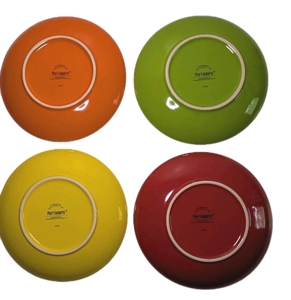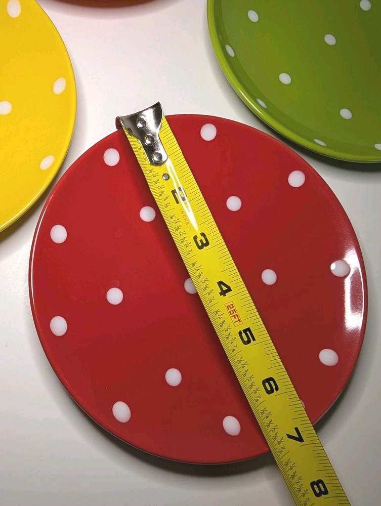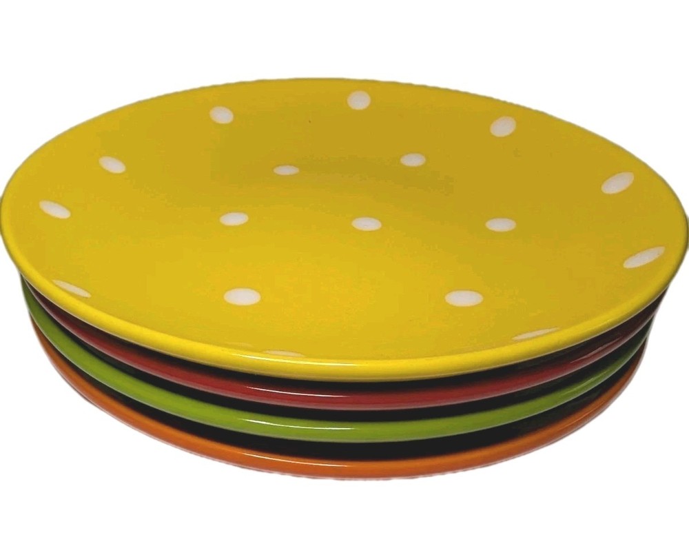 This set of 4 Pier 1 Imports dessert plates features a fun and colorful polka dot pattern in red, green, orange, and yellow. Made of ceramic with a glossy finish, these round plates are perfect for all occasions and add a contemporary style to your table setting. With a diameter of 7 inches, each plate is beautifully printed with the brand's backstamp and is sure to brighten up your dining experience. Made in China, these dessert plates are a stylish and eye-catching addition to any kitchen or dining room. These are like new and have been in storage.