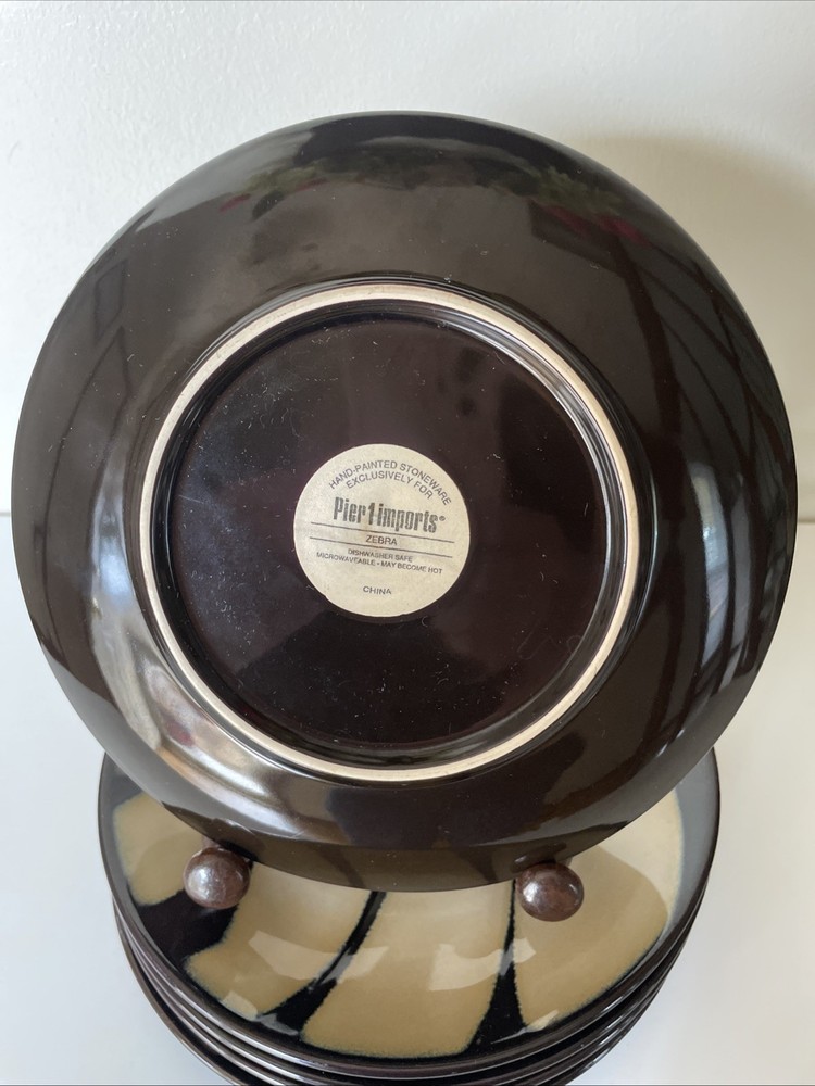 Lot of 5 Pier 1 Imports Zebra Hand-Painted Stoneware Salad Plates – 2014 (Discontinued) Description: Add a touch of wild elegance to your dining experience with this lot of 5 salad plates from Pier 1 Imports , featuring a distinctive zebra pattern . These plates were part of a unique collection and are now discontinued , making them a great find for collectors or those who love bold tableware. Details: Brand: Pier 1 Imports Design: Zebra (Hand-Painted Stoneware) Year: 2014 Size: 8 inches Dishwasher Safe: Yes Microwave Safe: Yes (May become hot) Made In: China Back Stamp: "Hand-Painted Stoneware" Condition: Good Used – Good Condition Slight utensil marks from prior use No cracks, chips, or crazing I took some really up-close pictures in an angled light so you can see them. Origin: Acquired from an antique store in Lower Michigan known for its unique and hard-to-find pieces. Don’t miss your chance to own these beautiful, discontinued dinner plates from Pier 1 Imports! Props not included: no plate stand --------------------- Thank you for choosing our products. We strive to provide you with the best quality and service. Here are some important details about your order: - We ship your items within 24 hours of receiving your payment confirmation. - We have a variety of products for sale on our E-bay store. You can browse them by clicking on the link below. ; My Items - We kindly request that you complete your payment within 3 days of placing your order. This will help us process your order faster and avoid any delays. - We make sure to include clear and accurate pictures of our products on our listings. Please review them carefully before making your purchase, as they are part of the product description. - We appreciate your feedback and support. Please add us to your favorite seller list and check our store regularly for new items and promotions. - If you have any questions or concerns about your order, please do not hesitate to contact us. We are here to help and resolve any issues you may have. - Your satisfaction is our priority. All our products are stored in a clean, smoke-free home and handled with care. We hope you enjoy your shopping experience with us and come back soon!