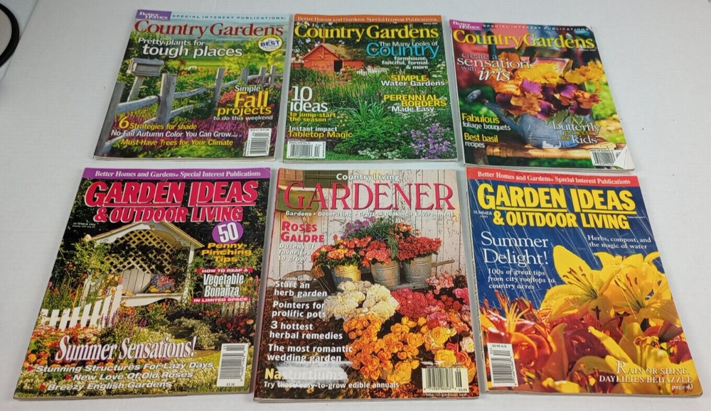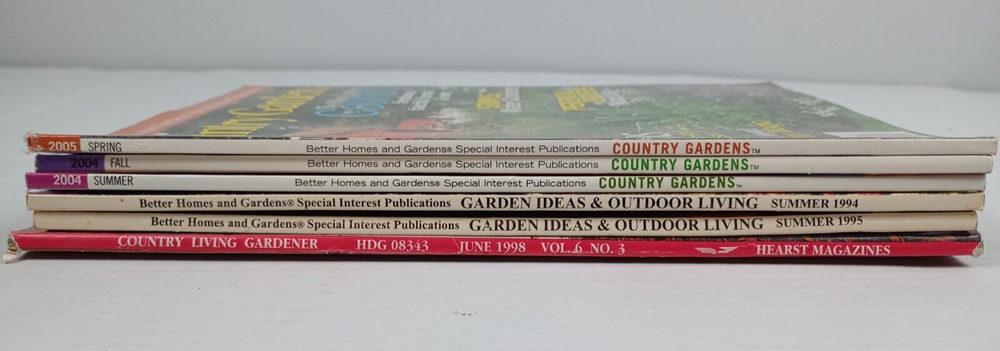 Lot of 6 Vintage Issues Gardening Magazines Country Living Better Homes 1994 - 2005 1998 - Country Living Gardener June Volume 6 No. 3 Hearst Magazines Better Homes and Gardens Special Interest Publications: Garden Ideas and Outdoor Living 1994 - Summer 1995 - Summer Country Gardens 2004 - Summer 2004 - Fall 2005 - Spring HAND DONE MEASUREMENTS ARE APPROXIMATE WE CANNOT CHECK ADDITIONAL MEASUREMENTS OR DETAILS ALL FLAWS WILL BE ISOLATED IN PHOTOS ABOVE WE DO NOT USE FILTERS ON PHOTOS WE SHIP NEXT BUSINESS DAY AFTER PAYMENT