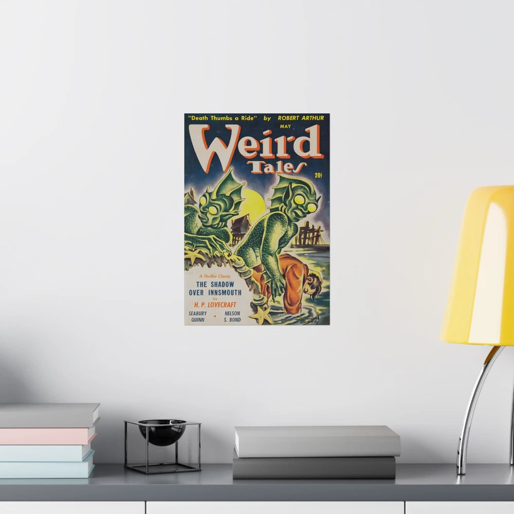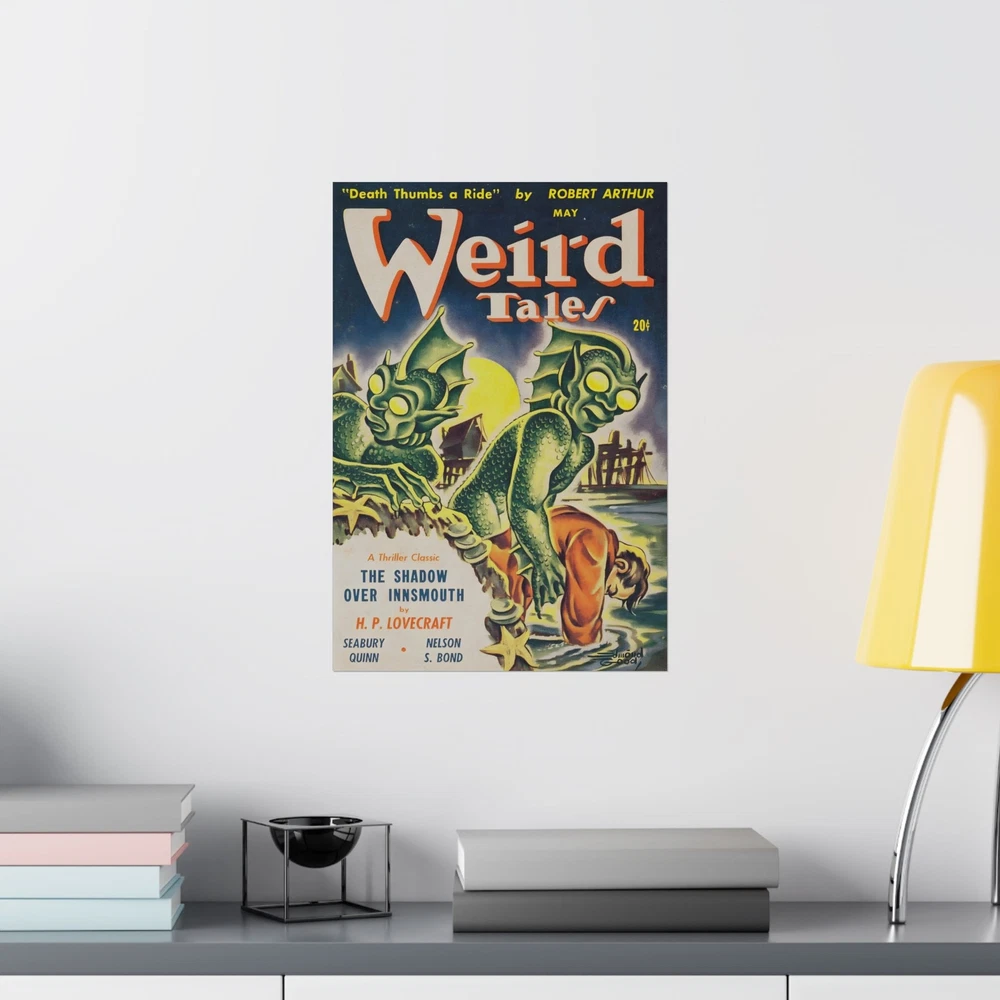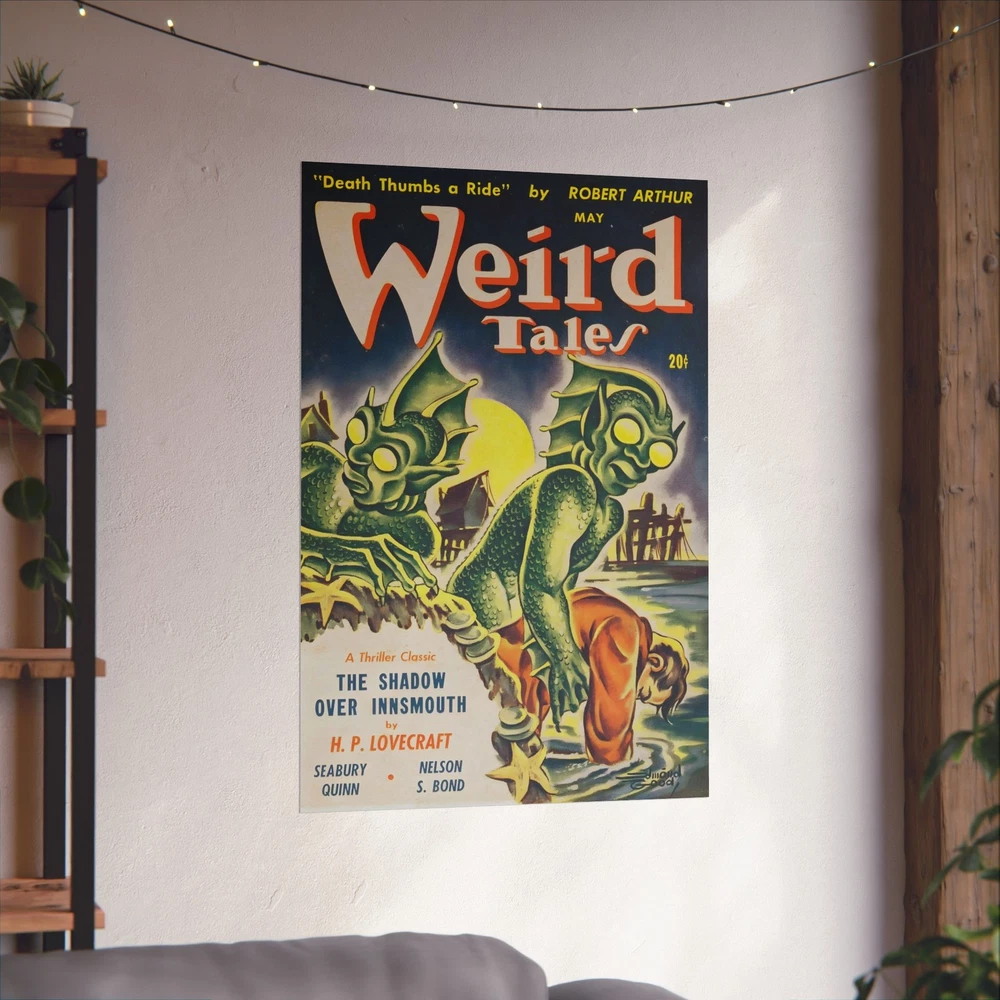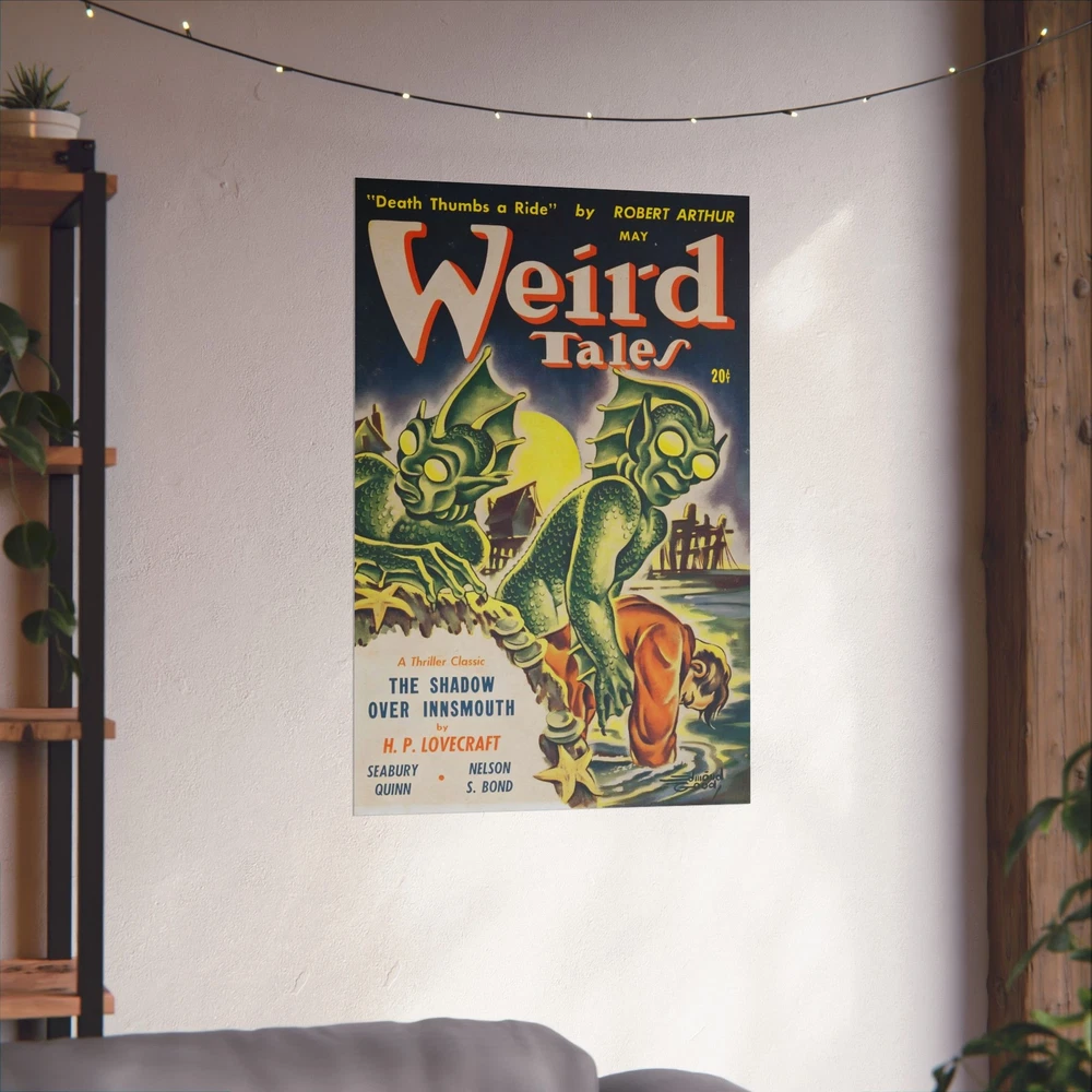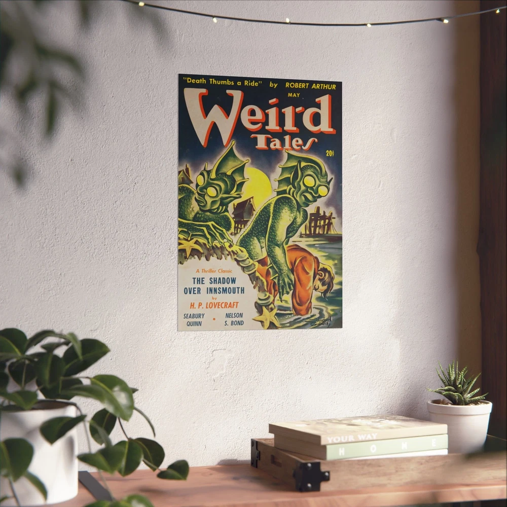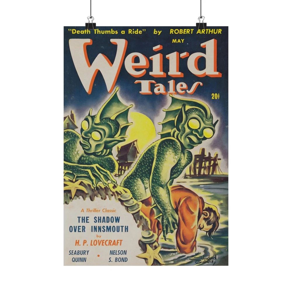 Behold this captivating piece of vintage-inspired art that brings the mystique of H.P. Lovecraft's universe to life! This premuim poster showcases the iconic pulp cover from 1942 Weird Tales, featuring eerie imagery and evocative typography that captures the essence of Lovecraftian horror. The matte poster is printed on high-quality paper, ensuring durability and clarity of detail. Whether you're a dedicated Lovecraft enthusiast, a collector of retro art, or simply a fan of the macabre, this poster makes a striking addition to any space. Immerse yourself in the enigmatic world of Lovecraft's cosmic horror with the Shadow over Innsmouth Matte Poster—a timeless piece that pays homage to one of the most influential writers of the genre. .: Made with museum-grade archival paper (175gsm) for excellent printing fidelity and vibrant color reproduction. .: For indoor use only .: Assembled in the USA from globally sourced parts