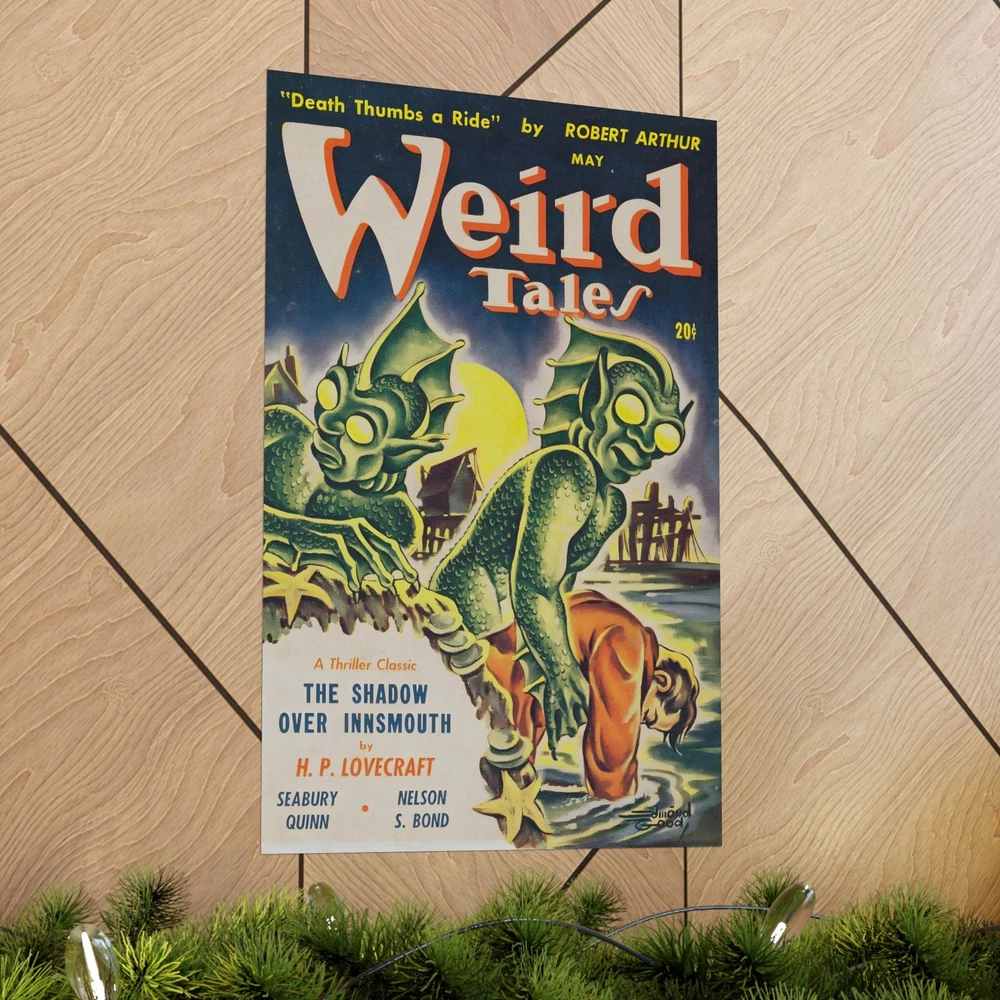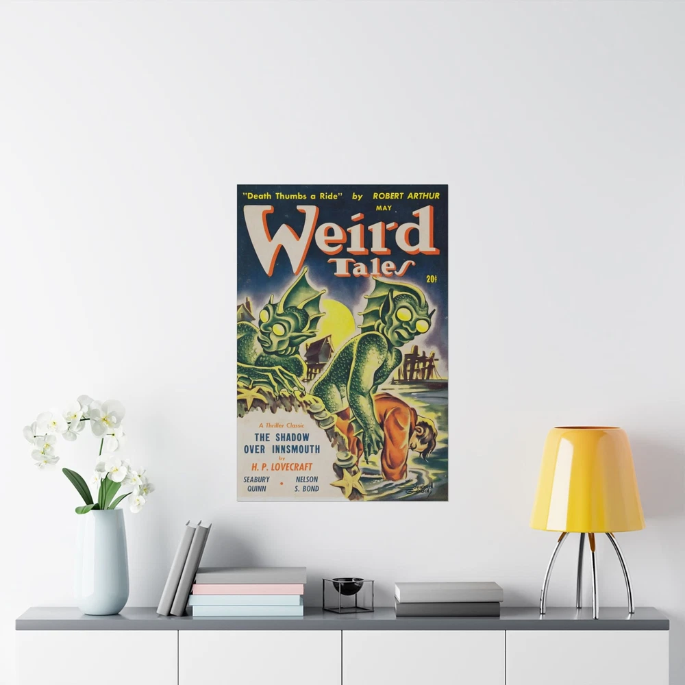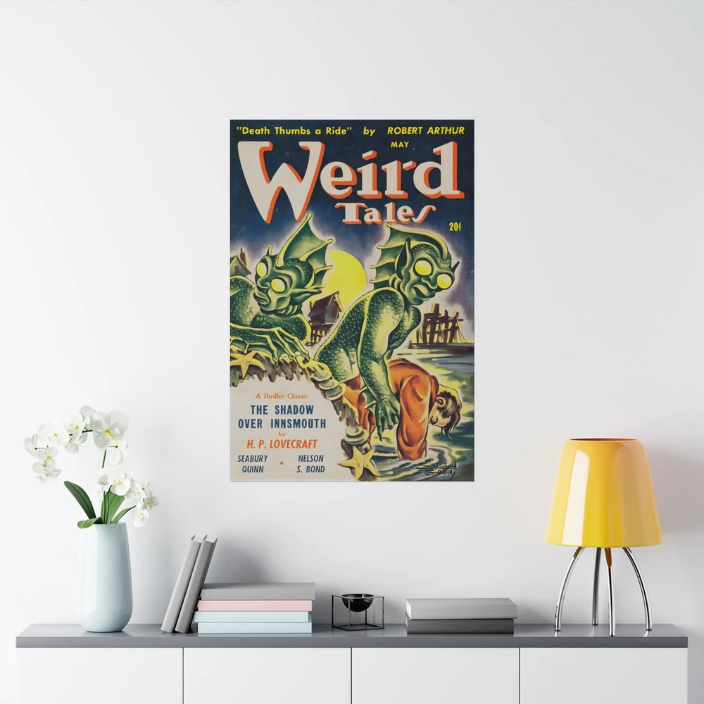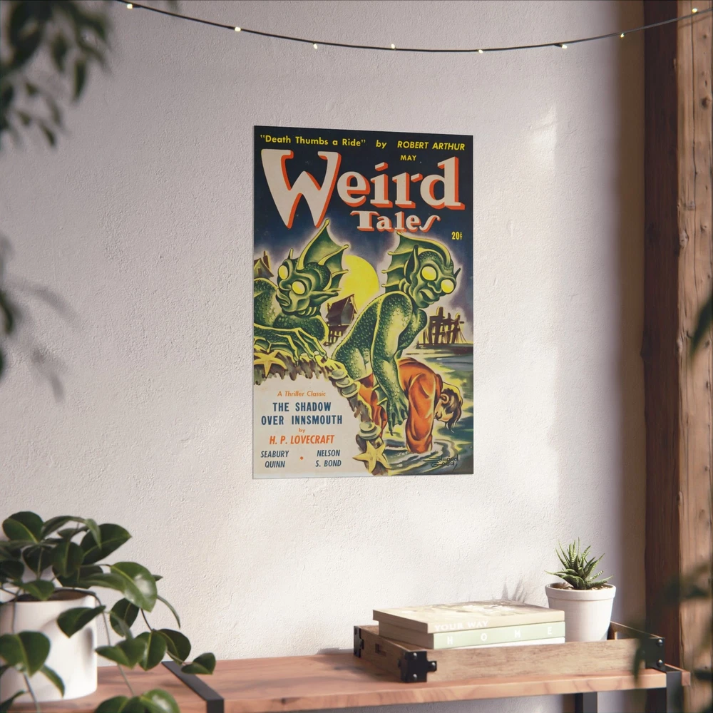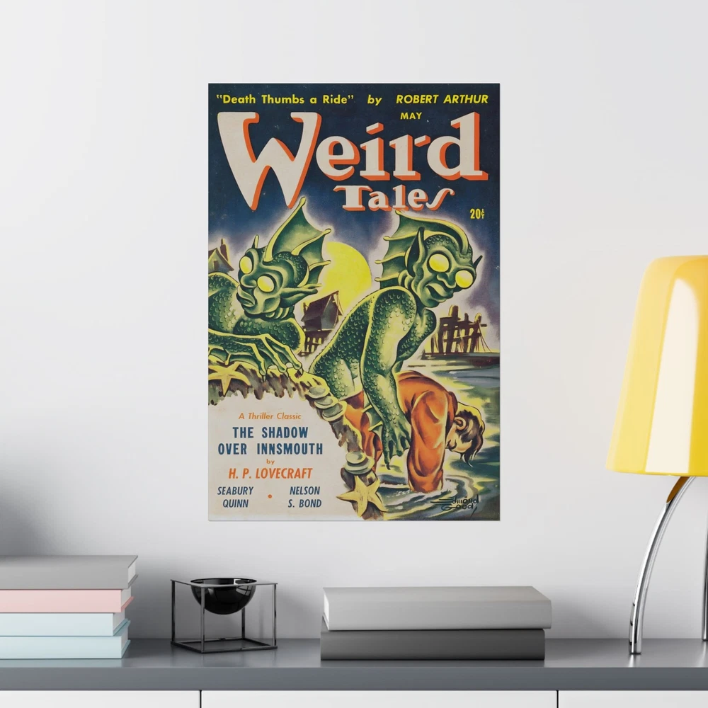 Behold this captivating piece of vintage-inspired art that brings the mystique of H.P. Lovecraft's universe to life! This premuim poster showcases the iconic pulp cover from 1942 Weird Tales, featuring eerie imagery and evocative typography that captures the essence of Lovecraftian horror. The matte poster is printed on high-quality paper, ensuring durability and clarity of detail. Whether you're a dedicated Lovecraft enthusiast, a collector of retro art, or simply a fan of the macabre, this poster makes a striking addition to any space. Immerse yourself in the enigmatic world of Lovecraft's cosmic horror with the Shadow over Innsmouth Matte Poster—a timeless piece that pays homage to one of the most influential writers of the genre. .: Made with museum-grade archival paper (175gsm) for excellent printing fidelity and vibrant color reproduction. .: For indoor use only .: Assembled in the USA from globally sourced parts