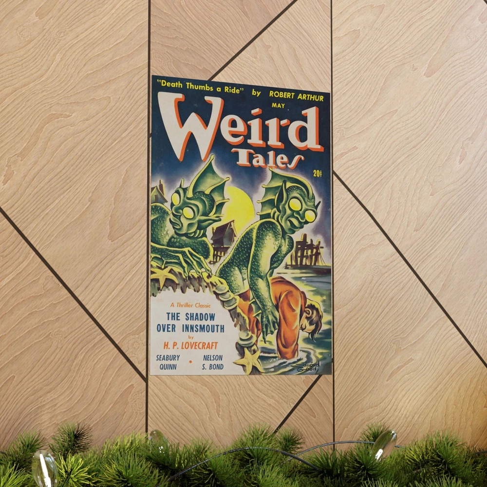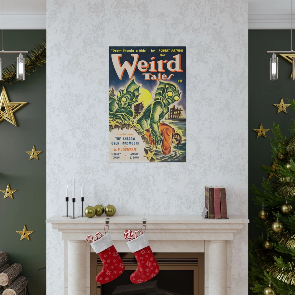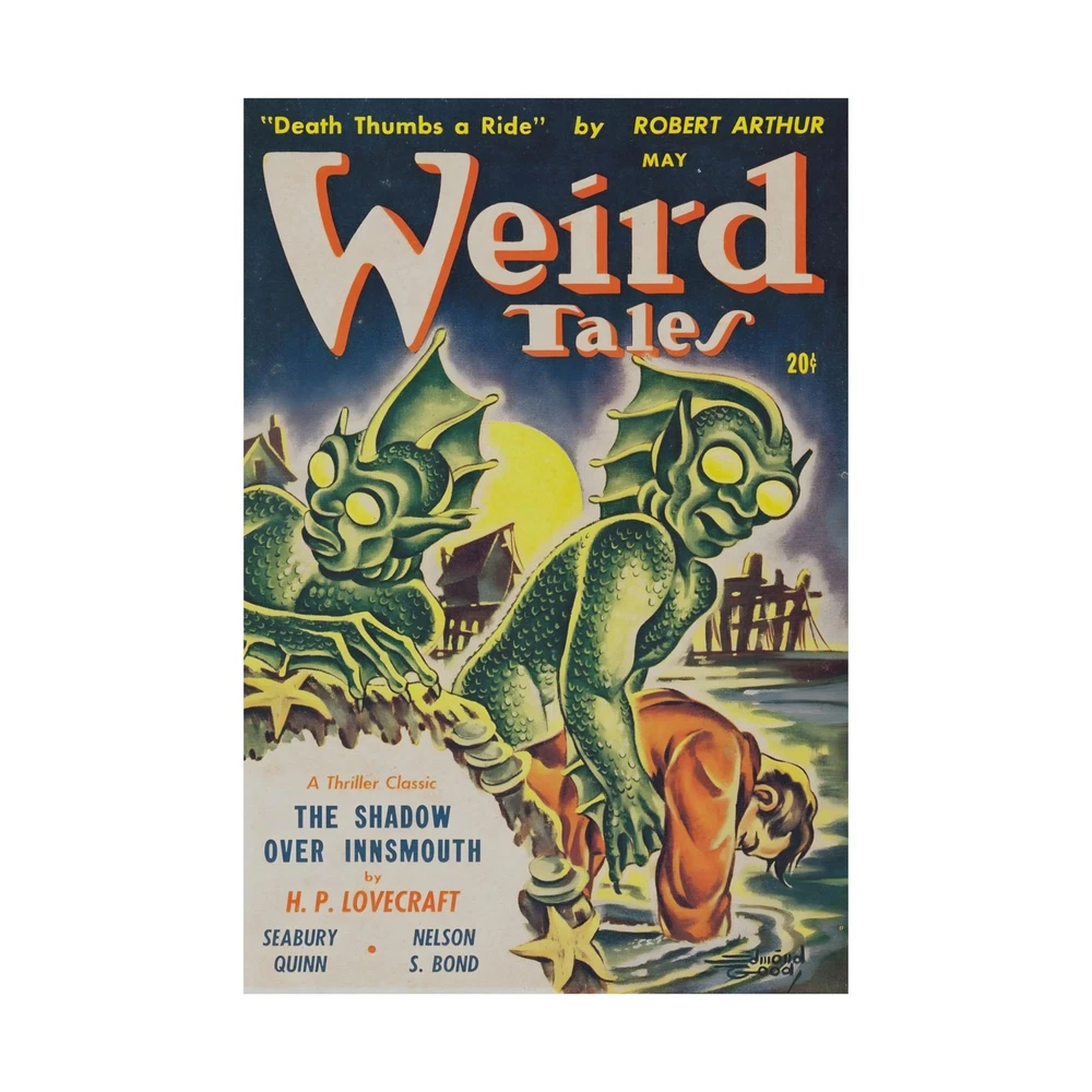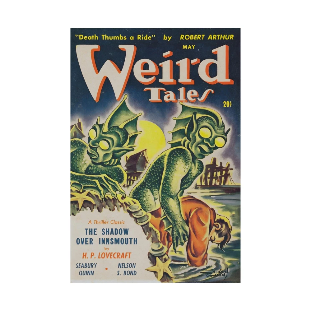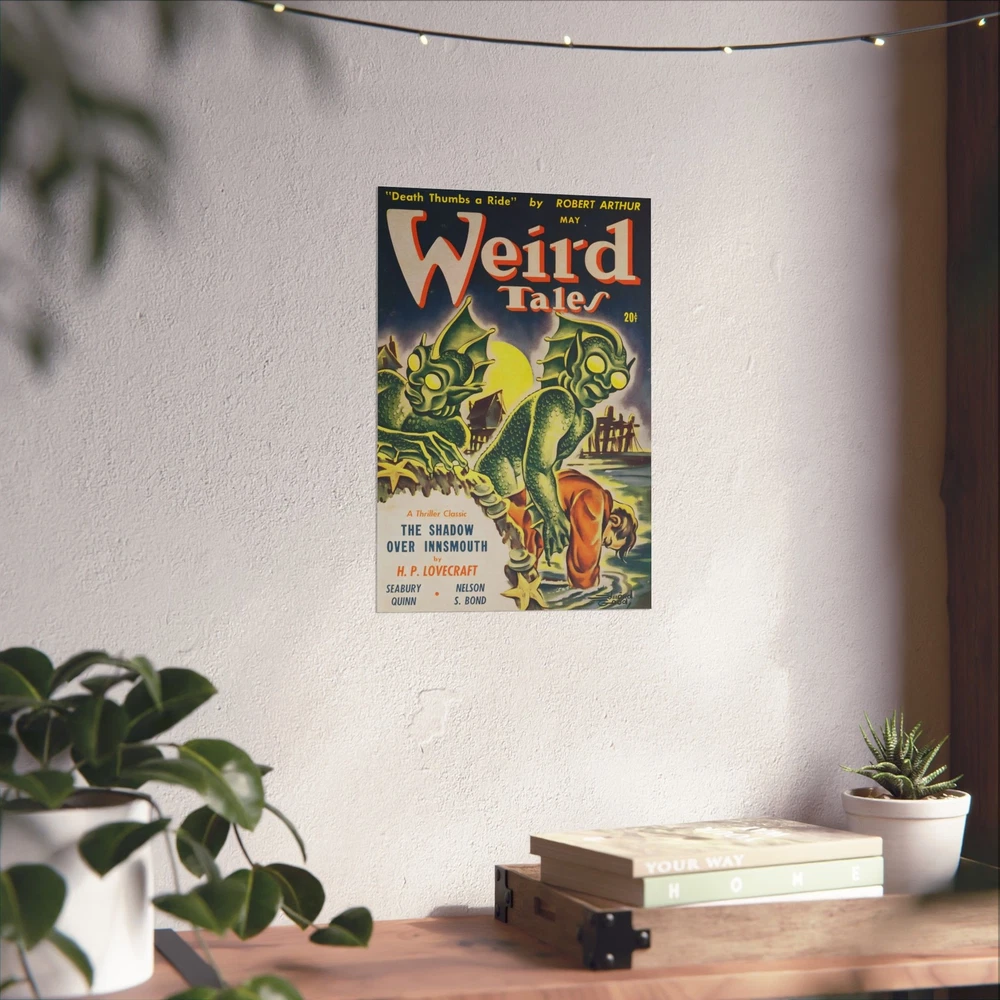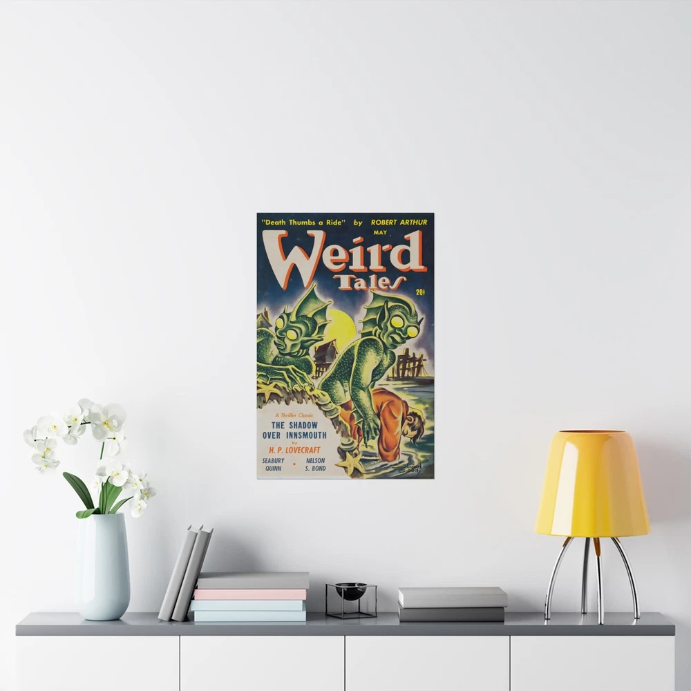 Behold this captivating piece of vintage-inspired art that brings the mystique of H.P. Lovecraft's universe to life! This premuim poster showcases the iconic pulp cover from 1942 Weird Tales, featuring eerie imagery and evocative typography that captures the essence of Lovecraftian horror. The matte poster is printed on high-quality paper, ensuring durability and clarity of detail. Whether you're a dedicated Lovecraft enthusiast, a collector of retro art, or simply a fan of the macabre, this poster makes a striking addition to any space. Immerse yourself in the enigmatic world of Lovecraft's cosmic horror with the Shadow over Innsmouth Matte Poster—a timeless piece that pays homage to one of the most influential writers of the genre. .: Made with museum-grade archival paper (175gsm) for excellent printing fidelity and vibrant color reproduction. .: For indoor use only .: Assembled in the USA from globally sourced parts