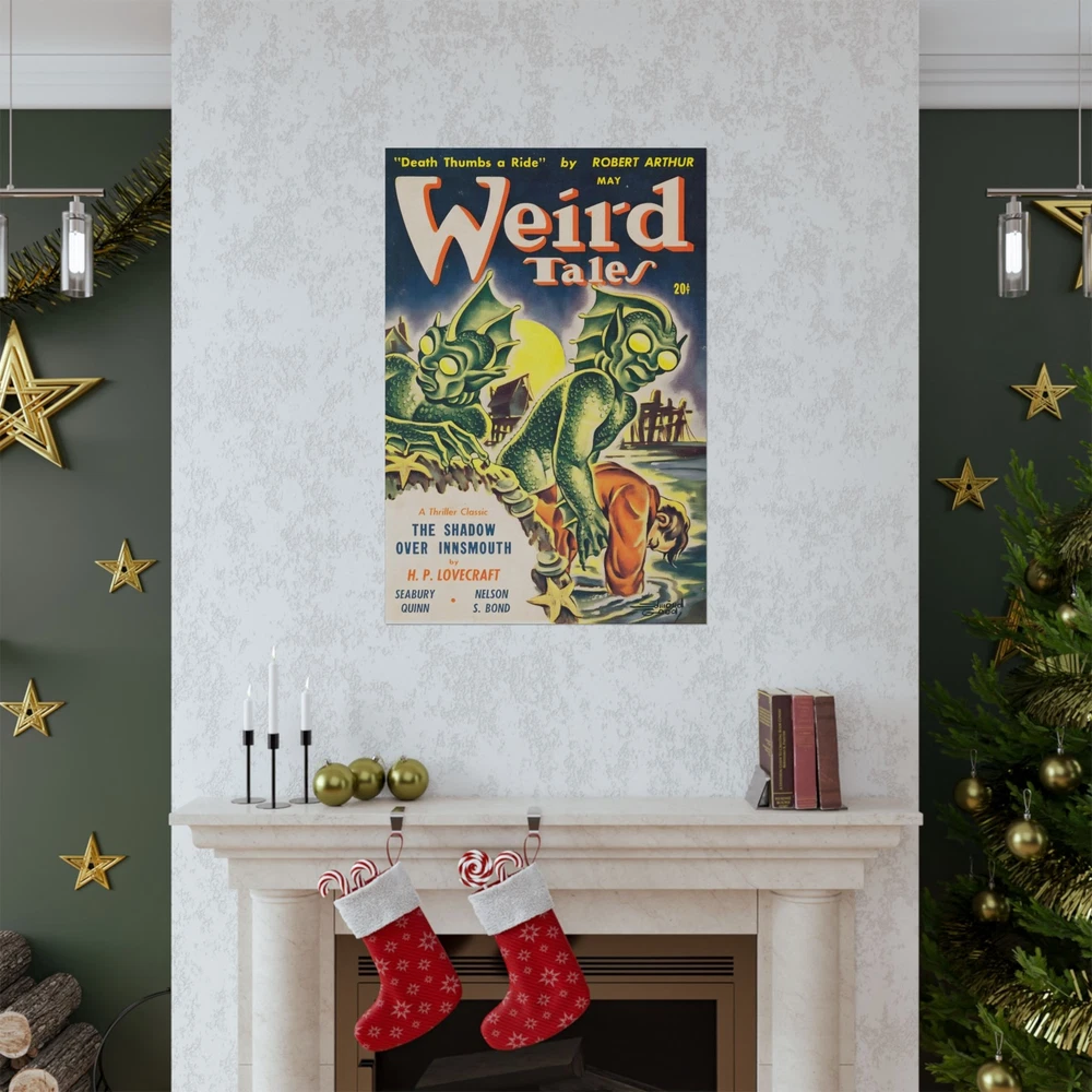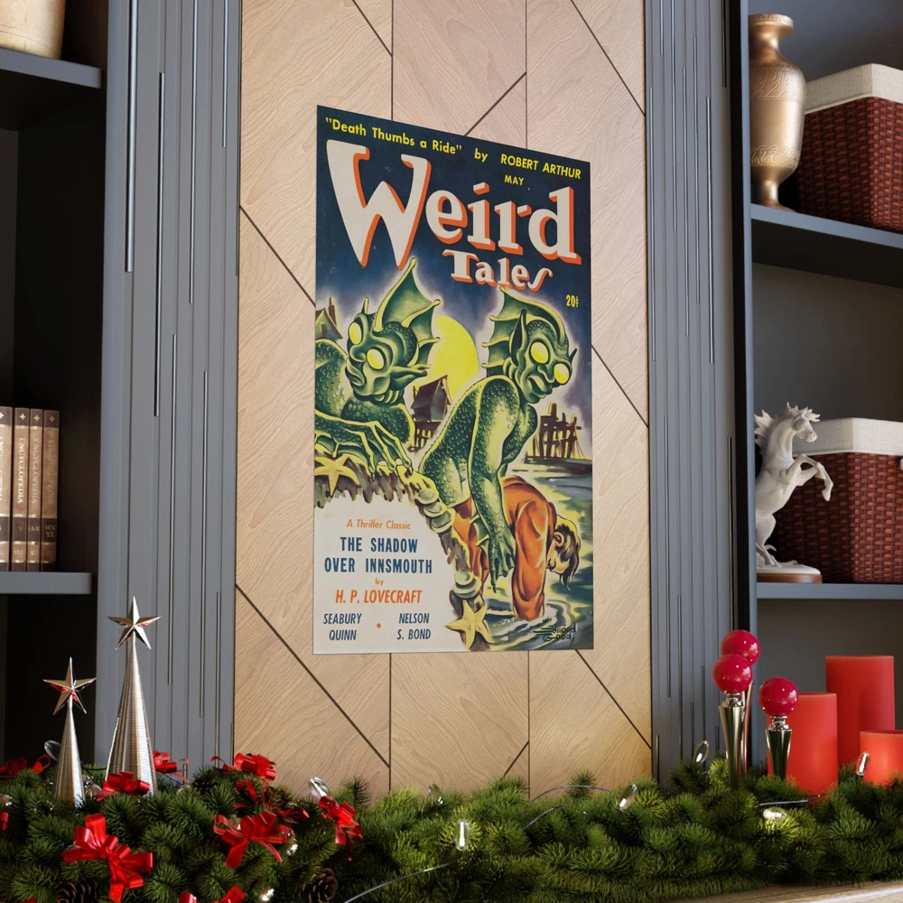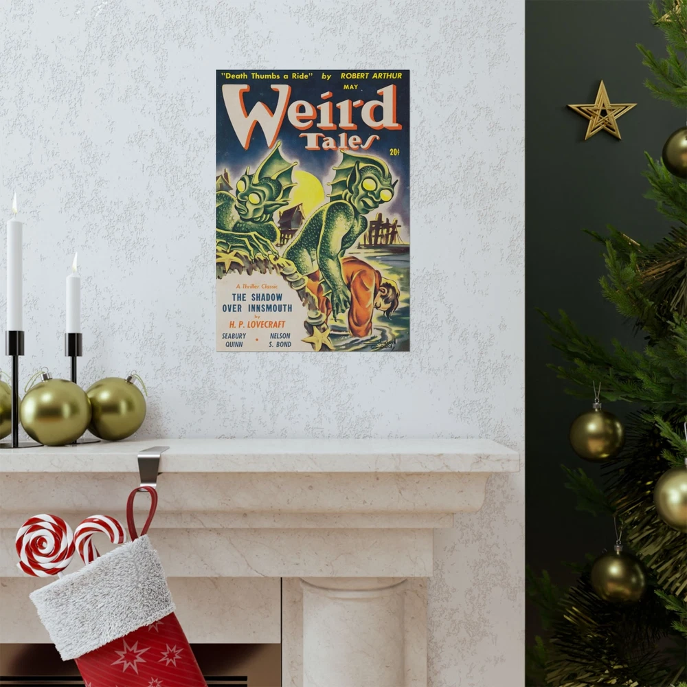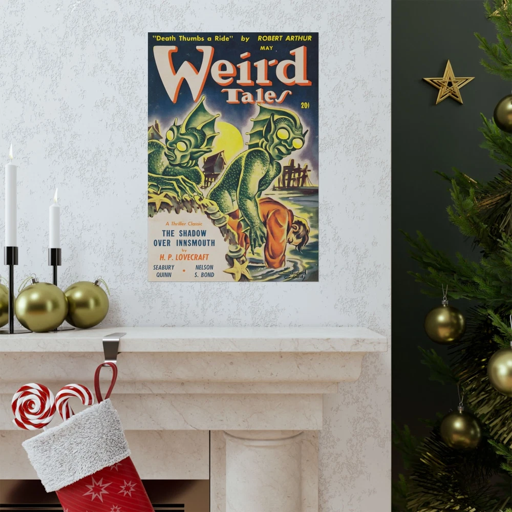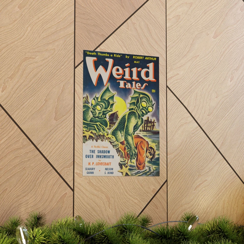 Behold this captivating piece of vintage-inspired art that brings the mystique of H.P. Lovecraft's universe to life! This premuim poster showcases the iconic pulp cover from 1942 Weird Tales, featuring eerie imagery and evocative typography that captures the essence of Lovecraftian horror. The matte poster is printed on high-quality paper, ensuring durability and clarity of detail. Whether you're a dedicated Lovecraft enthusiast, a collector of retro art, or simply a fan of the macabre, this poster makes a striking addition to any space. Immerse yourself in the enigmatic world of Lovecraft's cosmic horror with the Shadow over Innsmouth Matte Poster—a timeless piece that pays homage to one of the most influential writers of the genre. .: Made with museum-grade archival paper (175gsm) for excellent printing fidelity and vibrant color reproduction. .: For indoor use only .: Assembled in the USA from globally sourced parts