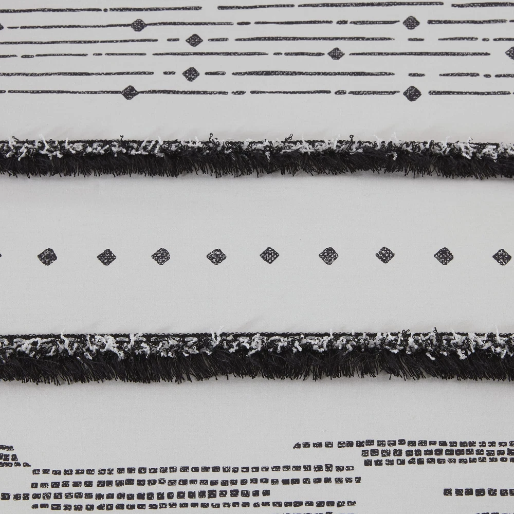Give your bedroom a shabby chic update with the Cotton Printed Comforter Set with Trims. The 100% cotton comforter features a black stripe print with 6 rows of cotton tufted trims that add dimension to the charming boho look. Hidden bar tacks on the top of the comforter create a clean, duvet-like finish and the solid black reverse adds a bold touch to the design. Matching shams with 1-inch self-flanges and overlap closures on the back provide the finishing touches to this cotton comforter set. Give your bedroom a shabby chic update with the Cotton Printed Comforter Set with Trims. The 100% cotton comforter features a black stripe print with 6 rows of cotton tufted trims that add dimension to the charming boho look. Naturally breathable cotton cover and hypoallergenic polly fill for year round comfort Set includes: 1 Comforter: 88"W x 92"L, 2 Standard Shams: 20"W x 26"L + 1"D Care Instruction: For your convenience it's machine washable. Do not use bleach. Commercial size washer and dryer is recommended for best result.