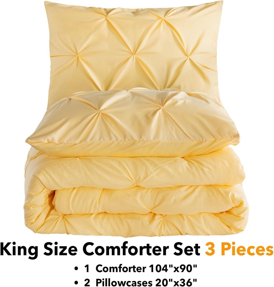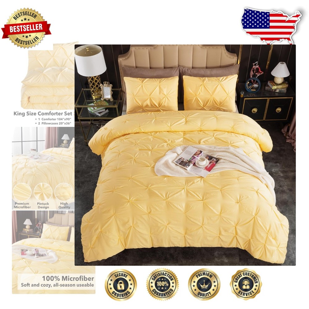 Luxurious King Size Yellow Pintuck Comforter Set - 3 Pieces All-Season Bedding < class="slides"> ‹ › ‹ › ‹ › ‹ › ‹ › ‹ › ‹ › ‹ › ‹ › Luxurious King Size Yellow Pintuck Comforter Set -3 Pieces All-Season Bedding Product Features: <> Pinch Pleat Design: A modern and fashionable touch to your bedroom décor, this pintuck comforter brings a lavish and elegant atmosphere. Soft and Cozy Fabric: Crafted from high-quality microfiber, this comforter set is soft and cozy, filled with lightweight down alternative microfiber for a balance of warmth and comfort. King Size Dimensions: Includes 1 comforter (104x90 inches) and 2 pillowcases (20x36 inches), perfectly sized for your king-sized bed. Handmade Quality: Each pleat is handcrafted, ensuring an exquisite look and exceptional craftsmanship for lasting quality and beauty. All-Season Comfort: Designed to be warm yet lightweight, suitable for year-round use. Benefits: <> Brings a touch of elegance to any bedroom setting. Promotes a restful sleep experience with its luxurious feel. Makes for a perfect gift for special occasions such as anniversaries, birthdays, and holidays. Easy to maintain and ensures long-lasting use due to quality craftsmanship. Why Choose Our Pintuck Comforter Set? Transform your bedroom into a sanctuary of style and comfort with our Luxurious King Size Yellow Pintuck Comforter Set. The stunning pinch pleat design elevates your space, while the ultra-soft microfiber promises cozy nights and tranquil slumbers. Ideal for any season, this bedding set combines beauty with functionality, making it the perfect addition to your home or a thoughtful gift for a loved one. Indulge yourself in luxury and sophistication—order your Pintuck Comforter Set today and experience the ultimate in bedding comfort! Shipping <> <> Free & Fast Shipping - We offer free shipping to most of the USA with a normal delivery time of 3-7 days. However, due to the current situation, additional delivery time (up to 3 weeks) may be required for some items. Alternative Carriers - We may use alternative carriers (e.g. USPS, FedEx, UPS, etc.) to ensure your package arrives safely and on time. Due to the use of multiple carriers, we are unable to provide a tracking number automatically. Handling Time - Orders are processed and shipped within 1-2 business days of receiving cleared payment. Shipping Restrictions - Shipping to Alaska, Hawaii, Puerto Rico, Guam, and other US territories may incur shipping charges or delivery restrictions. Please contact us before ordering, or your order can be refunded/cancelled. State Restrictions - There may be restrictions based on your state of purchase. For example, certain items may not be shipped to California due to state regulations. Contact for Tracking Updates - If you require tracking updates or have any concerns about the delivery of your order, please feel free to contact us, and we will be happy to assist you. Return <> <> 30-Day Hassle-Free Returns - We want you to be completely satisfied with your purchase. If you are not, you can return the item within 30 days of receiving it for a full refund or exchange. Easy Return Process - To start a return, simply contact us and we will provide you with a prepaid return shipping label and detailed instructions. Restocking Fee - There are no restocking fees for returns. However, the buyer is responsible for return shipping costs if the return is not due to a seller's error. Refund Processing Time - Refunds will be processed within 5 business days of receiving the returned item in its condition. Payment We accept all major credit cards, PayPal, and Apple Pay for your convenience. Your payment information is secure and encrypted to ensure a safe and seamless transaction. Please complete your payment within 3 days of purchase to avoid any delays in shipping. Feedback Your feedback is extremely important to us. We strive to provide the best products and customer service possible. If you are satisfied with your purchase, please take a moment to leave us a positive review. If you have any concerns or issues with your order, please contact us before leaving negative feedback. We are committed to resolving any problems and ensuring your satisfaction. Contact Us If you have any questions or concerns, please feel free to out to our customer support team. You can contact us through the eBay messaging system. We are available Monday to Friday, 9:00 am to 5:00 pm EST, and we will do our best to respond to your inquiry within 24 hours. Buy it now and enjoy a pleasant shopping experience! Model: King Comforter Set Set Includes: Comforter,Pillowcase Material: Microfiber Features: Down Alternative,Lightweight,Soft,Cozy Theme: Luxury Care Instructions: Machine Wash Department: Adults Room: Bedroom Size: King Type: Comforter Set Color: Yellow Fill Material: Microfiber Pattern: Geometric Number of Items in Set: 3 Style: Contemporary Insulation: All Seasons Season: All Closure Type: No Closure Thread Count: 200 or Less GSM (Grams per Square Meter): 150 to 300