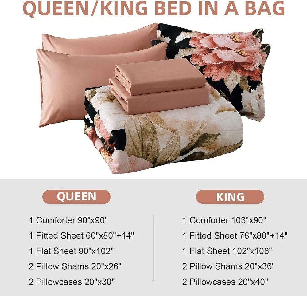 Luxurious Pink Floral King Comforter Set - 7 Pieces, Soft Microfiber Bedding < class="slides"> ‹ › ‹ › ‹ › ‹ › ‹ › ‹ › ‹ › ‹ › ‹ › Luxurious Pink Floral King Comforter Set - 7 Pieces Transform your bedroom into an oasis of elegance with this exquisite 7-piece bedding set, featuring a captivating pink floral design against a deep black backdrop. Perfectly suited for any season, this set brings a breath of spring into your home, making it an ideal enhancement for your bedroom or guest room. Features: Elegant Floral Design: Vivid pink floral patterns stand out on a chic black background, adding a touch of sophistication to your decor. Soft and Cozy Material: Crafted from 100% soft microfiber that is fluffy, breathable, and lightweight for ultimate comfort. Complete Set: 7 pieces include: 1 Floral Comforter (90" x 103") 1 Flat Sheet (102" x 108") 1 Fitted Sheet (78" x 80" + 14") 2 Pillow Shams (20" x 36") 2 Pillowcases (20" x 40") Exquisite Craftsmanship: Made with whole pieces of polyester filling that is soft and warm, expertly stitched to prevent clumping and ensure durability. Care Instructions: Machine washable in cold water on a gentle cycle; tumble dry on low. Avoid bleach. To rejuvenate, expose to sunlight and gently tap for fluffiness. Benefits: Creates an elegant and stylish ambiance in any room. Soft, cozy material ensures a restful sleep. The perfect thickness keeps you warm -round. Conveniently packaged for easy storage and transport. Durable construction stands the of time and use. Why Choose Our Pink Floral Comforter Set? The Luxurious Pink Floral King Comforter Set is not just bedding—it's an experience. Indulge in the sumptuous feel of soft microfiber, complemented by an elegant design that breathes new life into your bedroom decor. This 7-piece comforter set promises comfort, beauty, and effortless style. Elevate your sleeping experience with this captivating set—your sanctuary of elegance awaits. Order yours today and embrace the luxurious comfort you deserve! Shipping Free & Fast Shipping - We offer free shipping to most of the USA with a normal delivery time of 3-7 days. However, due to the current situation, additional delivery time (up to 3 weeks) may be required for some items. Alternative Carriers - We may use alternative carriers (e.g. USPS, FedEx, UPS, etc.) to ensure your package arrives safely and on time. Due to the use of multiple carriers, we are unable to provide a tracking number automatically. Handling Time - Orders are processed and shipped within 1-2 business days of receiving cleared payment. Shipping Restrictions - Shipping to Alaska, Hawaii, Puerto Rico, Guam, and other US territories may incur shipping charges or delivery restrictions. Please contact us before ordering, or your order can be refunded/cancelled. State Restrictions - There may be restrictions based on your state of purchase. For example, certain items may not be shipped to California due to state regulations. Contact for Tracking Updates - If you require tracking updates or have any concerns about the delivery of your order, please feel free to contact us, and we will be happy to assist you. Return 30-Day Hassle-Free Returns - We want you to be completely satisfied with your purchase. If you are not, you can return the item within 30 days of receiving it for a full refund or exchange. Easy Return Process - To start a return, simply contact us and we will provide you with a prepaid return shipping label and detailed instructions. Restocking Fee - There are no restocking fees for returns. However, the buyer is responsible for return shipping costs if the return is not due to a seller's error. Refund Processing Time - Refunds will be processed within 5 business days of receiving the returned item in its condition. Payment We accept all major credit cards, PayPal, and Apple Pay for your convenience. Your payment information is secure and encrypted to ensure a safe and seamless transaction. Please complete your payment within 3 days of purchase to avoid any delays in shipping. Feedback Your feedback is extremely important to us. We strive to provide the best products and customer service possible. If you are satisfied with your purchase, please take a moment to leave us a positive review. If you have any concerns or issues with your order, please contact us before leaving negative feedback. We are committed to resolving any problems and ensuring your satisfaction. Contact Us If you have any questions or concerns, please feel free to out to our customer support team. You can contact us through the eBay messaging system. We are available Monday to Friday, 9:00 am to 5:00 pm EST, and we will do our best to respond to your inquiry within 24 hours. Buy it now and enjoy a pleasant shopping experience! Set Includes: Comforter,Fitted Sheet,Flat Sheet,Pillowcase,Pillow Sham Material: Microfiber,polyester Features: Breathable,Lightweight,Cozy Theme: Luxury Care Instructions: Do Not Bleach,Machine Wash,Machine Wash Cold,Tumble Dry on Low Heat Department: Teens,Adults Room: Bedroom,Guest Room Size: King Type: Comforter Set Color: Pink Fill Material: Polyester Pattern: Floral Number of Items in Set: 7 Insulation: All Seasons Style: Farmhouse Season: All Closure Type: No Closure Thread Count: 200 or Less GSM (Grams per Square Meter): 301 to 450