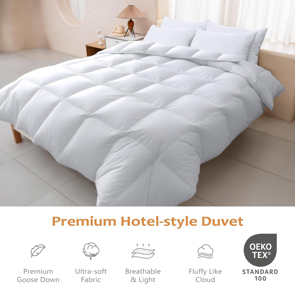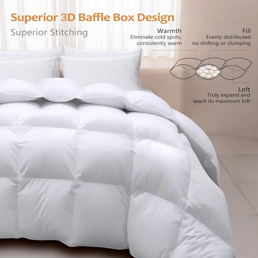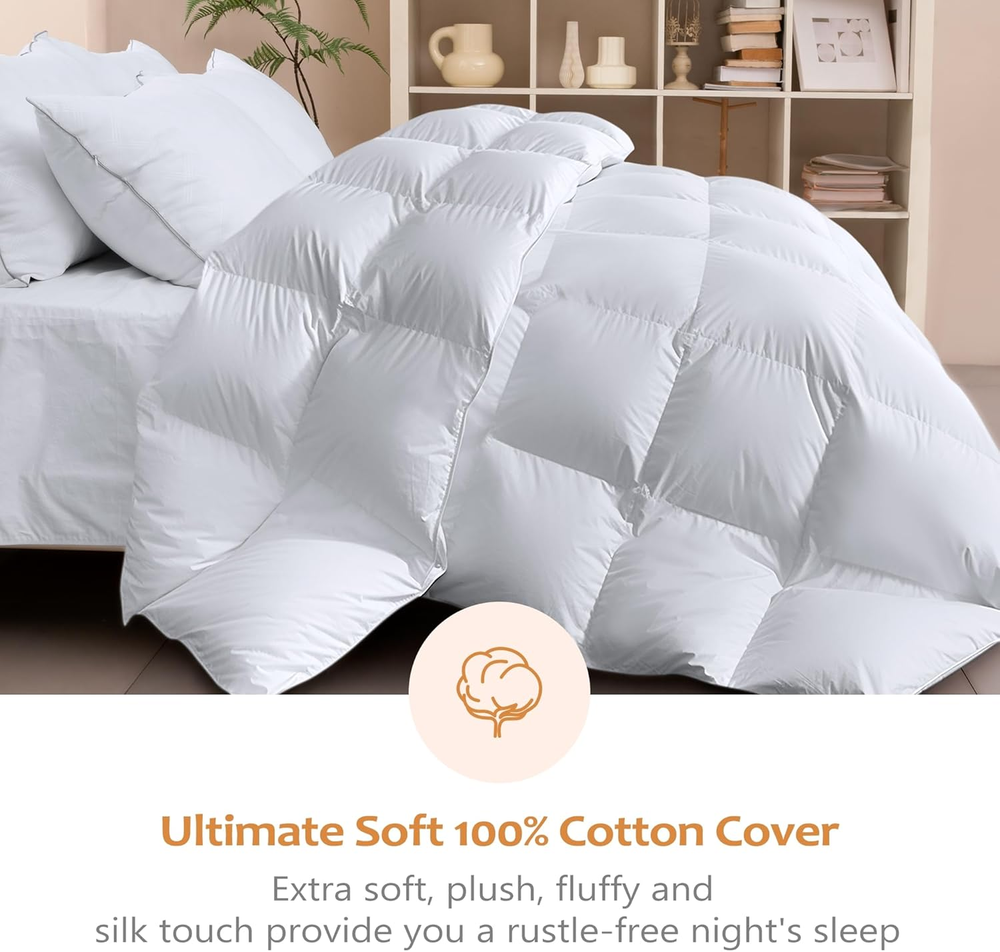 Store New Arrivals Add to Favorite View Feedback Contact Luxury Goose Feather down Comforter King Size 850+ Fill-Power, Fluffy and Cozy Duvet Insert with 1000T 100% Cotton, All Season Premium Medium Warmth King Size down Comforter Description Item model number WL-QT-BS016-K-LLH Style Solid Weave Type Plain Number of Items 1 Pattern Solid White Country of Origin China Embellishment Baffle Box Design, 8 Corner Tab, Double-Stitched, Solid Piping Blanket Form Comforter Theme duvet insert, Cloud, Solid Unit Count 1.0 Count Batteries required No Product Dimensions 13.7"L x 5"W Material FEATHER & DOWN FIBER Age Range (Description) Adult Seasons All Model Name WL-QT-BS016 Water Resistance Level Not Water Resistant Fabric Type 100% Cotton Item Weight 7 pounds Fill Material Feather and Down Fiber Special Feature Premium Feather Down Fiber Fabric Warmth Description Medium Weight Sport Camping Color White Global Trade Identification Number 00810141711105 Recommended Uses For Product Please shake it out and let it air for a few days to restore fluffy after receiving Duvet Insert Refill Feather and Down Fiber Included Components one duvet insert Size King 100% Cotton 【Cozy All Season King Down Comforter/Duvet Insert】This goose feather and down bed comforter provide you medium warmth and perfect for year-round usage, no matter hot or cold weather. Lightweight to sleep under and keeps you warm without adding extra weight and bulk. 【Premium King Down Comforter】This luxurious goose down king duvet insert is filled with 100% goose feather and down, genuine 850 high fill power, which is the biggest difference from other goose down comforter king size.100% cotton cover fabric, 1000 thread count, it's ultra-soft, noiseless, and breathable. 【Responsible Sleep】Committed to making products better for our customers, all the selected high-quality down feather fillings is ethically sourced and certified by Responsible Down Standard(RDS), OEKO-Tex Standard 100 . This means that Wellos white goose down comforter king size are clean, cruelty-free, sustainable, secure, and environmentally friendly. 【LONG-LASTING QUALITY】Crafted with precision and durability in mind, our duvet insert king is built to last. It features elegant piping, 8 loops, 3D box design, premium materials, and expert craftsmanship, ensuring it maintains its loftiness, shape, and performance over time. Enjoy years of luxurious comfort. 【Wellos Exclusively Gift Bag】Brand new vacuum packed with a duvet bag for storing to keep the goose down duvet insert king fluffy.A perfect present for friends or loved ones.It is recommended to spread it for a few hours and pat the duvet insert gently to fully expand or tumble in the dryer for 10 minutes at low temperature at first-time use.Use the feather down comforter as a stand-alone down comforter or duvet insert with your favorite cover. Product Description 8 Corner Tabs Make you easily attach the duvet covers. Superior 3D Baffle Box Design Keep down evenly distributing no cold spot. Double Stitched Edge Preventing the leakage of down feathers. Responsibly Sleep Wellos was established in 1988, it's committed to making products better for our customers. All of our down comforters are security authorized by Responsible Down Standard (RDS) and OEKO-Tex Standard 100 which means that the down duvet is highly clean, has no harmful chemicals, is cruelty-free, sustainable, secure, and environmental. PREMIUM FILLING The feather and down of our duvet are of great quality. Filled with high quality feathers down, this duvet is fluffy, and light while offering all-over warmth. ABOUT US We offer the best prices around on high quality products. Our E-store includes media such as books, movies, music and games while offering electronics, toys, sporting apparel, clothing, tools, general home, garden items and more. SHIPPING We are always working hard to ensure your package arrives as soon as possible. Please understand that some factors like weather, high postal traffic, and the performance of shipping companies are outside of our control. We offer free shipping to the lower 48 states and ship within 2 business days of payment, usually sooner. We do not accept P.O. Boxes. Please provide a physical address. For shipping outside of the continental USA, we only use eBay's Global Shipping Program.The item is shipped to KY and then sent to the rest of the world. International customers are responsible for all duties and taxes. Continue to check out in order to calculate costs for shipping the item to your country. Messages regarding eBay's Global Shipping Program MUST be directed at eBay EXCLUSIVELY. RETURNS We offer a 30-Day Return Policy on items which you are not completely satisfied with. You have the option for a full-refund or an exchange of the item. No returns are available on items shipped outside of the USA. PAYMENT We accept PayPal. CONTACT US This page content is yet to come Please ad us to your favorite seller and visit again later Thank You CUSTOMER SATISFACTION We try our very best to make sure every customer is completely satisfied. If there's a problem, message us! We're happy to help.
