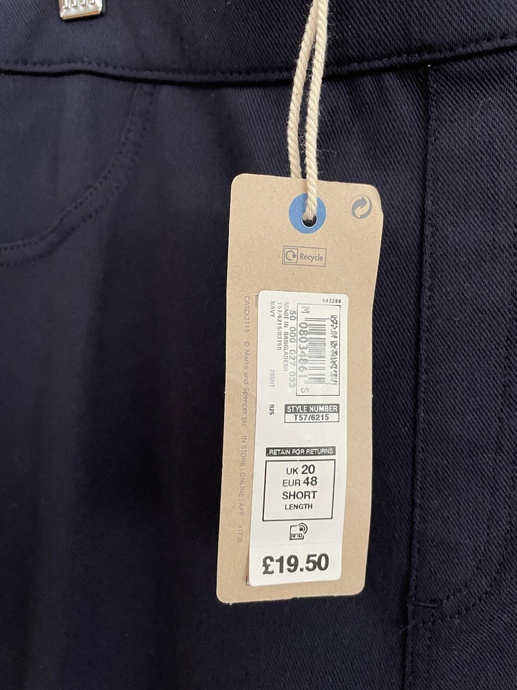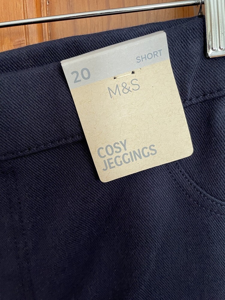 NWT Cosy Jeggings from Marks & Spencers. Size: UK 20 US 16 SHORT Make: M&S Cosy Jeggings Color Navy Blue 37" waist 13" front rise 25.5" inseam 5.5" across bottom of leg opening at hem 41% cotton 31% polyester 10% acrylic 8% viscose Heavier weight leggings with a bit of fleece inside Smoke and pet free home