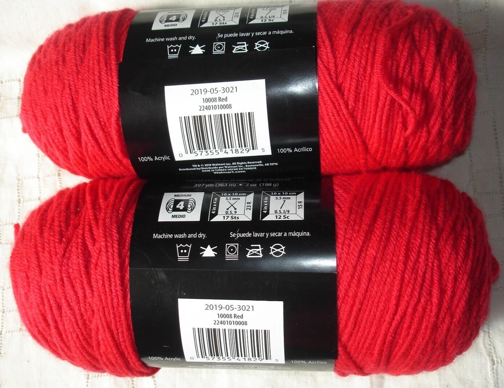 One full skein weighing 7.25 ounces and one skein weighing 6.9 ounces. MAINSTAYS BRIGHT RED 2 Skeins Acrylic Yarn Medium Worsted 7 oz 397 yards MAINSTAYS BRIGHT RED 2 Skeins Acrylic Yarn Medium Worsted 7 oz 397 yards. One full skein weighing 7.25 ounces and one skein weighing 6.9 ounces, 397 yards, 100% acrylic, color Red, same dye lot. Non-smoking environment. Careful packing. Bin M. Buyer to pay USPS ground advantage rate shipping. Payment due within 2 days of purchase.