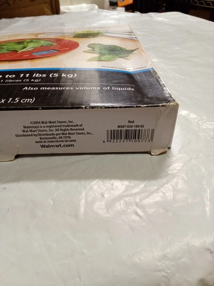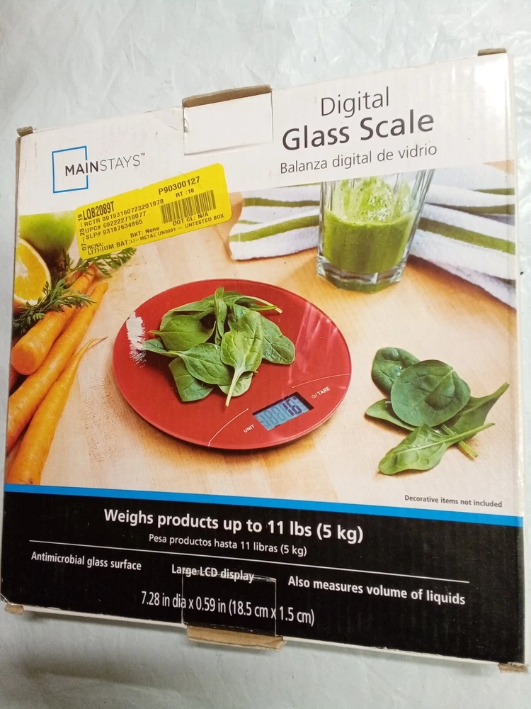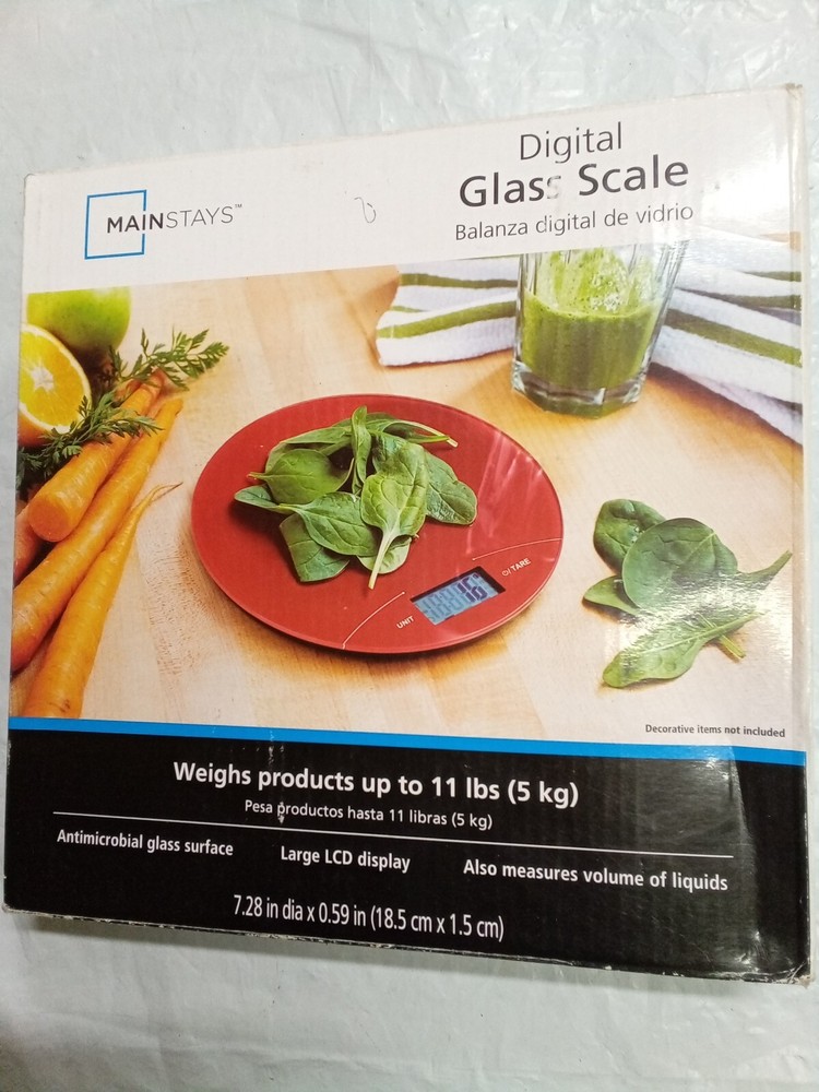 MAINSTAYS Digital Glass Scale (RED). A round scale which help portion food with weight calculation. Item is in good condition and has been tested. Box is in good condition with only one label obstructing one of the front covers. Electronics box 25