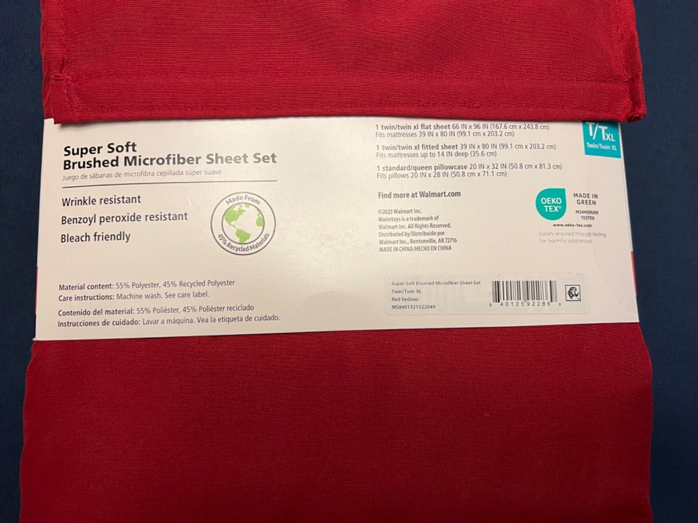 Mainstays Super Soft Sheet Set Brushed Mucrofiber T/TXL New in Package 1 twin/twin xl flat sheet 66x96 1twin/twin xl fitted sheet 39x80 (Fits mattresses up to 14 inch deep) In fabric bag for ex storage 1 standard /queen pillowcase 20x32 Wrinkle resistant Benzoyl Peroxide resistant Bleach friendly 55%poly/45%recycled poly Ground Advantage or Priority Mailing