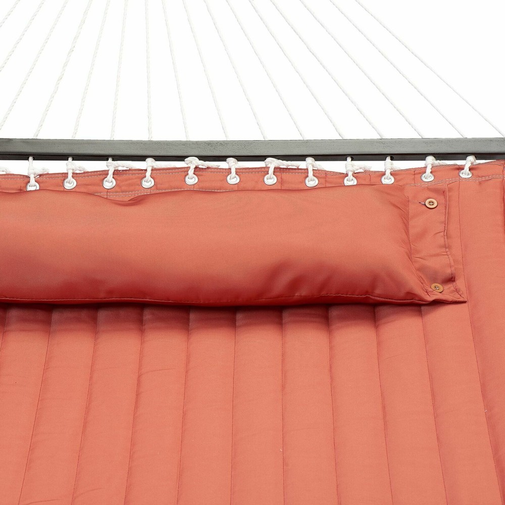 *SALES TAX NOW CHARGED ON ALL ORDERS!* ITEM IS NEW IN OPEN & DISTRESSED PACKAGING! ITEM IS PERFECT! Relax with a friend in the Mainstays Terracotta Quilted Double Hammock with Pillow. Sized to comfortably hold two adults, you can set up this hammock just about anywhere: in your backyard, on the deck, or under your favorite tree. This full-size hammock comes complete with a matching bolster pillow so you have a comfortable place to relax, read, or nap outdoors. Made from a durable polyester in a pretty orange red color, the Mainstays Terracotta Quilted Double Hammock with Pillow has durable rope construction, macrame clewed ends, and strong hardwood spreader bars that make it easier to get in and out. Quilted hammock with bolster pillow holds two adults Comfortable hammock is perfect for outdoor relaxation and fun Includes matching pillow to cradle your head for total relaxation Pillow can be buttoned into place or removed for easy cleaning Made from durable, quilted polyester fabric in terracotta Ropes with macrame clewed ends securely connect to spreader bars Heavy-duty spreader bars are made from durable hardwood Hammock measures 55" long and 135" wide to comfortably hold two adults Hang in backyards, decks, patios, porches, and more Some assembly needed Holds up to 445 lb. Includes 2 chains and 2 S-hooks for easy hanging Imported 8-TD 21B J
