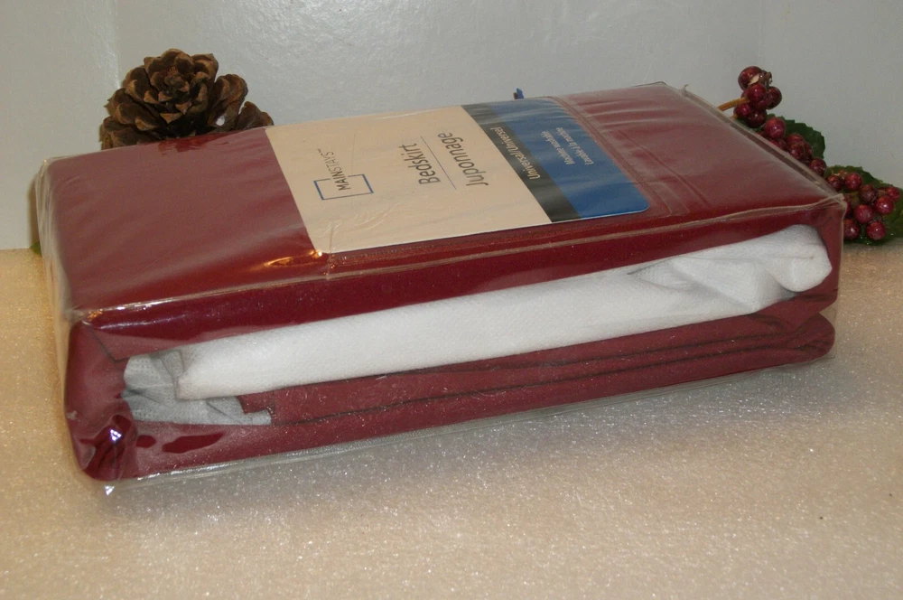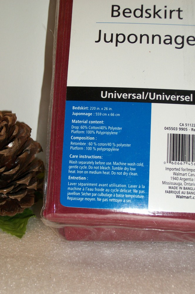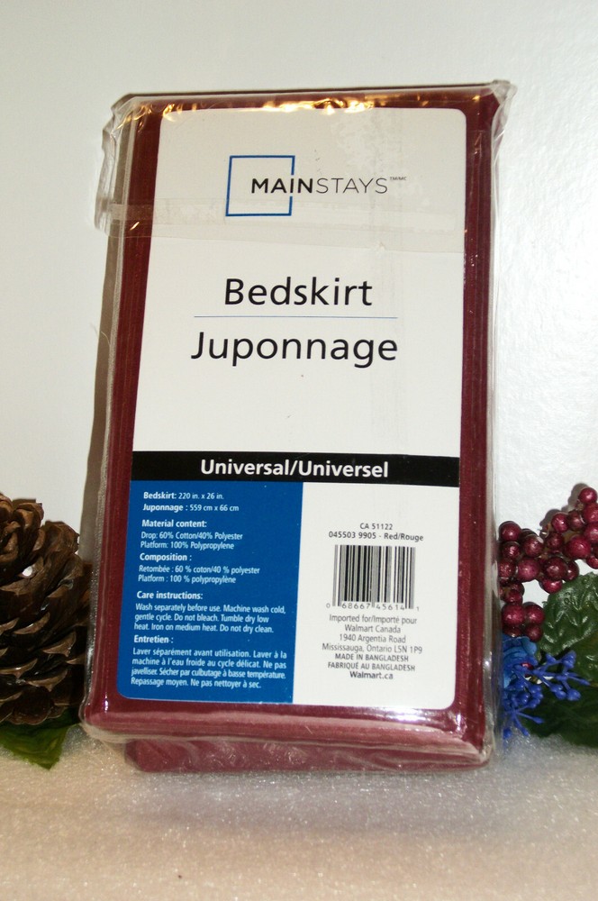 NEW IN PACKAGE! MAINSTAYS UNIVERSAL BED SKIRT COLOR: DARK CRANBERRY "RED" 60% COTTON & 40% POLYESTER 220" X 26" MACHINE WASHABLE! CHECK OUT THE GREAT DEALS IN OUR EBAY STORE! ~ NANTAHALA FOREST TREASURES ~ * * * * * * * Payment and Shipping Information: *USPS First Class or USPS Priority for light packages. USPS Ground or FEDEX for heavier items. USPS to international locations. * We normally ship within 1 Business day. * * * * * * * Return Policy: Returns accepted. Please notify us within 3 days of receipt of the item. The item must be returned in the same condition as when shipped. No Smoke, Pet Hair, Powder, etc....... please! If the item is damaged or not as described, we pay return shipping. If item is returned because it does not fit, or you just don't want it for whatever reason, buyer is responsible for postage. If there is a problem, please contact us before leaving neutral or negative feedback. Customer satisfaction is of the utmost importance to us. * * * * * * * NANTAHALA FOREST TREASURES - QUALITY ITEMS at UNBEATABLE prices!!! * * * * * * *
