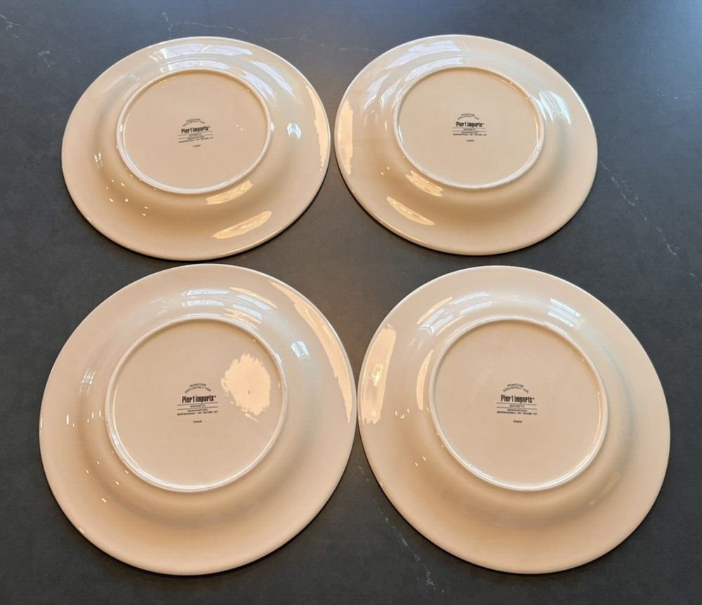 This set of four Pier 1 Maribeth dinner plates features a vibrant red floral pattern on a round ironstone plate. The plates are 11 inches in size, suitable for all occasions, and dishwasher safe for easy cleaning. These contemporary-style plates have a glossy finish and are part of the original production line by Pier 1. Perfect for adding a touch of floral elegance to your dining table, these dinner plates are a stylish and practical addition to your serveware collection. Personal collection - only used a few times.