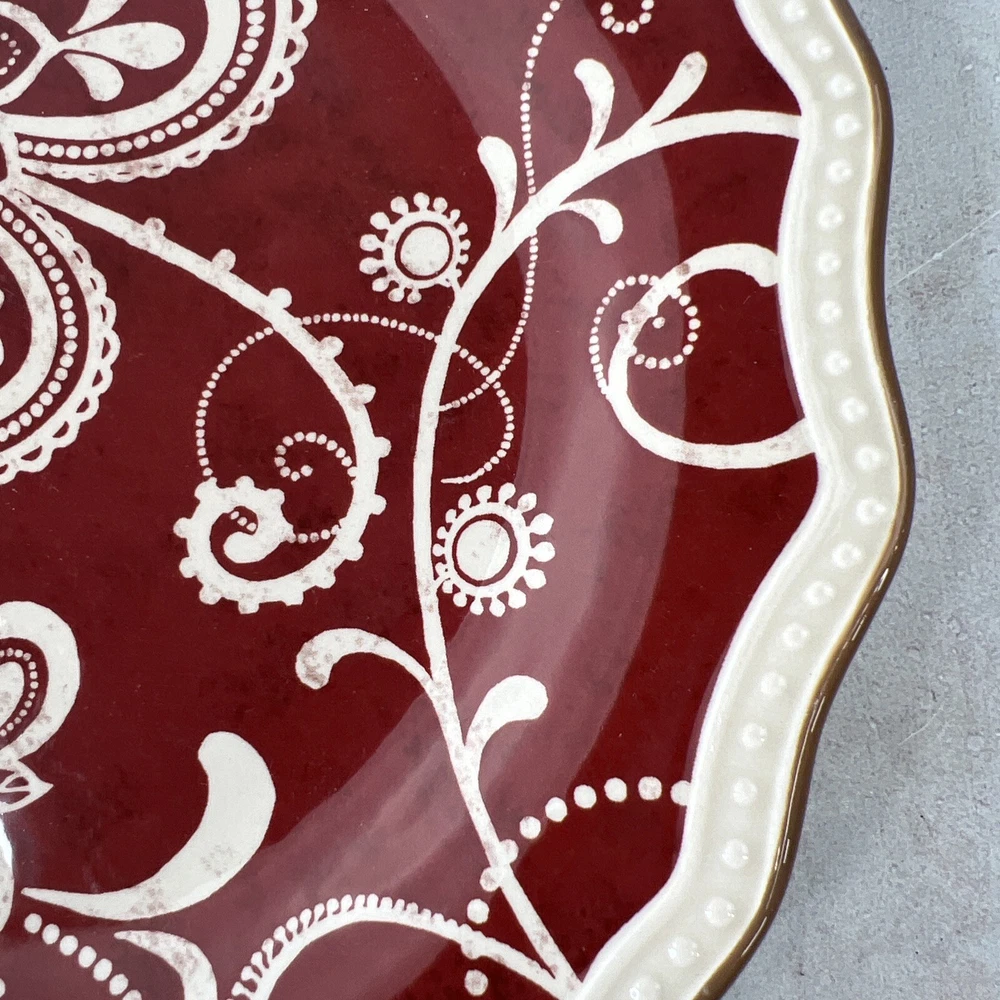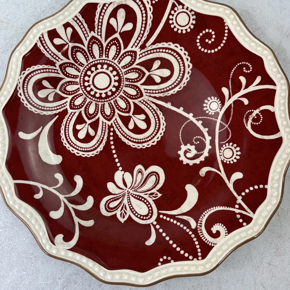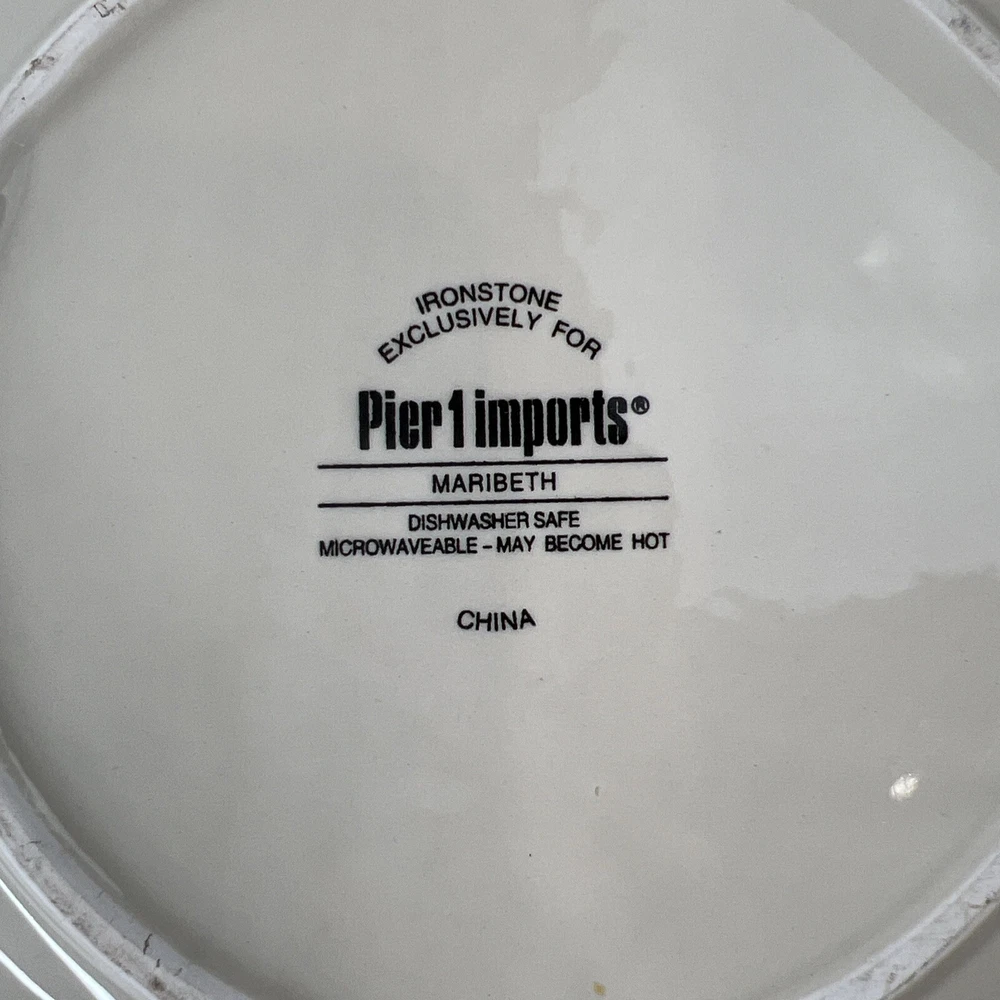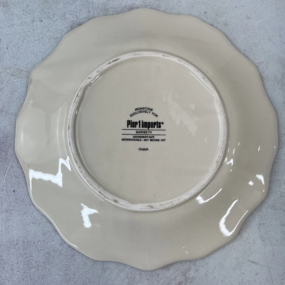 Add a touch of elegance to your table setting with this MARIBETH Pier 1 Imports salad plate. The round plate features a beautiful floral pattern in red color that is perfect for all occasions. Made of durable ironstone material, this plate has a glossy finish and is microwave and dishwasher safe for easy cleaning. The 8 7/8" salad plate is part of the MARIBETH product line and is an original piece of contemporary art pottery. It comes from China and has a printed backstamp. This plate is a single item in a set and is perfect for adults who appreciate decorative and functional serveware. Care instructions include machine washing up to 100°F. Don't miss out on adding this unique and beautiful plate to your collection.