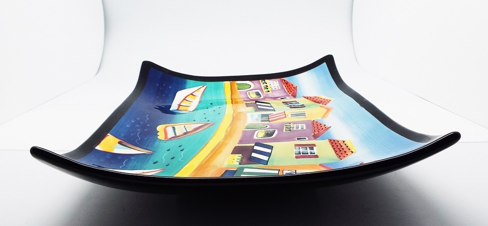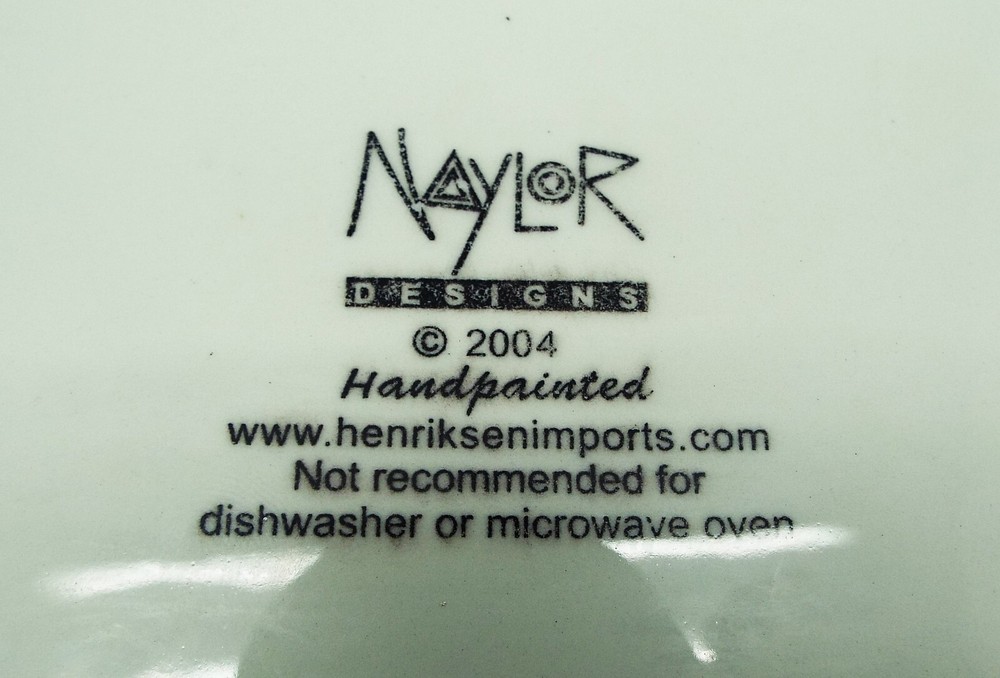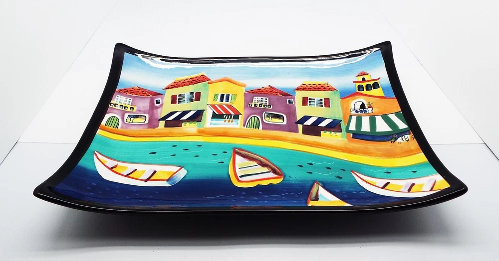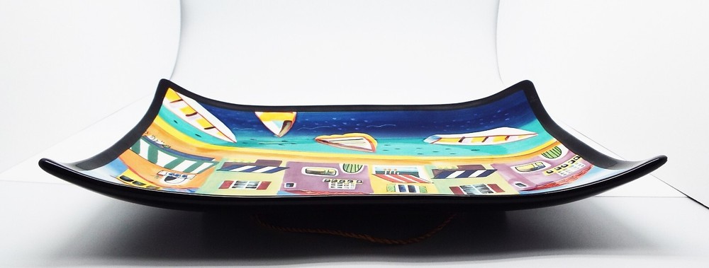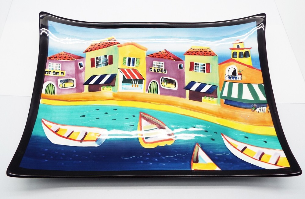 MARY NAYLOR NAYLOR DESIGN HENRIKSEN IMPORTS HAND PAINTED DECORATIVE PLATE WALL HANGING STORED IN AIR-CONDITIONED PET FREE SMOKE FREE ENVIRONMENT Up for your consideration is a very Rare find. Perfect item to hang in your home. Its a low footed Plate bowl with rim as it's base. Hand Painted Boats and Bungalows motif for the interior or exterior of your home. Vibrant colors are sure to catch everyone attention. Measures 14 Wide Across x 9.5 Tall and 1.5 in tall it is quite heavy. All pottery ware is wrapped in tissue then bubble wrap. It's then double boxed and packed with either peanuts paper or bubble wrap to assure that it arrives in pristine condition. String attached ready to hang! Please ask any questions prior to ordering.