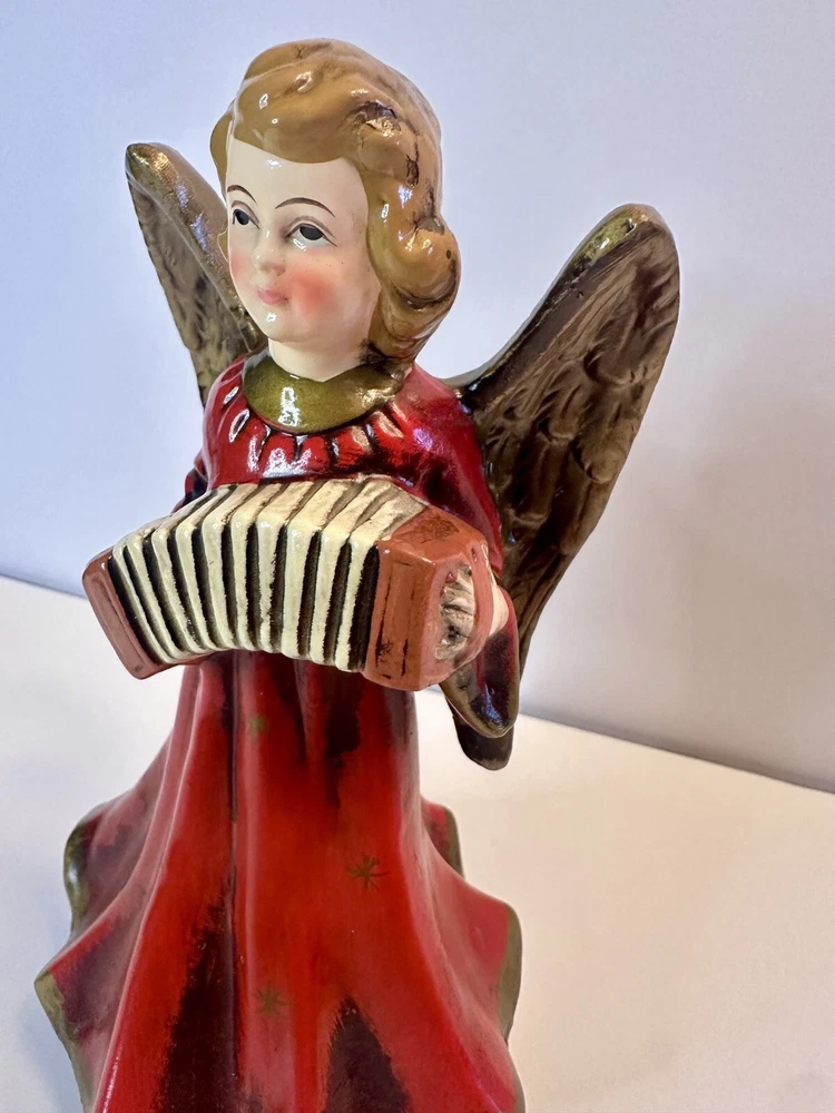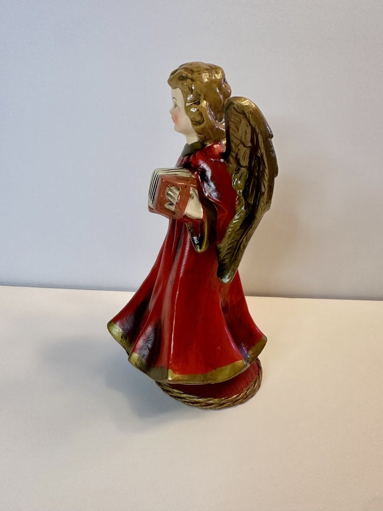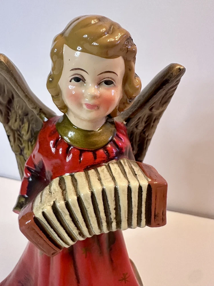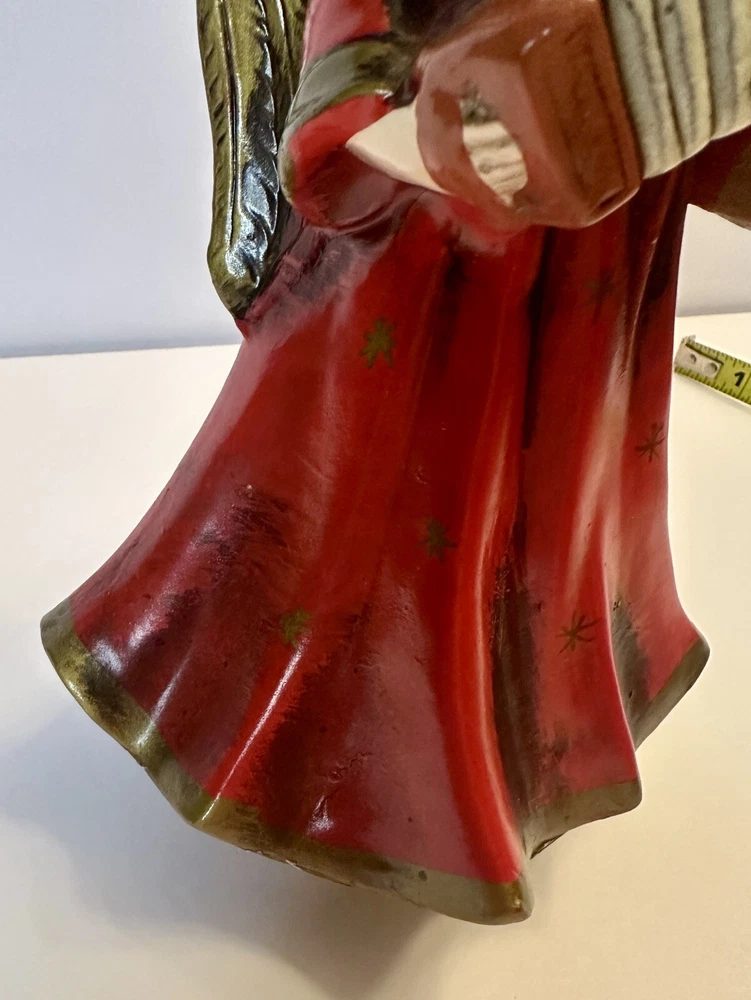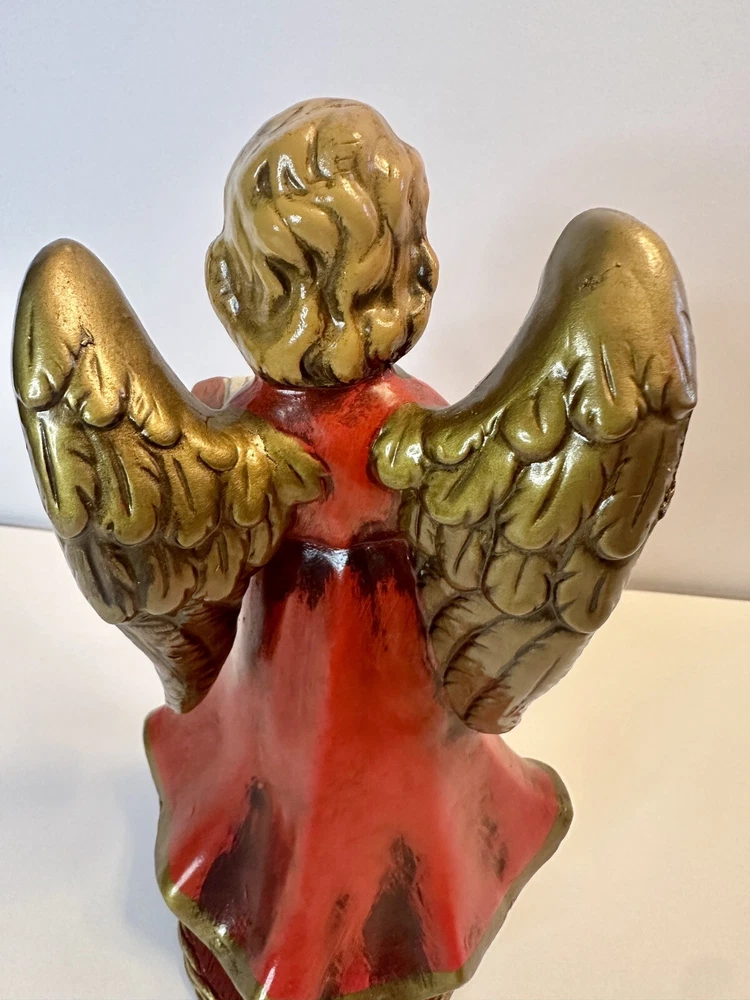 This vintage MCM Christmas angel is a beautiful and unique addition to any holiday decor. It features a traditional design with gold stars and a red and gold finish. Measuring 8 inches in height and 4.75 inches in width, this medium-sized figurine is a perfect fit for any room in your home, including the study, entryway, foyer, bathroom, kitchen, basement, living room, lounge, den, or dining room. This musical angel is part of the A Santa Creation collection and is an original piece from the 1950s. It comes in immaculate condition for its time period and has no chip or break and comes unboxed. The care instructions recommend cleaning it with a damp cloth. This figurine is perfect for anyone who loves music, angels, religion, or seasonal decorations. Add it to your collection today and enjoy its silent night and Christmas theme. This piece does not play music