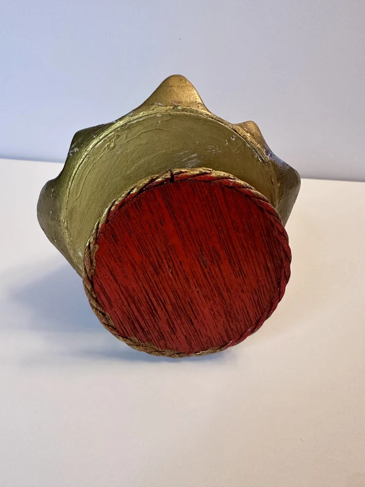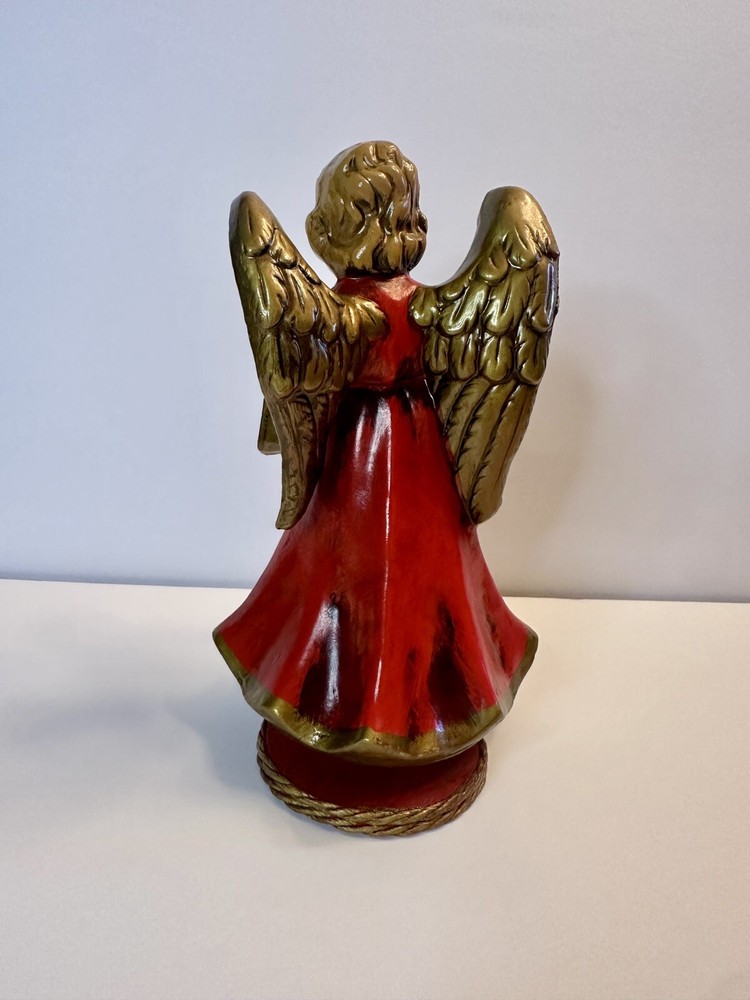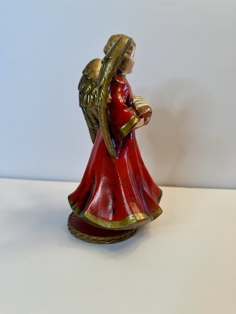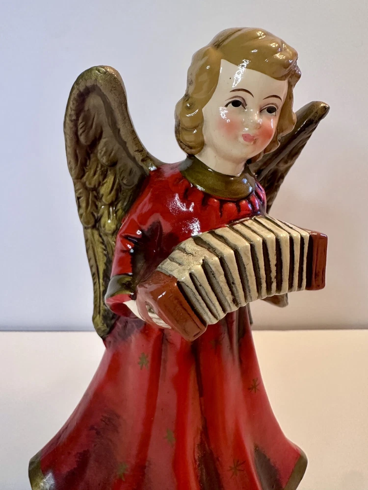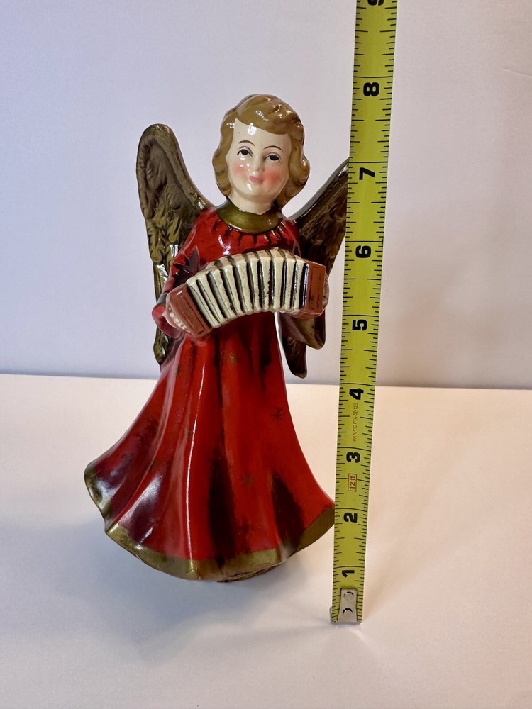 This vintage MCM Christmas angel is a beautiful and unique addition to any holiday decor. It features a traditional design with gold stars and a red and gold finish. Measuring 8 inches in height and 4.75 inches in width, this medium-sized figurine is a perfect fit for any room in your home, including the study, entryway, foyer, bathroom, kitchen, basement, living room, lounge, den, or dining room. This musical angel is part of the A Santa Creation collection and is an original piece from the 1950s. It comes in immaculate condition for its time period and has no chip or break and comes unboxed. The care instructions recommend cleaning it with a damp cloth. This figurine is perfect for anyone who loves music, angels, religion, or seasonal decorations. Add it to your collection today and enjoy its silent night and Christmas theme. This piece does not play music