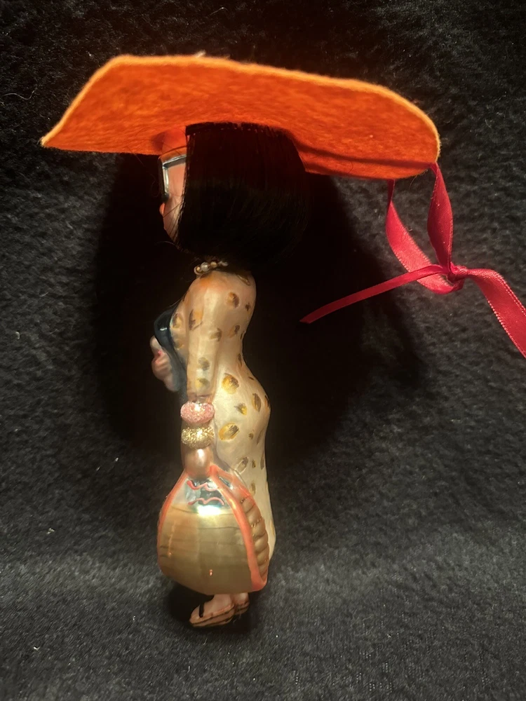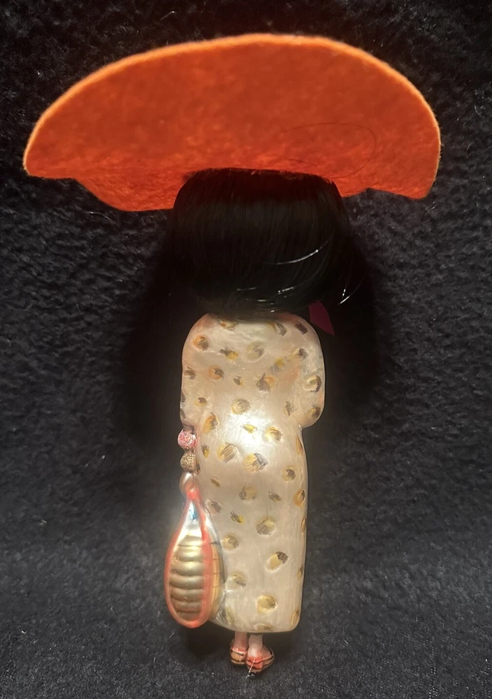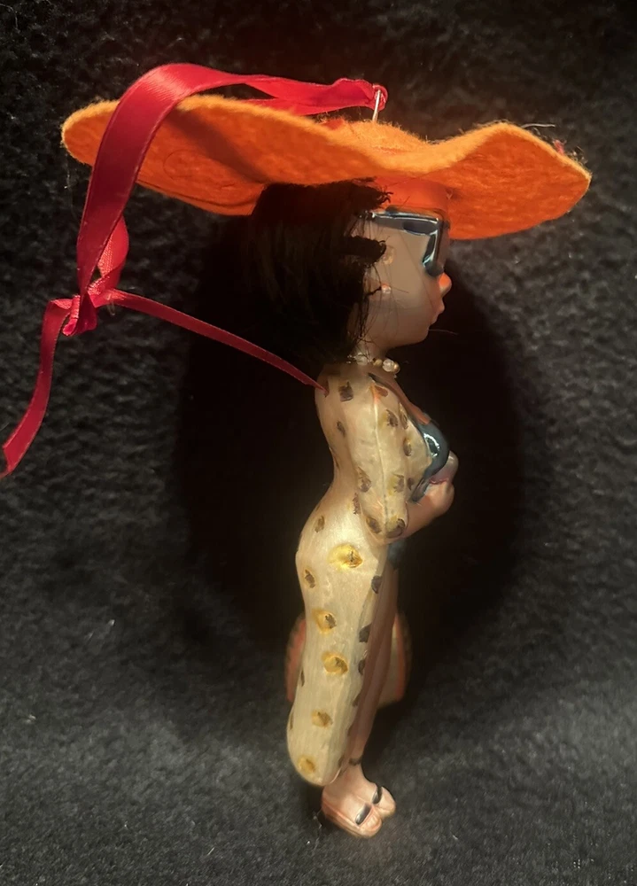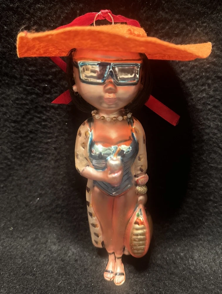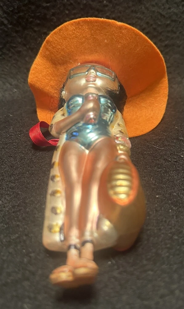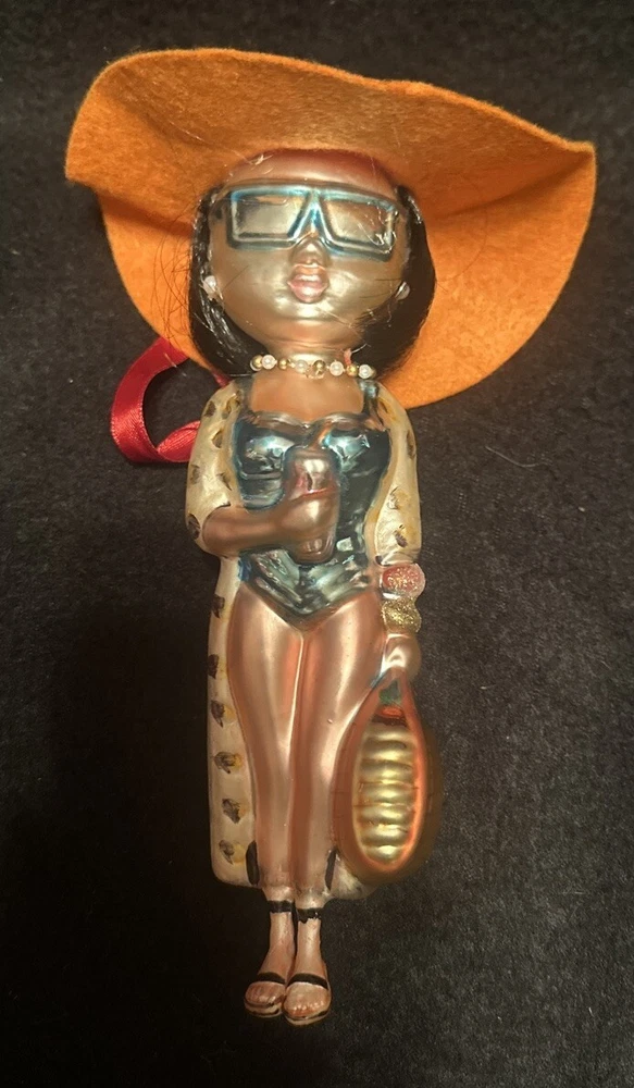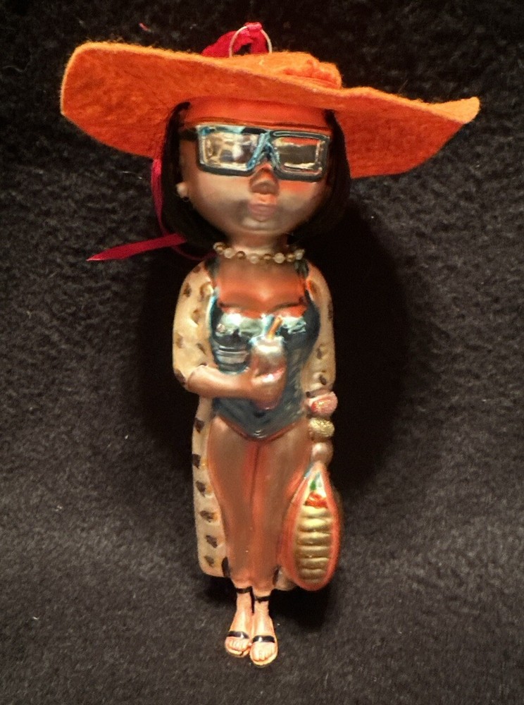 Add a touch of beachy vibes to your Christmas tree with this beautiful Pier 1 Imports glass ornament. The Camila Beach ornament features an oversized orange felt hat, black bobbed hair cut and of course she is decked out in all her jewelry and accessories fully prepared for a day in the sun! This design is perfect for the holiday and beach lover season. Measuring 7 inches in height, it comes with hanging capability and is artist designed for a decorative touch. Not just for Christmas, this ornament can be displayed all year round as a part of your beach-themed decor. Made of high-quality glass and manufactured in China, this ornament is in mint condition and a must-have for collectors.