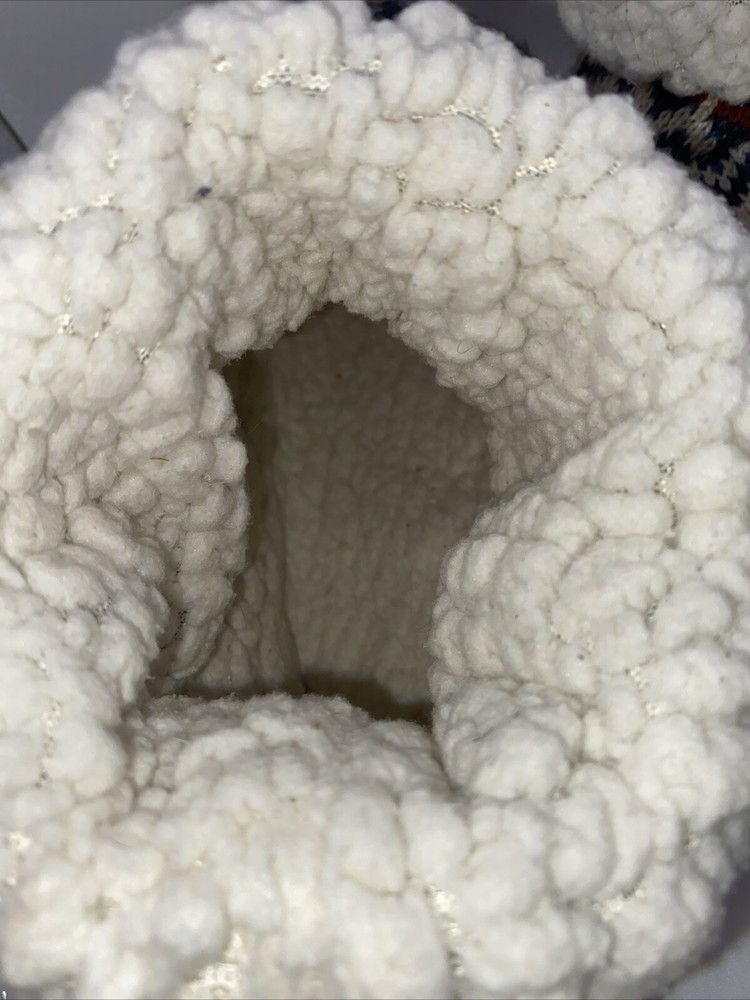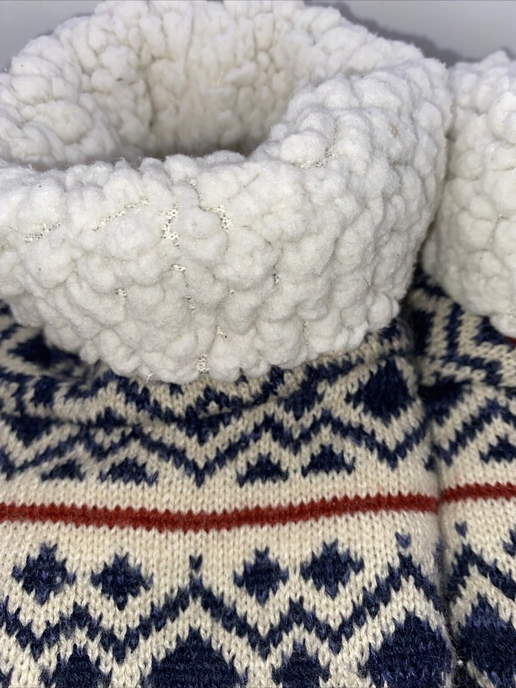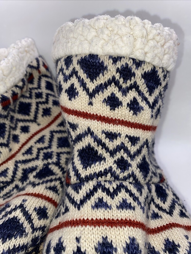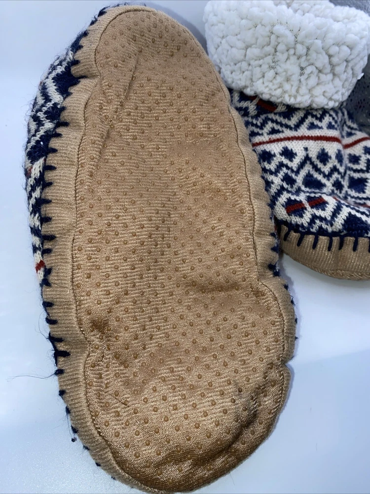Stay cozy and stylish with these Muk-Luk Bootie Slippers. The navy blue, red, and cream color combination gives a playful yet elegant look. The faux fur lining and upper material provide warmth and comfort, while the rubber bottom ensures durability. These slippers feature a pull-on closure, fold-over design, and are made with a blended fabric type. The chevron pattern and faux fur cuff add a touch of elegance to the overall look. Perfect for women who want to stay comfortable, warm and fashionable at home.