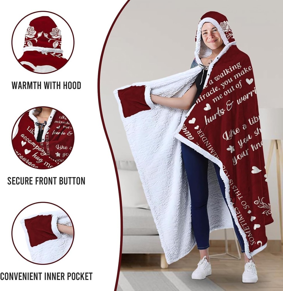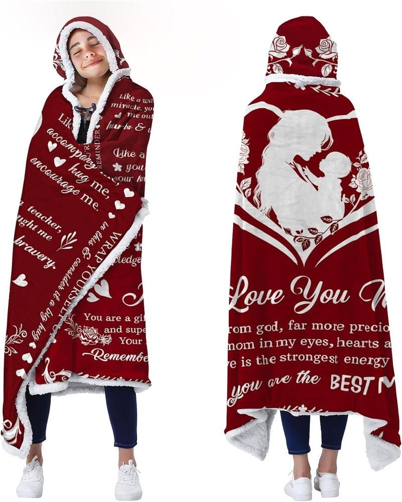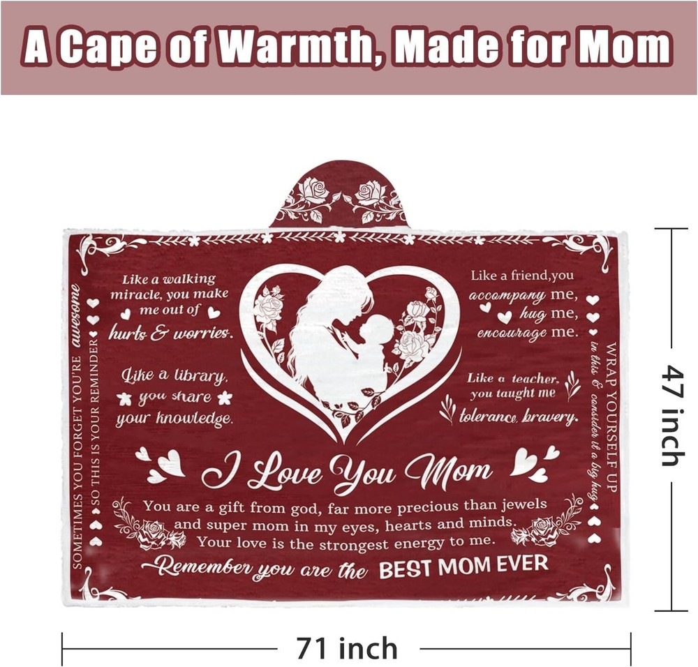 This cozy fleece blanket hoodie is the perfect gift for mom—super soft, warm, and extra thoughtful with the sweet "I Love You Mom" print. The generous size wraps her in comfort, and it’s so easy to care for—just toss it in the wash! She’ll love snuggling up in this plush, heartfelt keepsake.