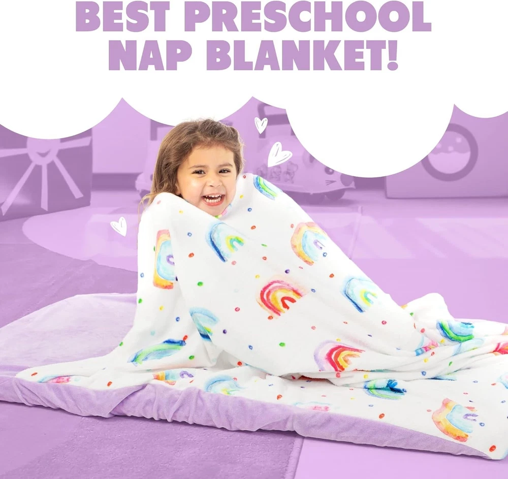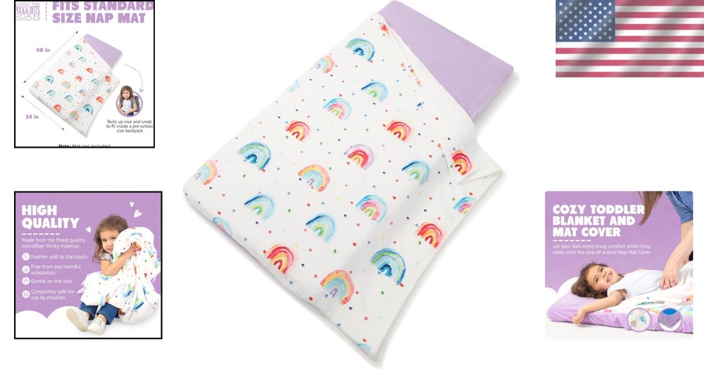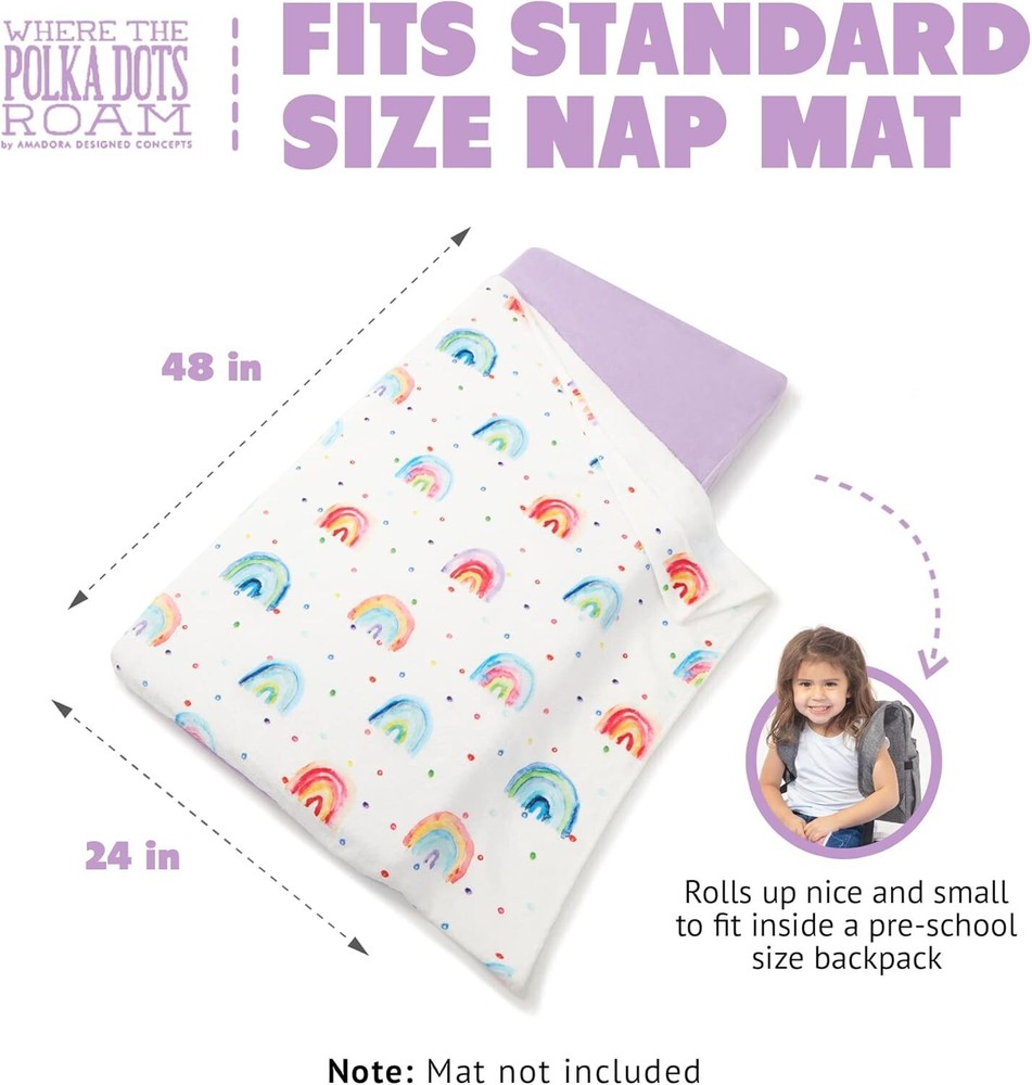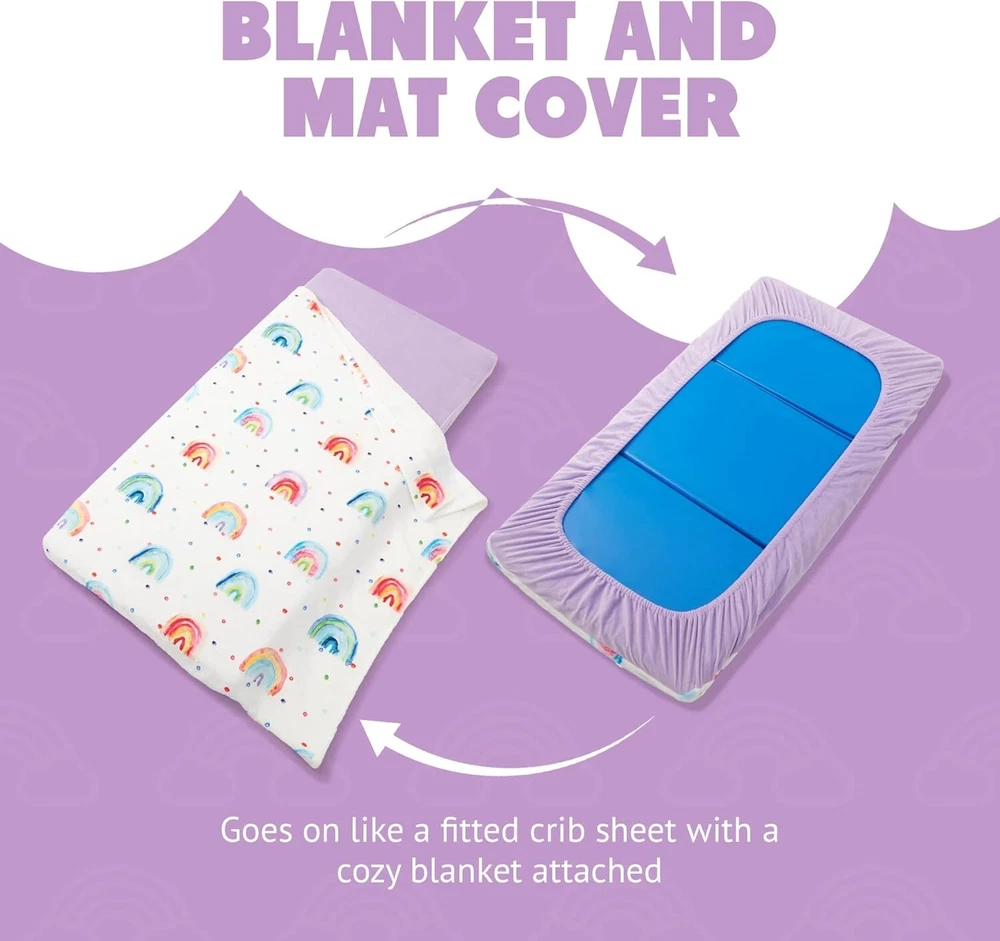 This nap mat cover is a game-changer! The rainbow design is adorable, and my toddler loves how soft and cozy it is. It fits perfectly on standard mats and stays snug thanks to the fitted sheet style. Washing it is a breeze—just toss it in the machine, and it comes out looking fresh. The attached blanket is a nice touch, and it rolls up compactly for easy storage. Perfect for daycare or preschool!