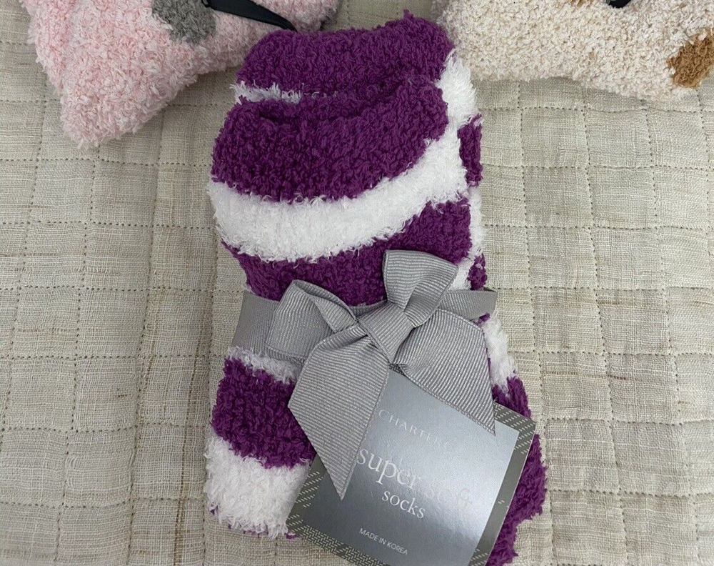 Macy's Purple White Stripe Winter Cozy Fuzzy Socks Microfiber Soft Touch, Super Comfy~