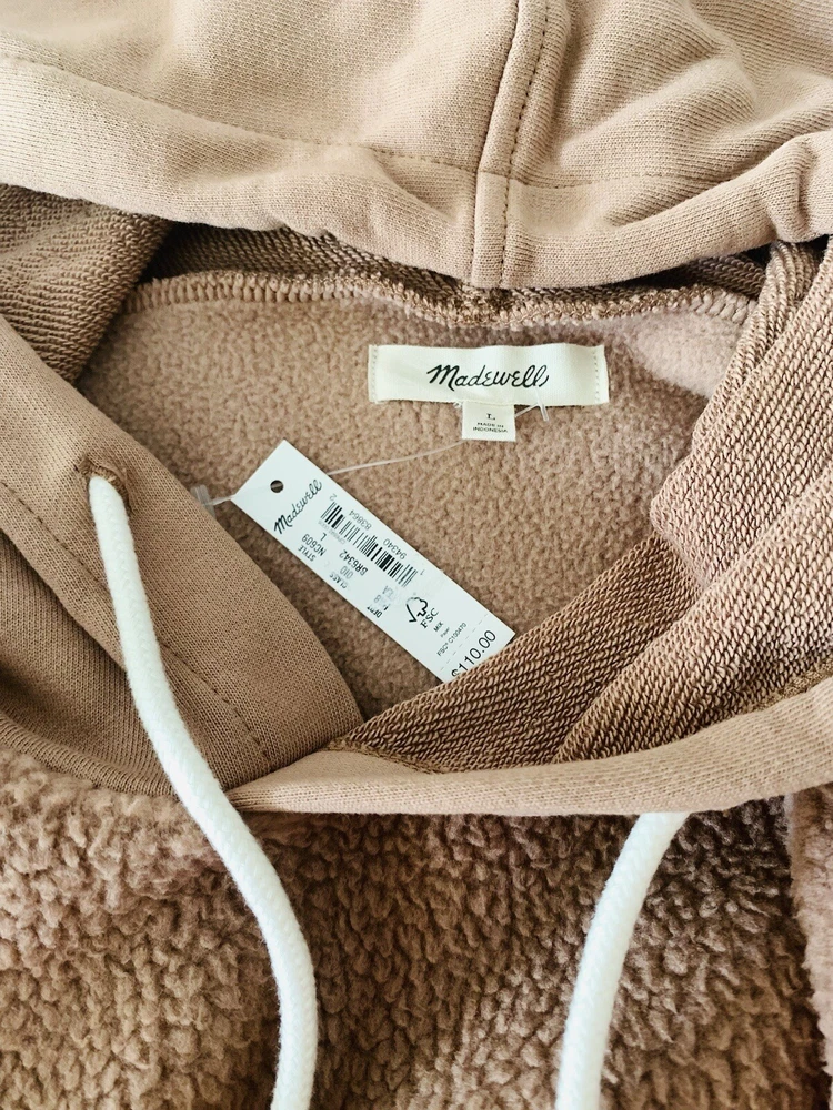 Elevate your wardrobe with this Madewell teddy hooded sweatshirt for women. The balloon long sleeves and kangaroo pockets add a playful touch to this tan pullover, making it a perfect addition to any casual outfit. The size is a regular fit, with a size L available, and the hood adds extra warmth for those chilly days. This sweatshirt features a Madewell brand tag. In excellent condition. No visible flaw. Approx measurements: Chest: 24 in Length: 27 in Offers welcome! Tags: cabincore, Grandmacore, neutral, minimalist,