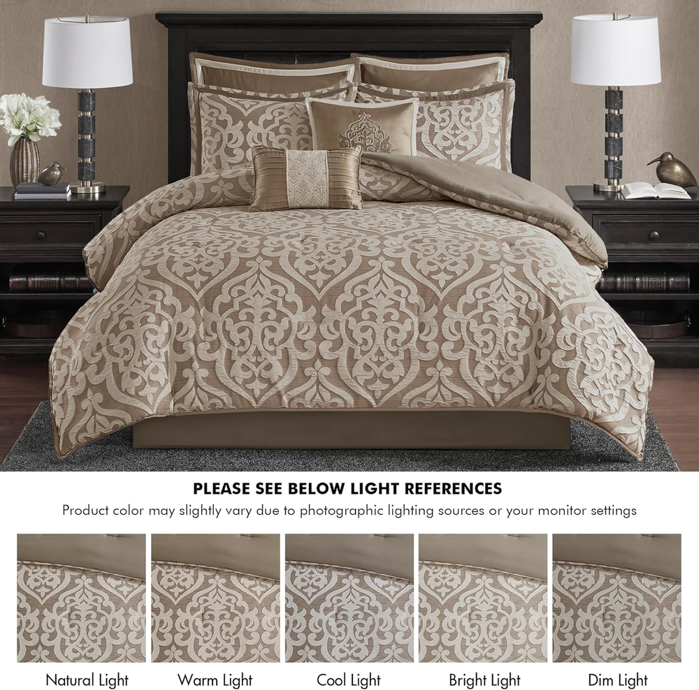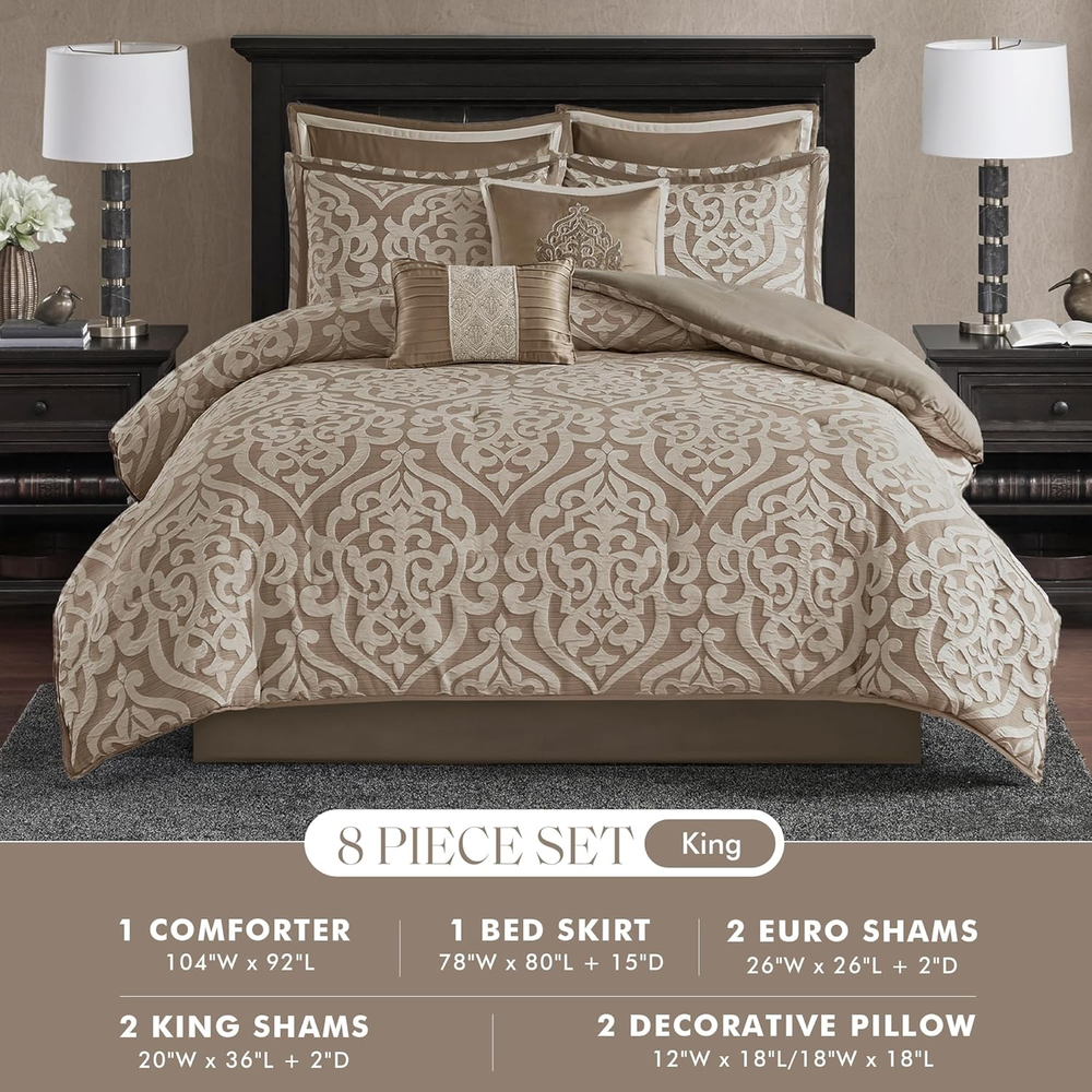 Absolutely in love with this comforter set! The damask medallion design adds a touch of elegance, and the fabric is soft yet durable. The king size fits perfectly, and the eight-piece set includes everything for a coordinated look—great value for the price. The down-alternative fill keeps me cozy without overheating, making it perfect for all seasons. The tan color is versatile and blends beautifully with any decor. Highly recommend for anyone wanting luxurious style and comfort!