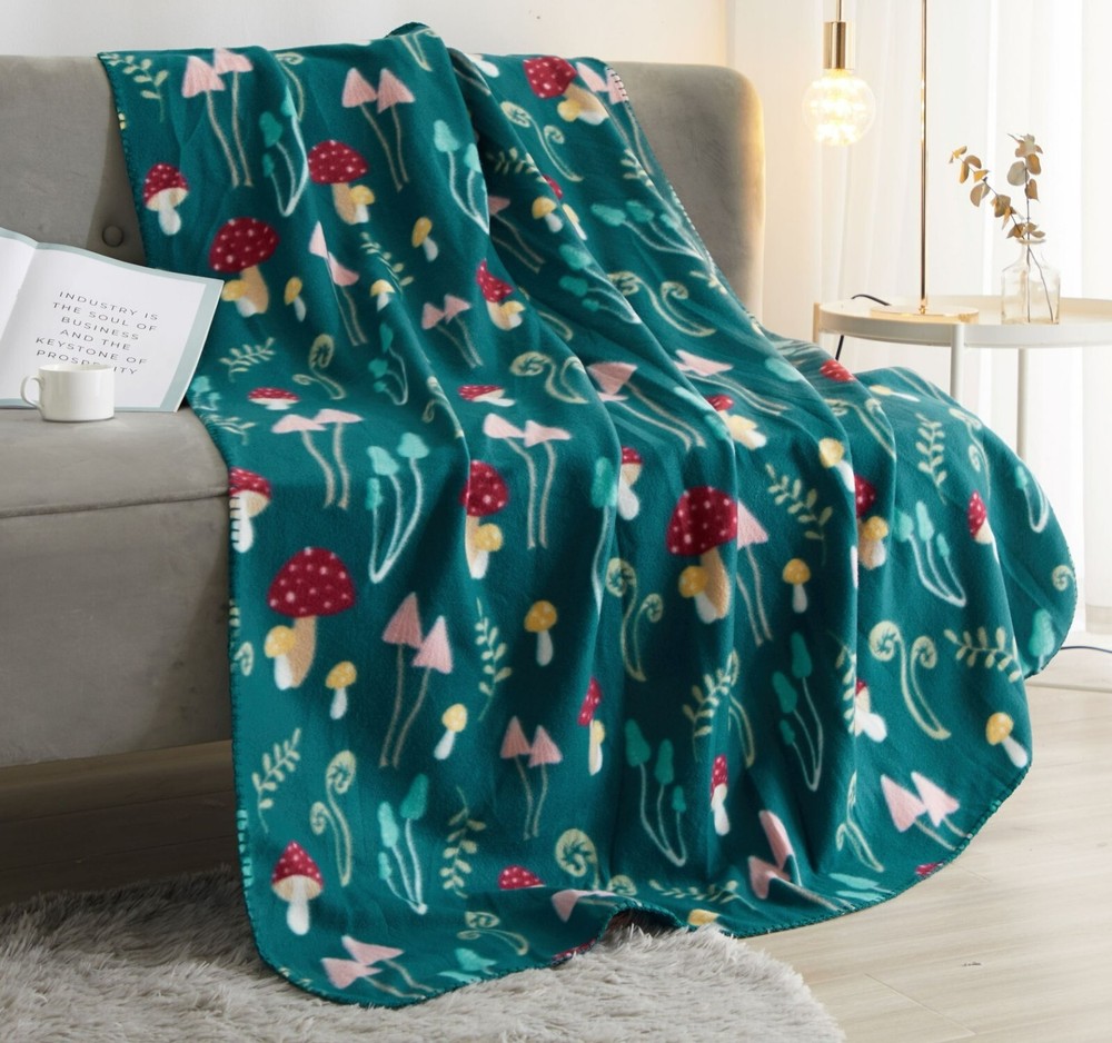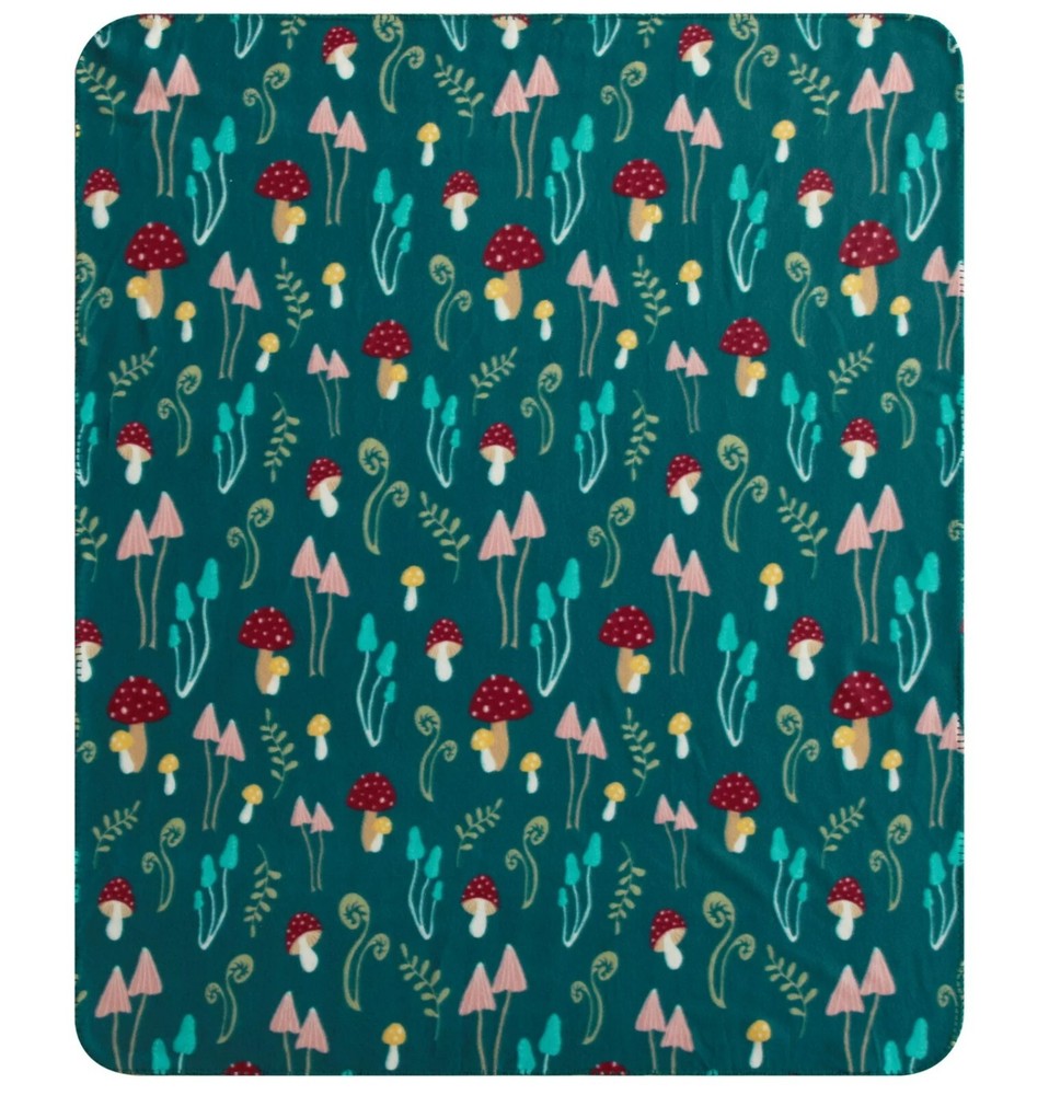 Amanita muscaria Mushrooms Fleece Throw Blanket ~ Fairy Cottagecore Magic Fiddlehead Ferns 50” x 60” - Teal or Blue Green Teal or blue-green background with various mushrooms, including Amanita muscaria (Red mushroom with white spots also known as the fly agaric or fly amanita), Mycenaceae, Fiddlehead ferns and other mushrooms and ferns. 50" x 60" Sustainably made with 70% recycled polyester content Blanket stitch edge Great as a throw or for craft fabric Great for a nature theme room, or a Fairy Garden or Magical theme New Great items, quick shipping at East Lane Ave .
