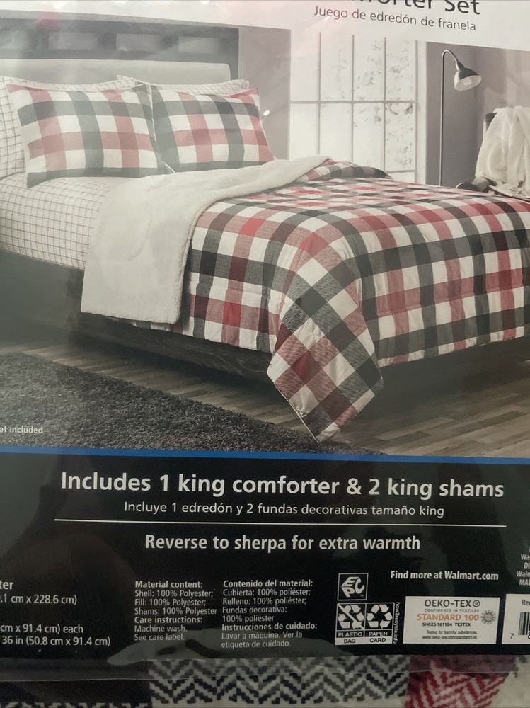 Transform your bedroom into a cozy oasis with this Mainstay Red Plaid King Size Comforter set. The set includes a comforter and two king pillow shams, both made of flannel with a Sherpa reverse side for extra warmth. The plaid pattern in red, black, and white is perfect for a rustic theme. This set is not just stylish but also practical, as it is machine washable for easy maintenance. The set includes three pieces, and the comforter measures 102 inches by 90 inches while the pillow shams measure 20 inches by 36 inches each. Add this Mainstay comforter set to your cart and enjoy a warm and inviting atmosphere every night.