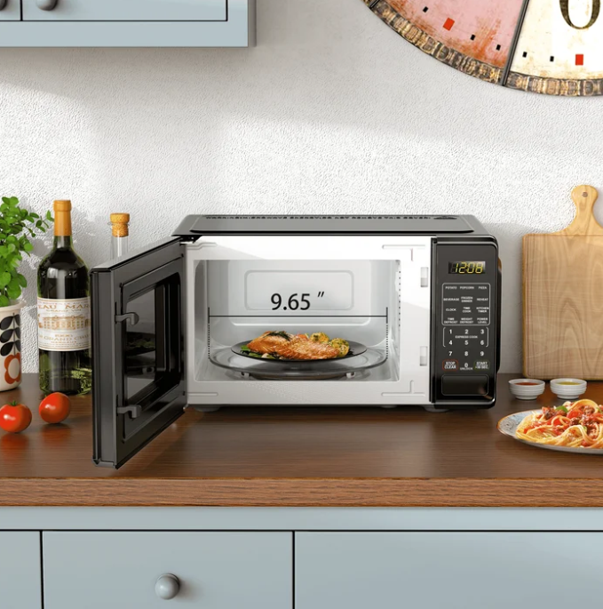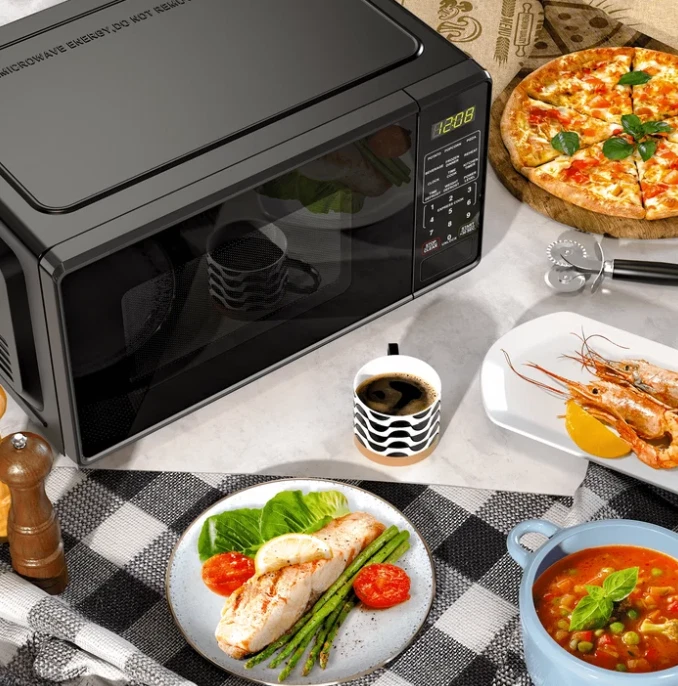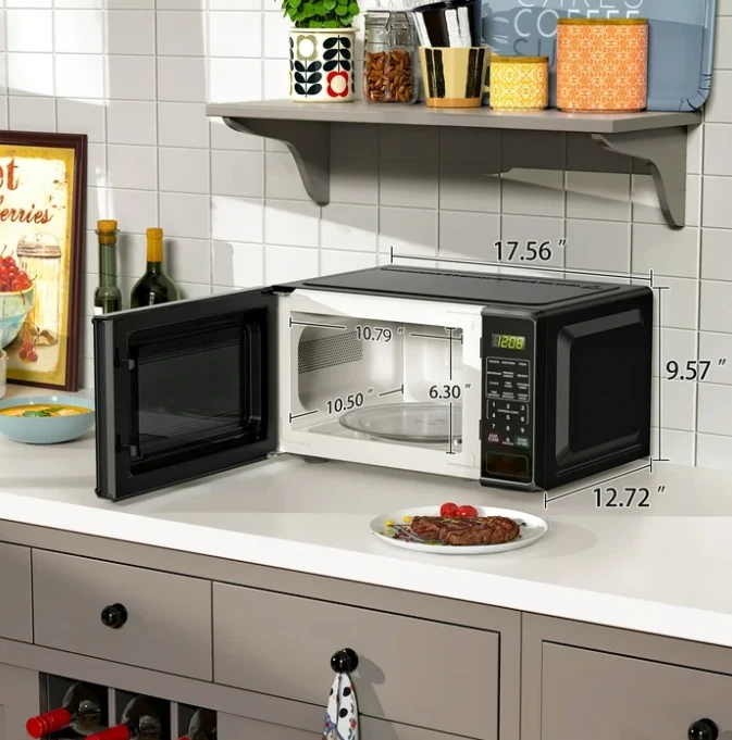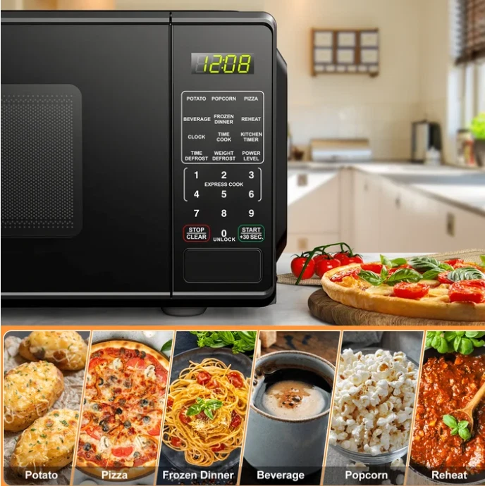 perfect compact microwave for small spaces! It heats food quickly and evenly, and the multiple power levels give great control. The quick-set buttons are super handy, and the child safety lock adds peace of mind. Sleek design fits well in any kitchen or dorm. Love the LED display and easy-to-use push-button door. Great value for the price!